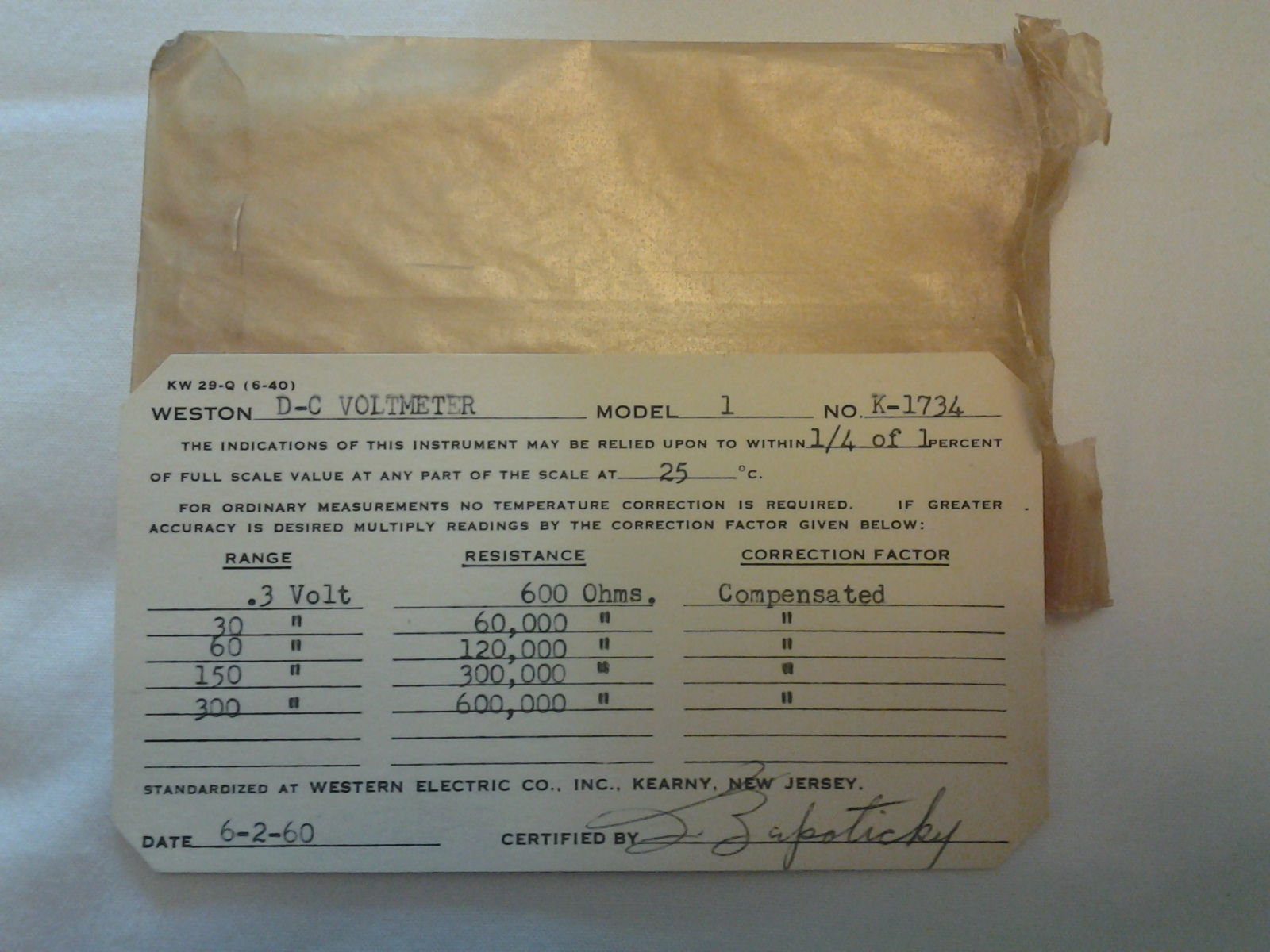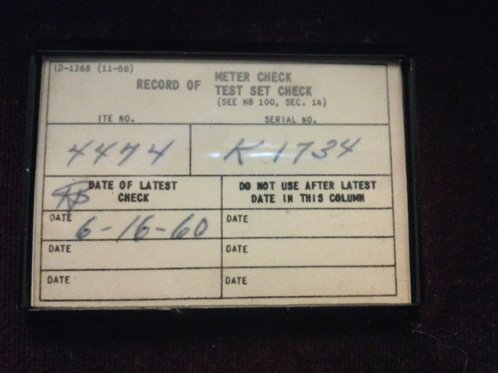 Record of Meter Check Card with Initials of the inspector and the date of 6/16/60