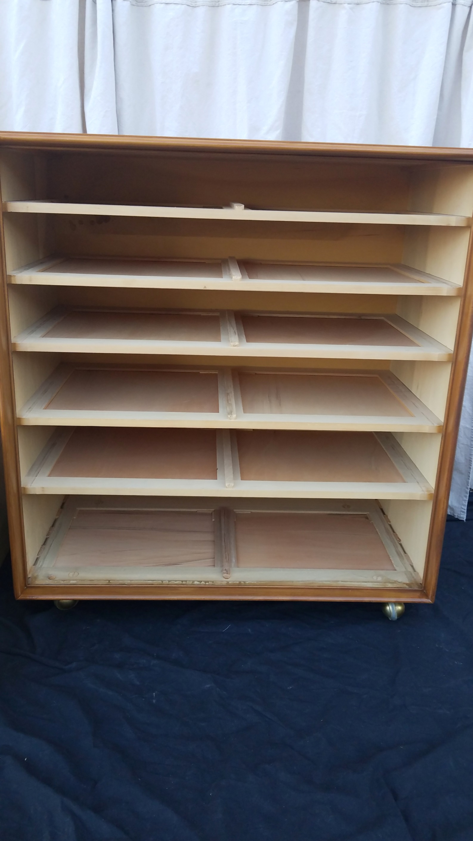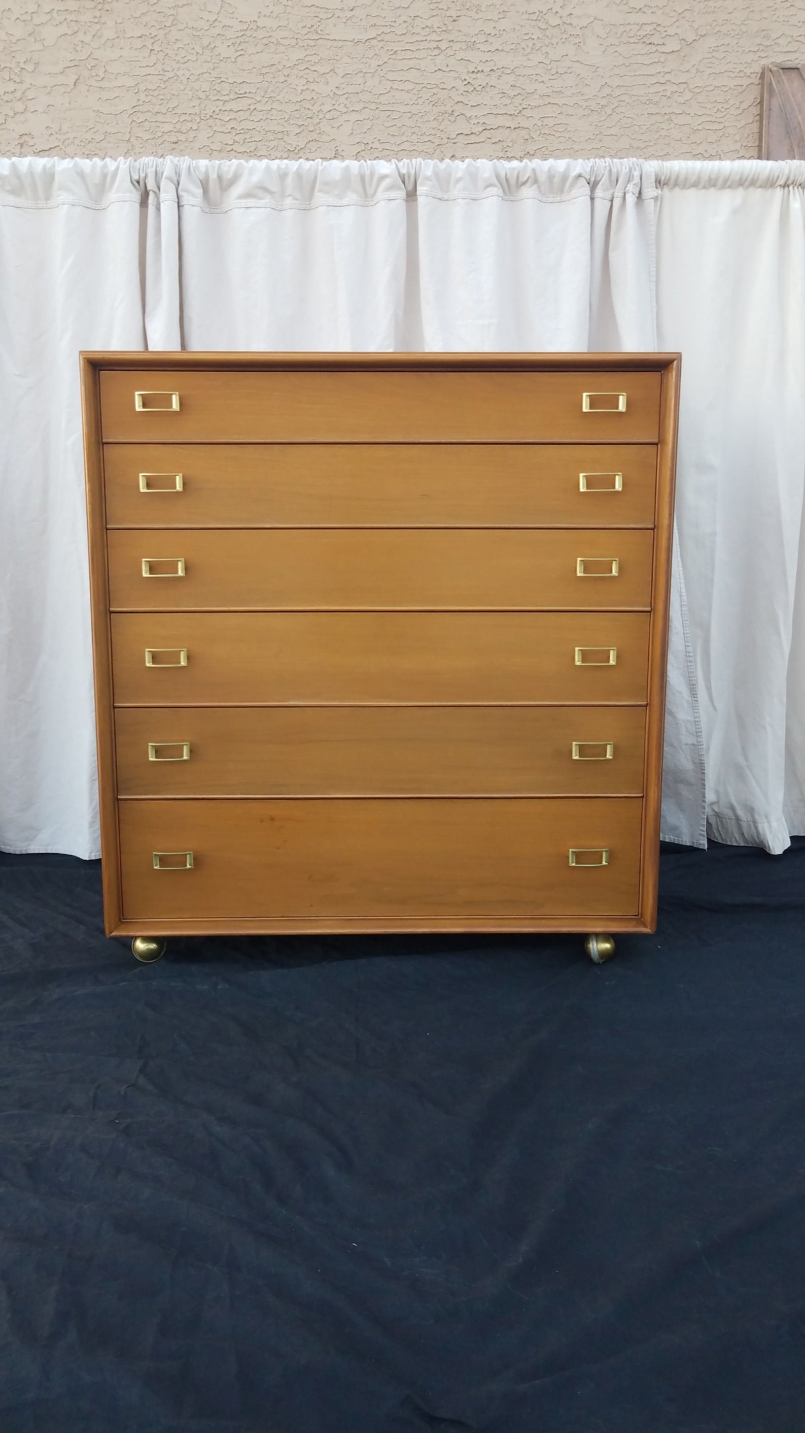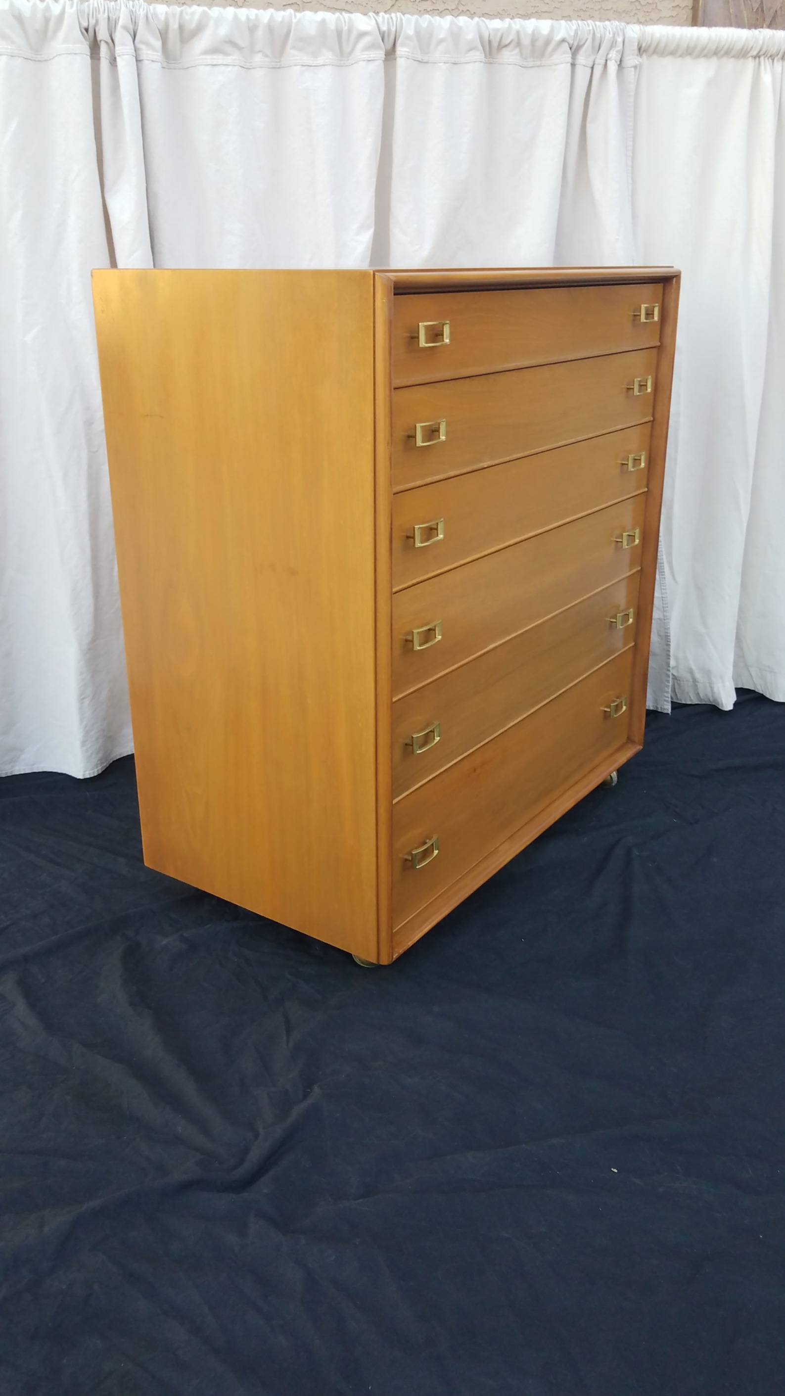 In beautiful condition, clean well cared for, has 7 drawers and solid brass handles. The back is numbered and each drawer has the corresponding number along with the drawer number engraved. It sits on large brass 360 degree swivel wheels. The only restoration work needed was a light scuff and shellac topcoat reapplied. Finish was just beginning to look dry and flaking a bit. Acquired at an estate sale along with the matching long dresser, mirror and nightstand. Looking for an accurate value not a 1st dibs value. Thanks for your help