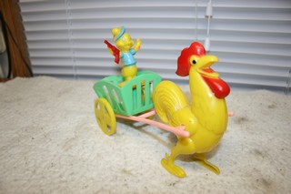 Rooster pulling a rolling cart w/Pistol toting Duck standing in the cart. Has just 1 Pistol instead of 2 in the Ducks hands. Duck wearing a blue/yellow Sombrero style hat. Red Pistol. Blue shirt.