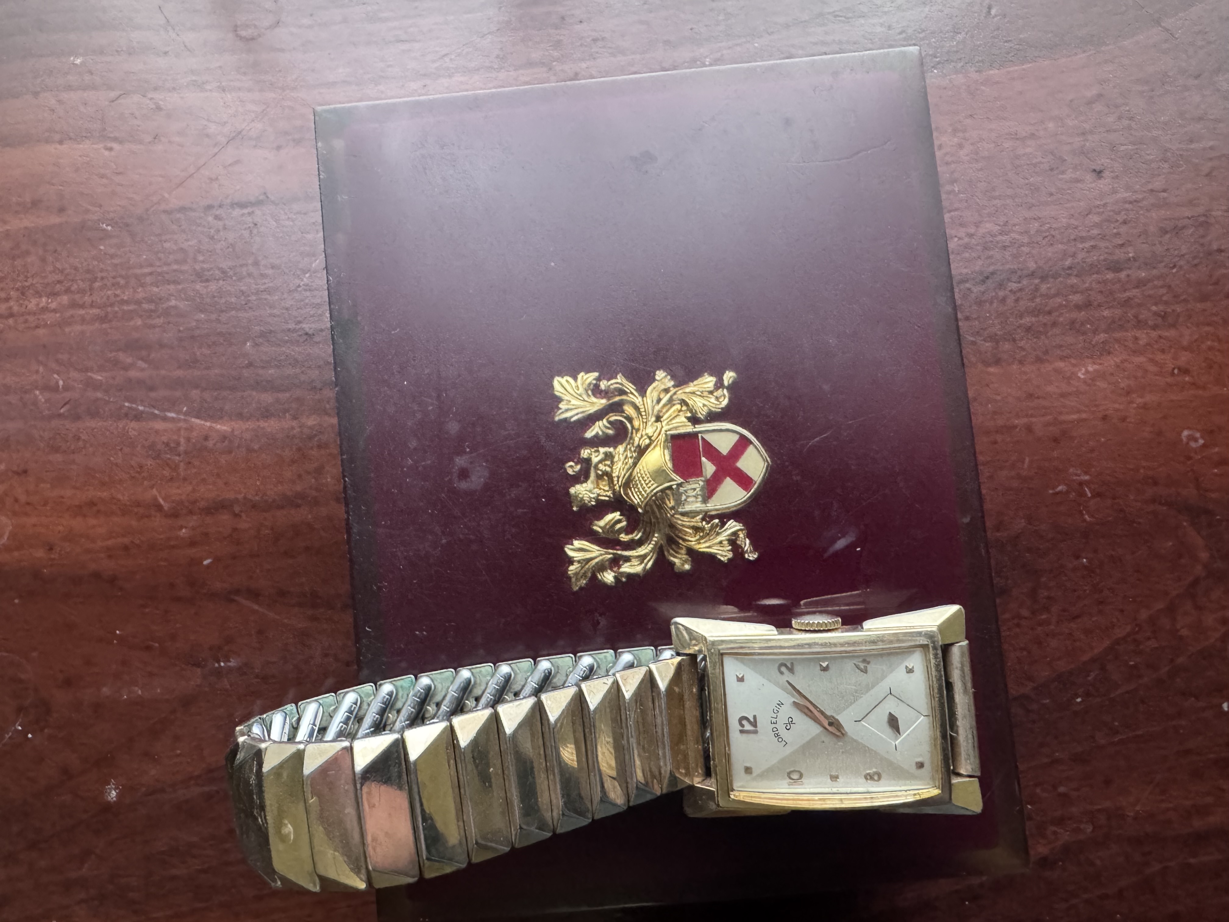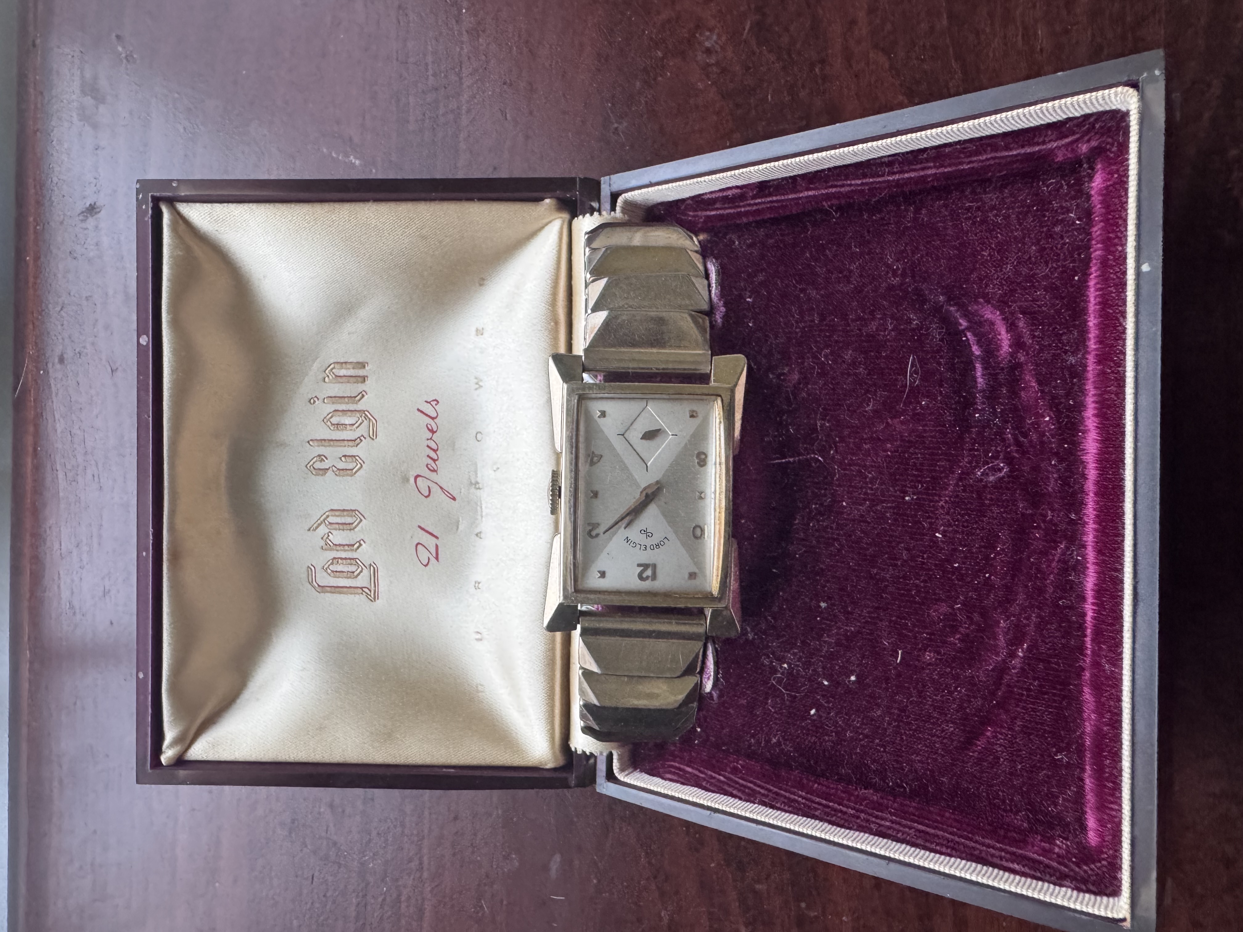 1950s Lord Elgin Prentice 14k GF Men’s Watch. Made by Lord Elgin. Dating to c. 1950s. Materials: 14k gold filled. Estimated value: $107 – $255. Condition: Good. The market for vintage watches is currently moderate, with prices showing a range of $24 to $361 based on comparable sales.