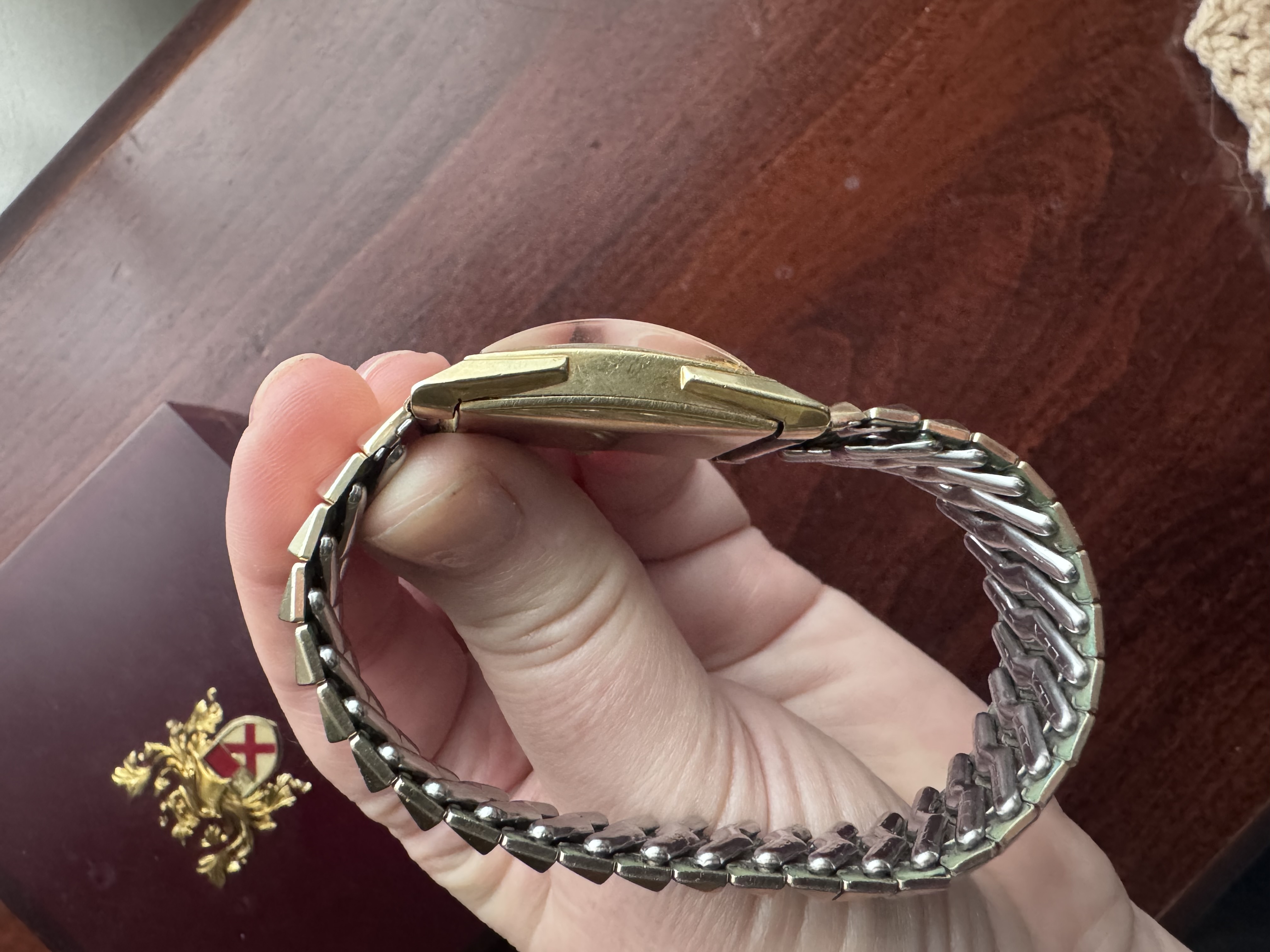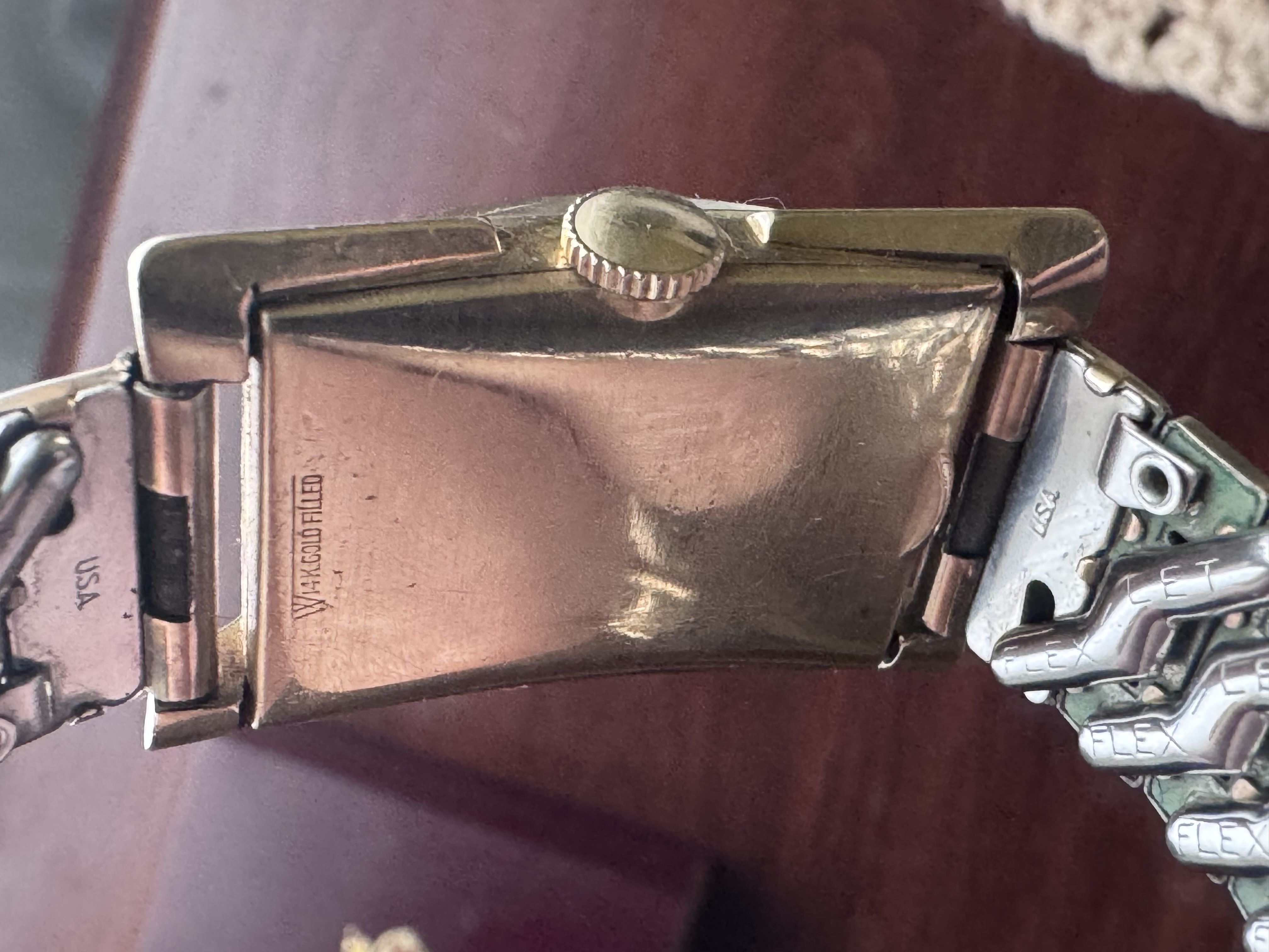 The date is supported by the design elements typical of mid-20th century watches, including the rectangular case and the use of gold-filled materials.