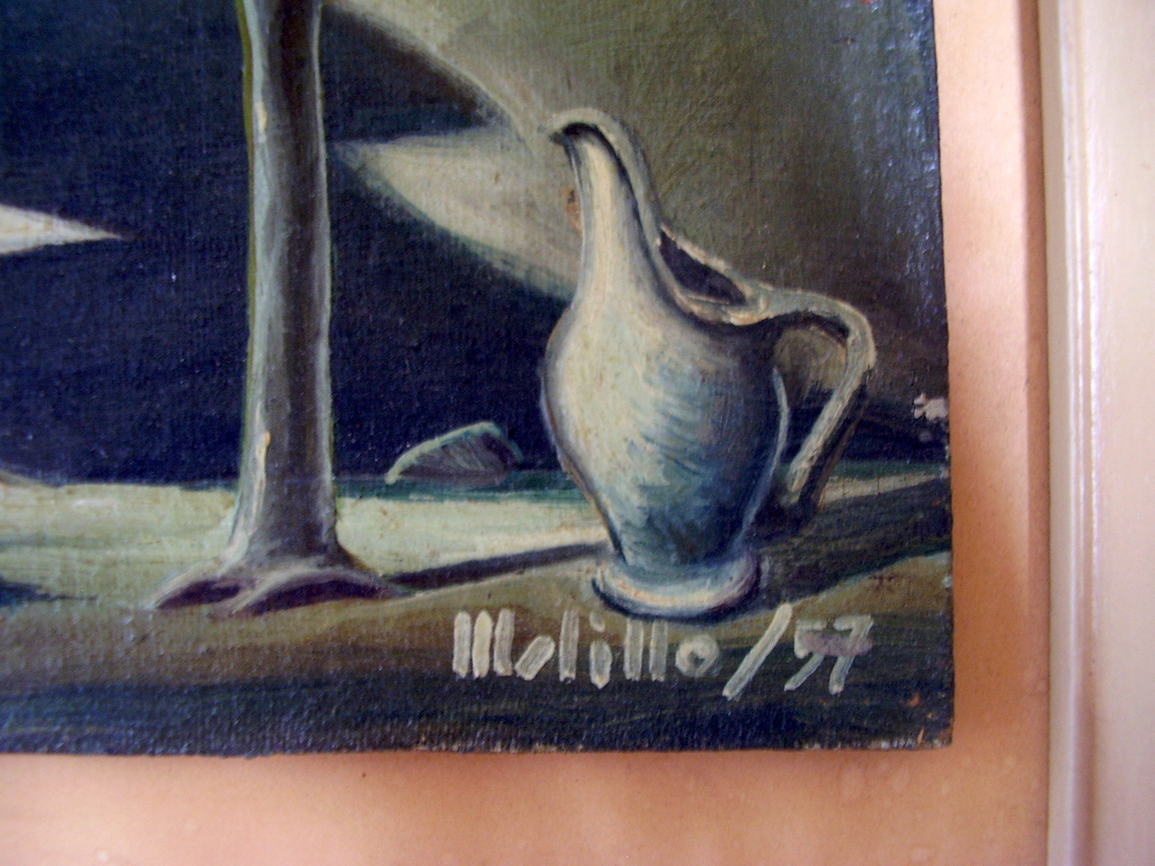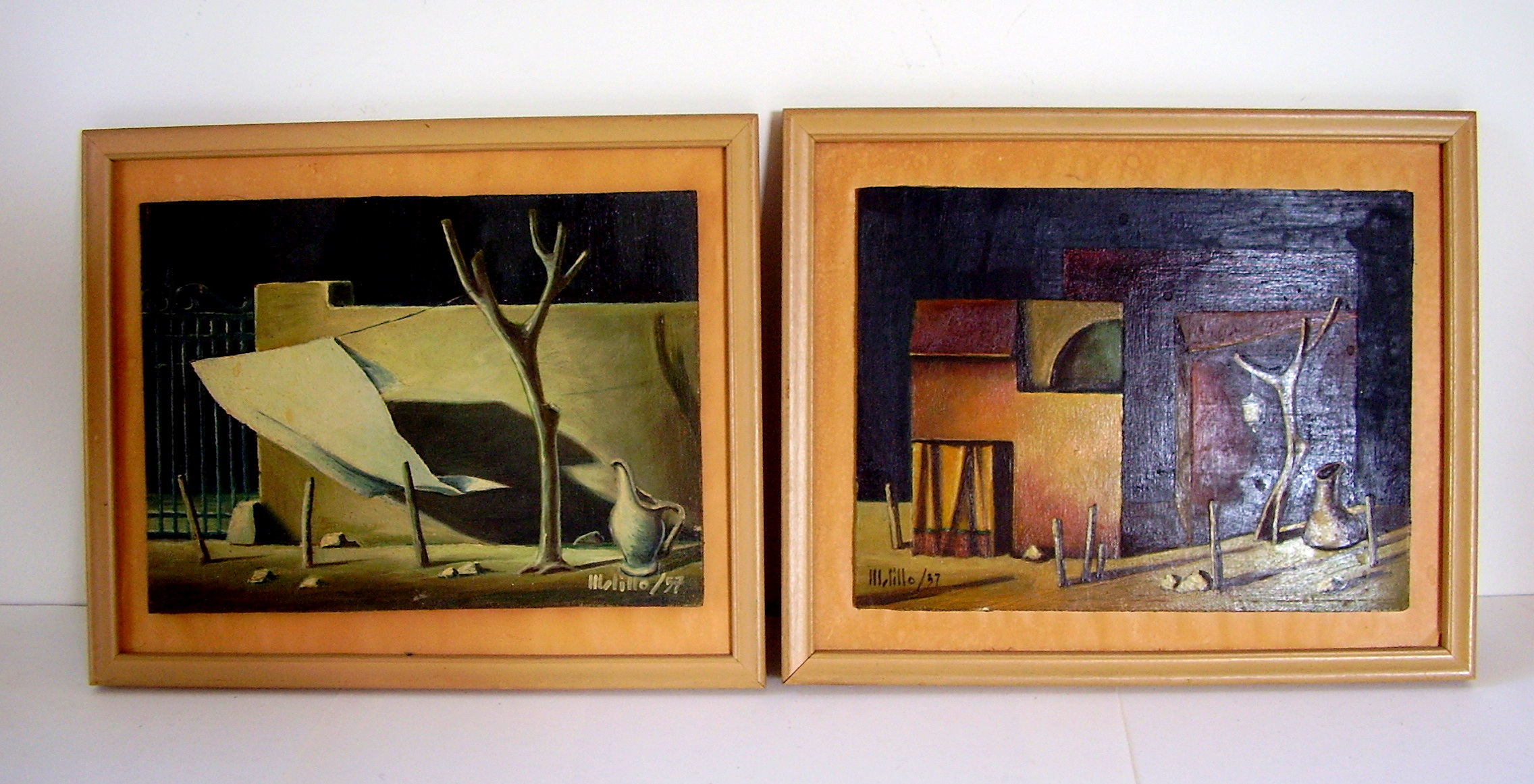 This is a pair of 1957 oil paintings that we purchased at an estate sale in the South Jersey area. Each measures 8 1/2 X 6 1/2 and are signed "Melillo" or "Milillo."