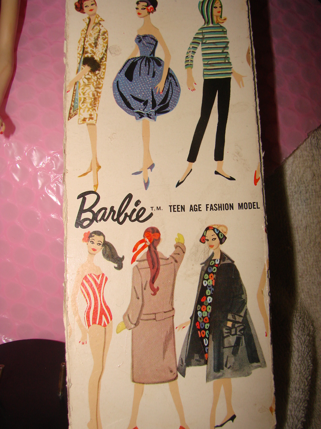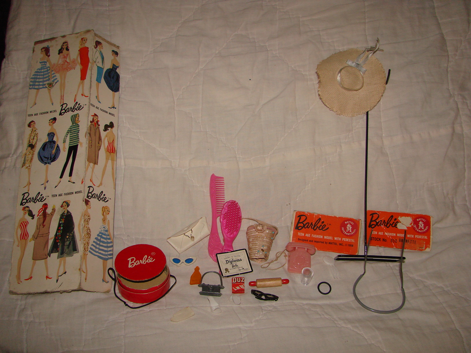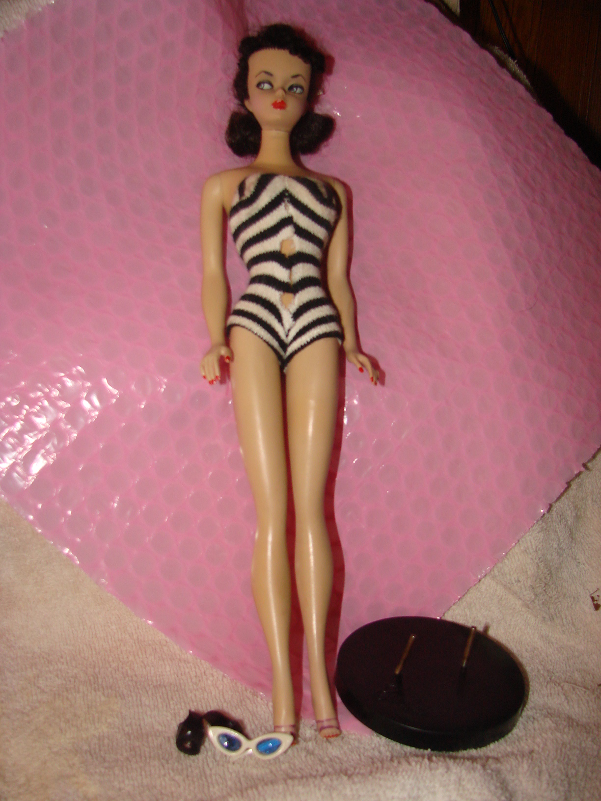 This Barbie fits all of the criteria of an original 1959# 1 Brunette Ponytail Barbie. Includes the black and white bathing suit which is coming apart in front, the black shoes with the holes in them for the stand, The 2 prong stand, the white/blue lens sunglasses-one arm of the sunglasses is off, but it is in with the accessories, the top of the box, the ends of the box are detached, there is no bottom to the box. The earrings are missing so there is no green on the ear and the little booklet is missing. Her feet are discolored where the shoes fit on them. The shoes cover that up. I am wanting to list it along with a case and some other vintage barbie clothing and accessories on ebay or at another collectible site. I just am not sure how much to ask for her. Can anyone help before I post it for sale anywhere? I will consider offers as well if you are interested in her, otherwise I would love some advise for posting on ebay. I can email more photos of closeups if anyone wants them just let me know! Thank you!