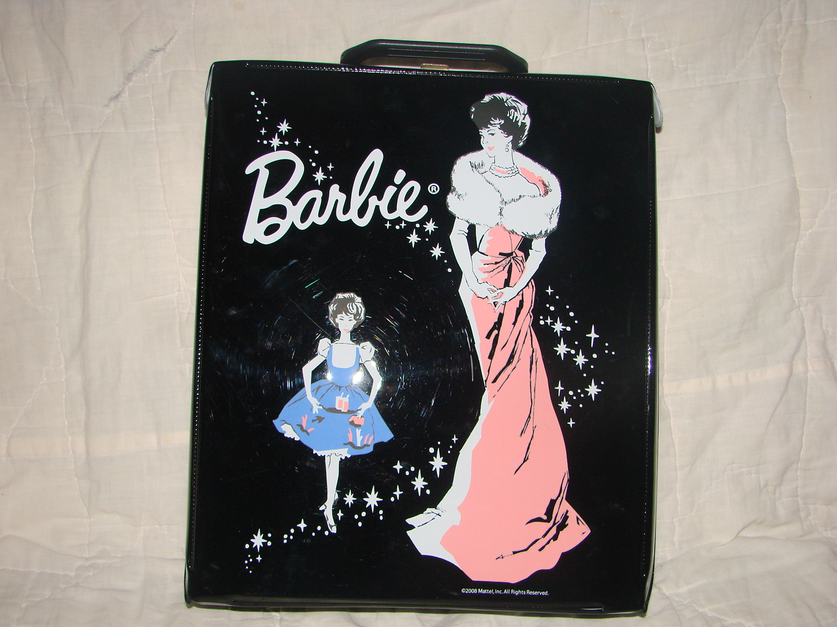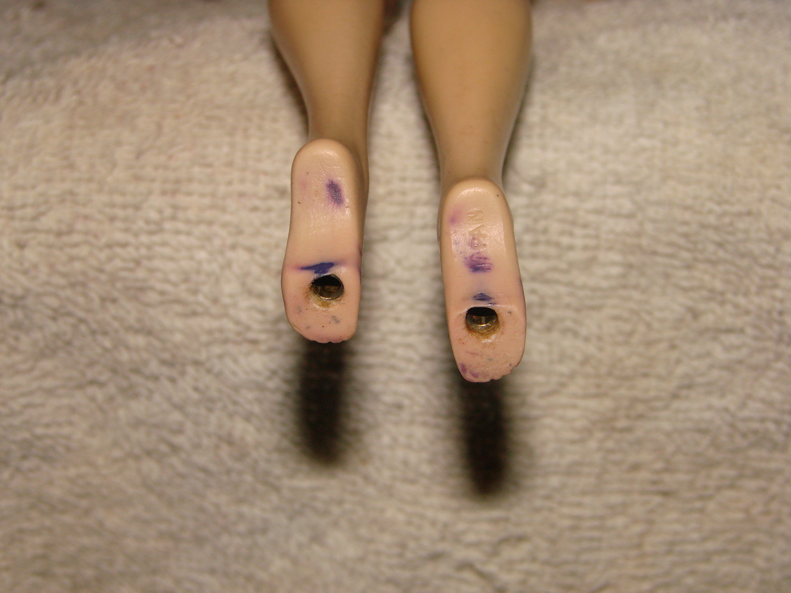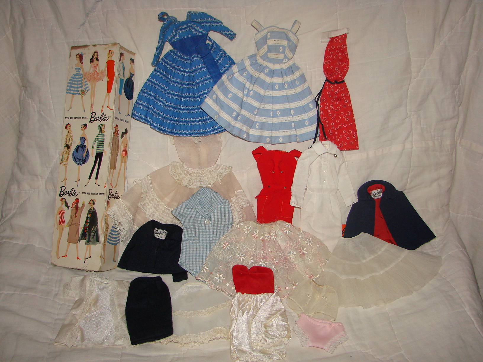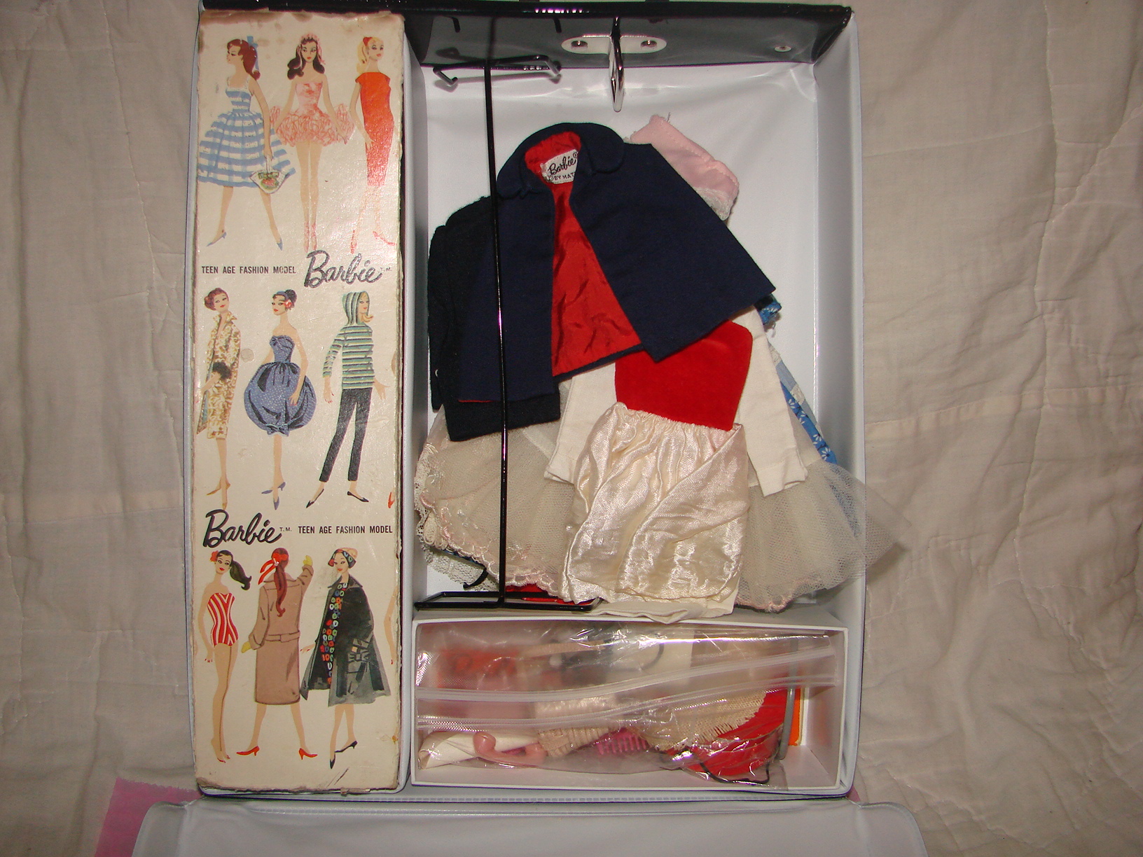 This Barbie fits all of the criteria of an original 1959# 1 Brunette Ponytail Barbie. Includes the black and white bathing suit which is coming apart in front, the black shoes with the holes in them for the stand, The 2 prong stand, the white/blue lens sunglasses-one arm of the sunglasses is off, but it is in with the accessories, the top of the box, the ends of the box are detached, there is no bottom to the box. The earrings are missing so there is no green on the ear and the little booklet is missing. Her feet are discolored where the shoes fit on them. The shoes cover that up. I am wanting to list it along with a case and some other vintage barbie clothing and accessories on ebay or at another collectible site. I just am not sure how much to ask for her. Can anyone help before I post it for sale anywhere? I will consider offers as well if you are interested in her, otherwise I would love some advise for posting on ebay. I can email more photos of closeups if anyone wants them just let me know! Thank you!