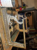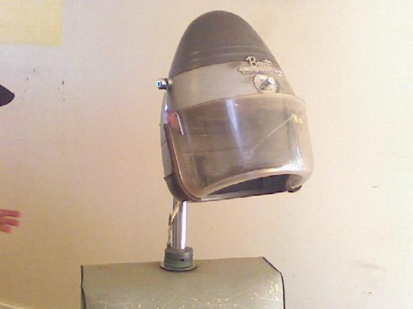 salon chair, tag at bottom inside chair is dated 1948 the dryer part is dated 1959, its excellent condition, has original everything, nothing restored or added,has gold leafing in pattern of fabric, dryer works well, has hot and cool dial, automatically comes on when plastic cover of dryer is lowered