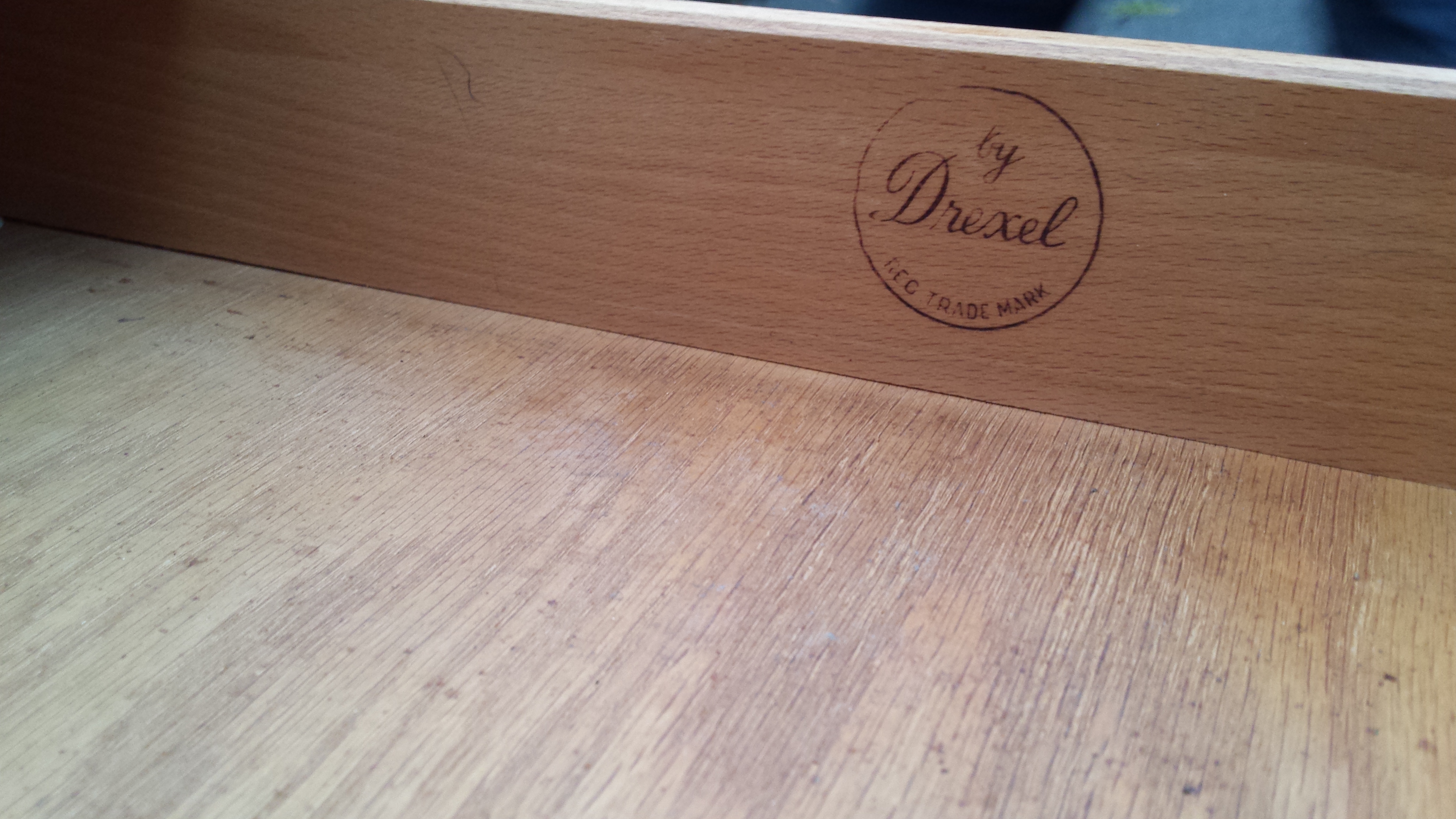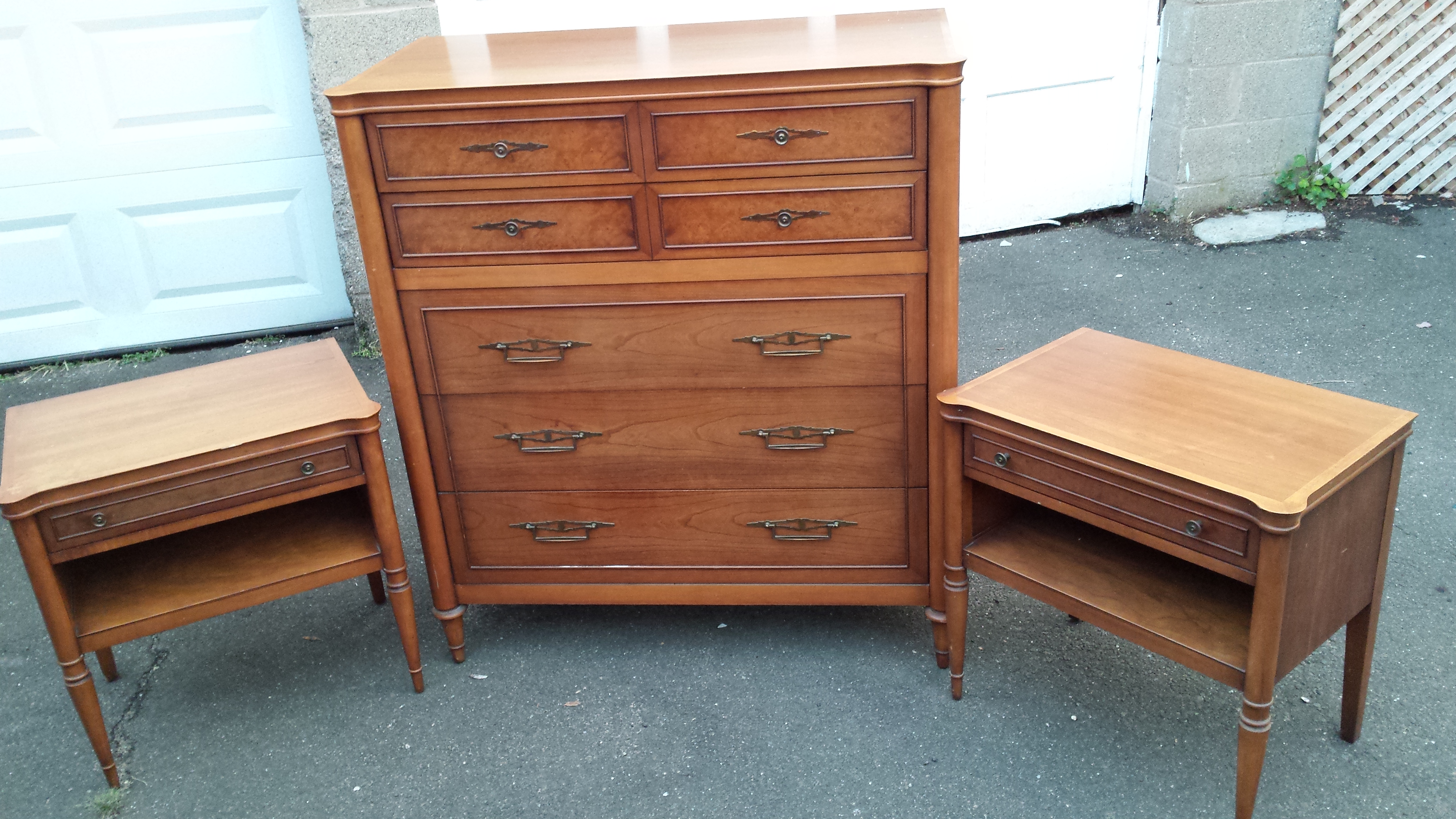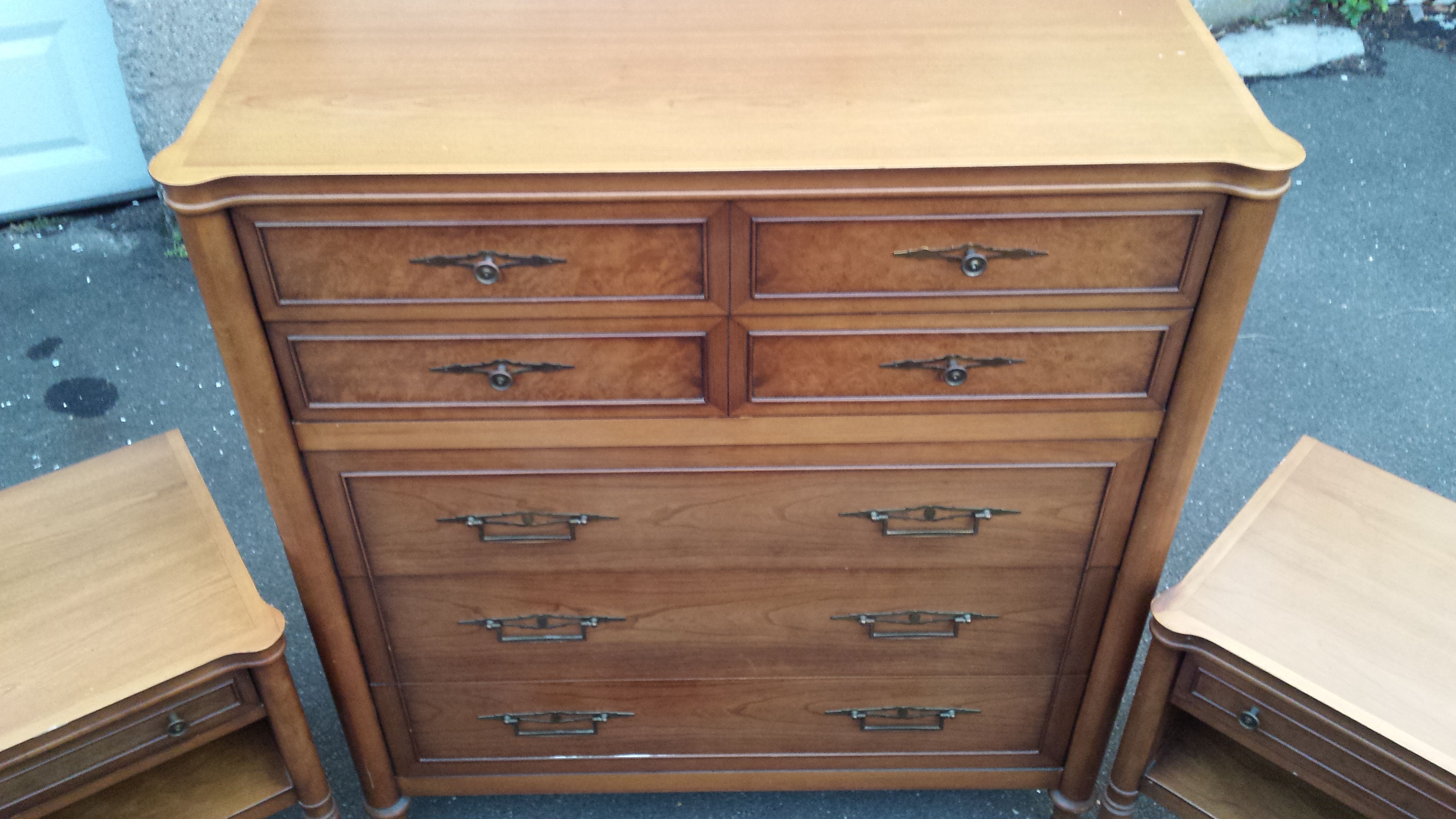 I have a Drexel bedroom set that includes a tall dresser (shown in photos), a 9 drawer 5 foot long dresser with original mirror (not shown in photos), and 2 endtables. They are all in very good shape. There is not much info on the internet about the Triennale series but from what I found its made of Myrtle Burl and Cherry and was only made for a few years.