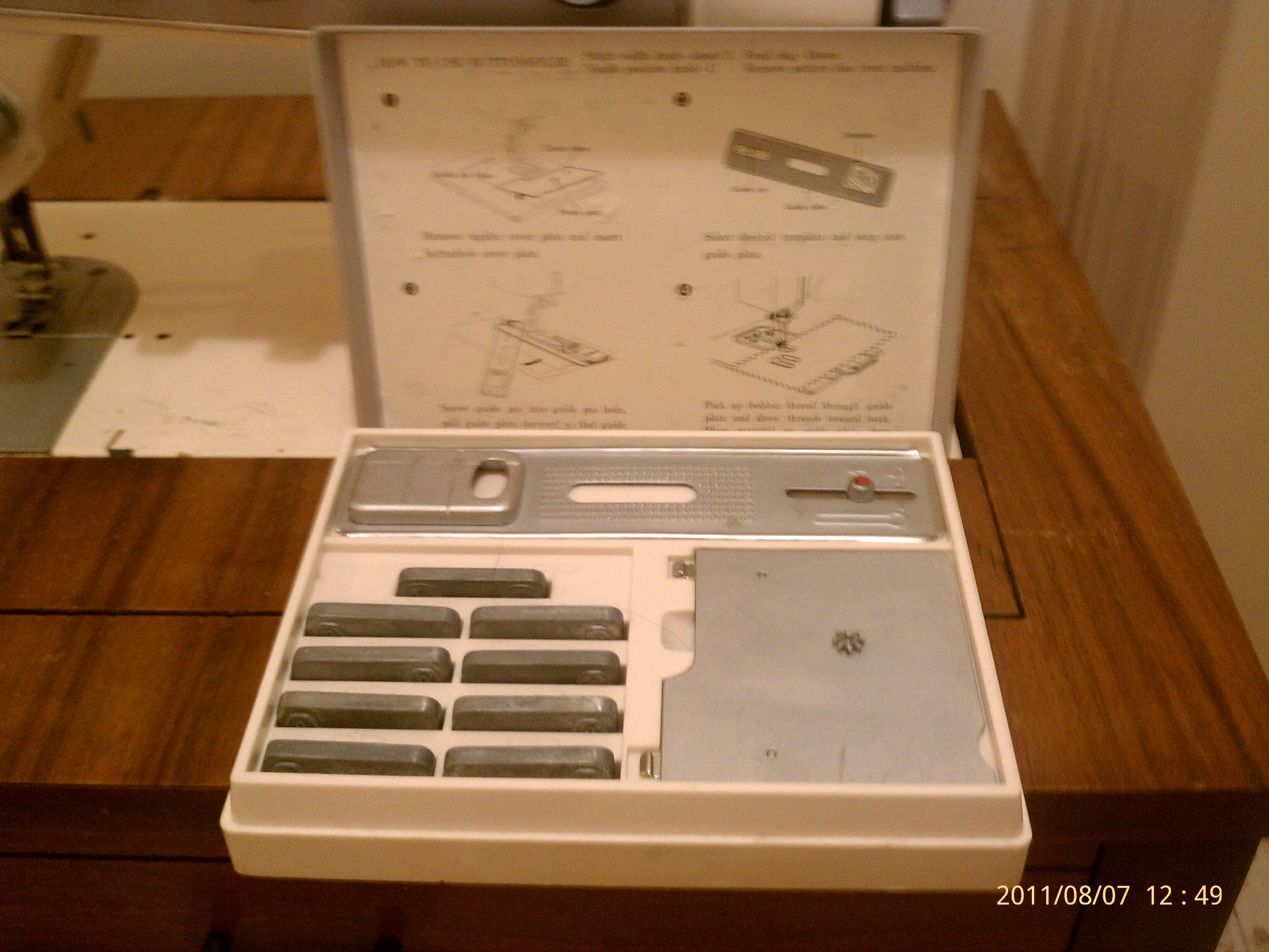My dad purchased this machine for my mom for Christmas in 1961 or 1962. "Top of the line" electric motor powered machine with straight and zigzag stiches. Group includes machine, owner's manual (front cover missing) sewing cabinet/table, and storage stool in cherry-stained wood and mid-century modern style. Includes buttonhole attachment with geared throatplate and 9 templates that create 10 sizes/styles of buttonholes and eyelets. Also includes box of drop in cams that create 30 decorative stitches that can be used with either a single or double needle.