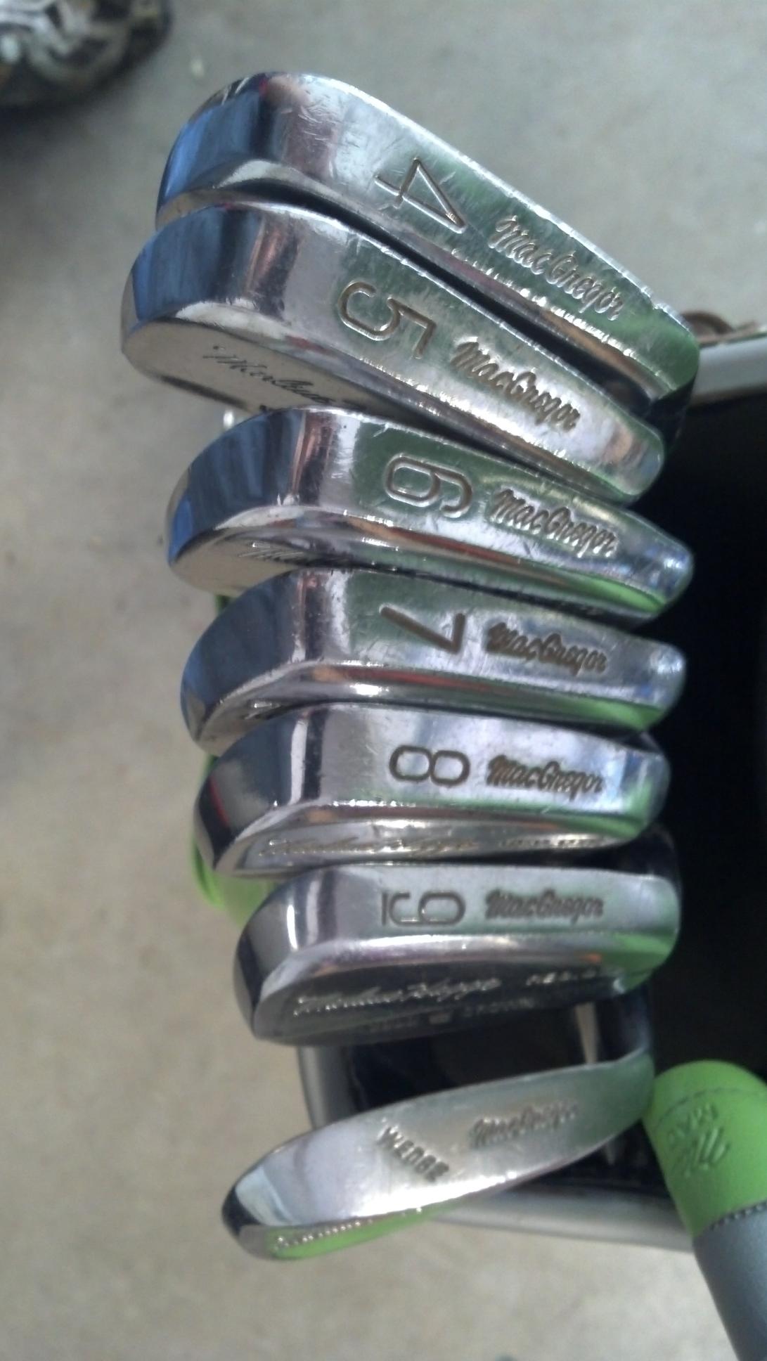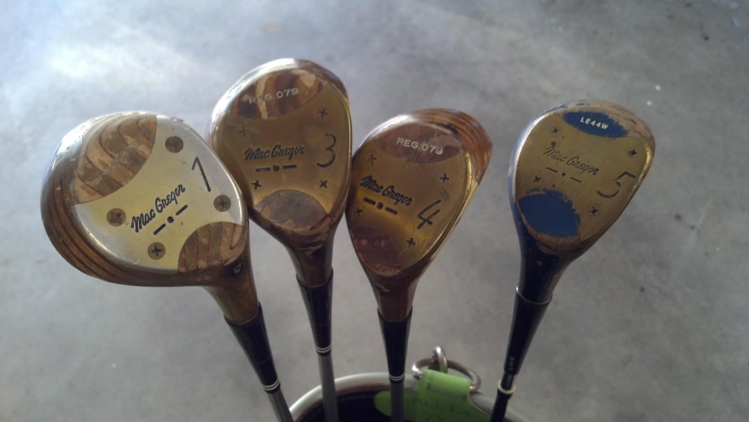 1960's? Marlene Hagge Macgregor goldcrown ladies golf club set, it has all the original irons and woods, it has the original bag and bag raincoat, the clubs numbers match the bag numbers. has the original headcovers for the driver and woods.