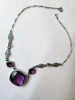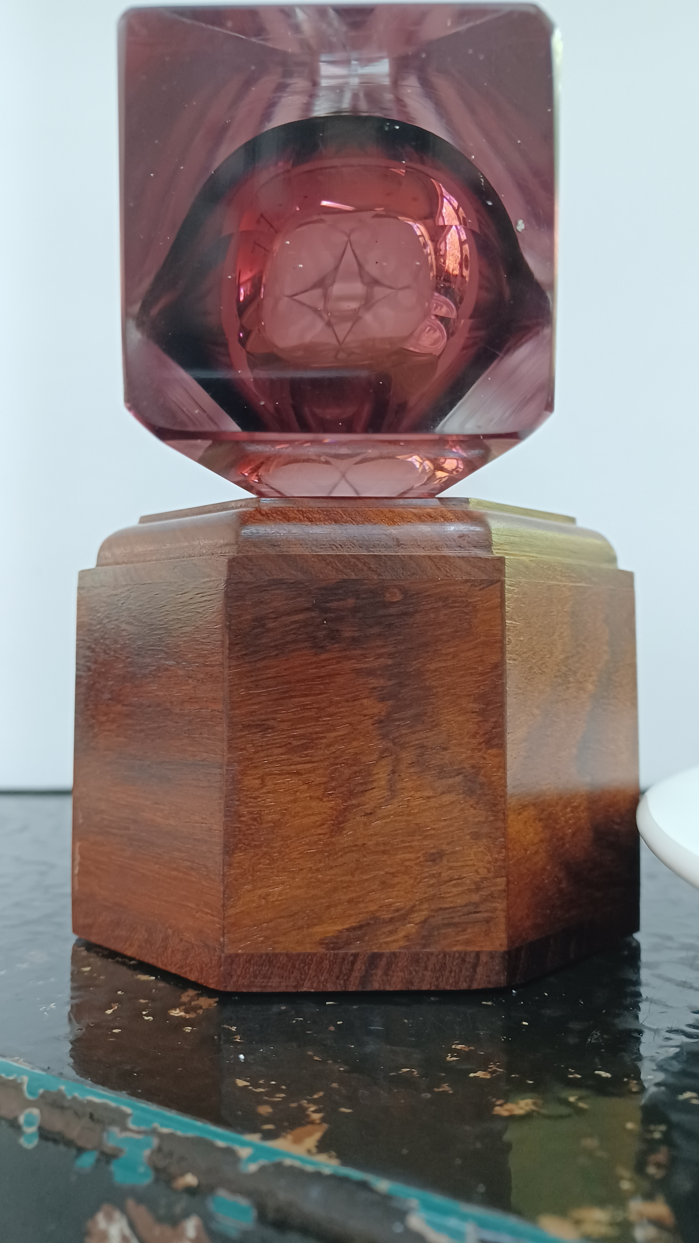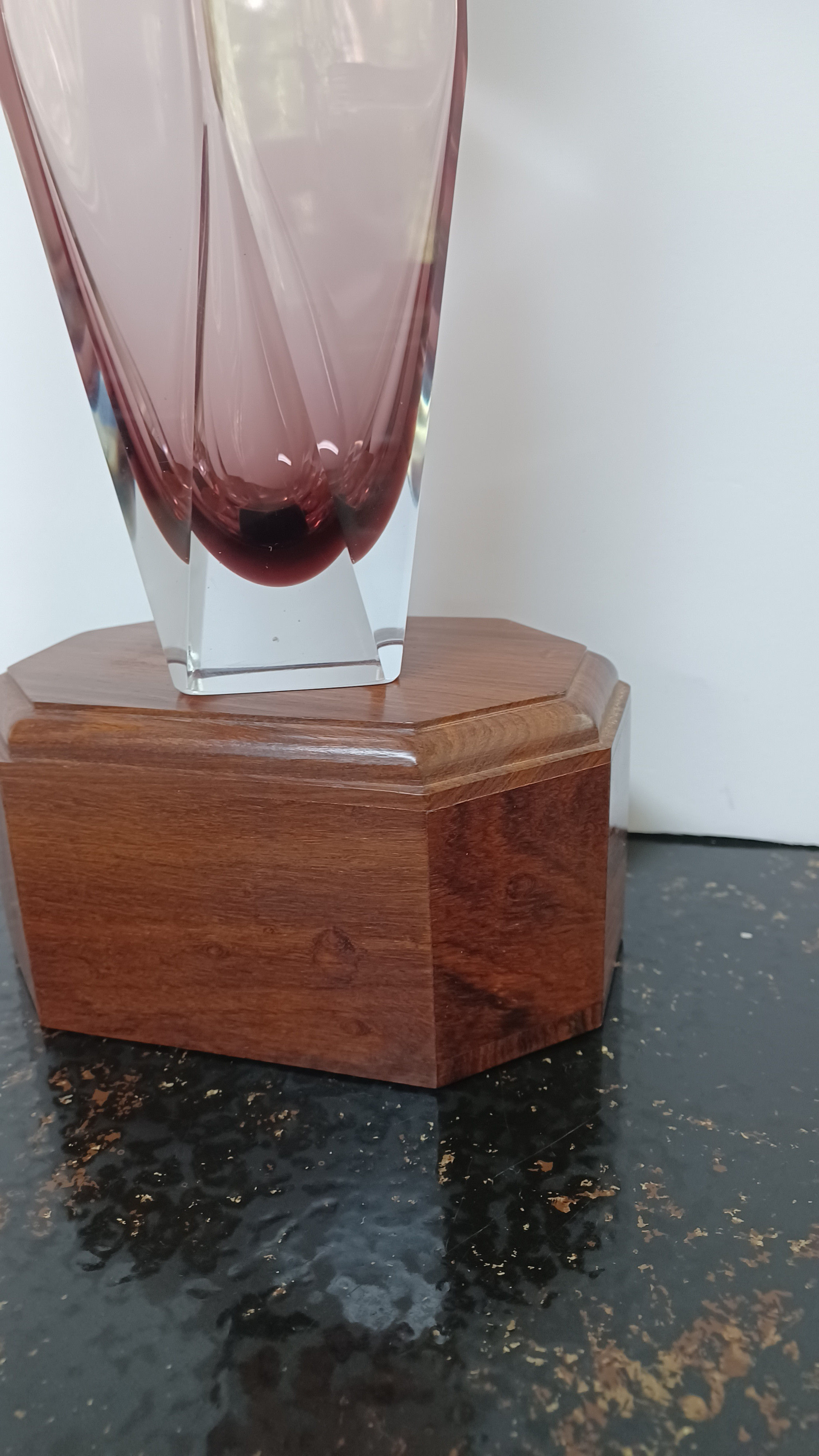 10 inches tall faceted handblown glass vase. The inside is a plum purple and the outside is clear glass. square at the bottom and top 2 inches. I can't see a makers mark but there is some sort of design in the glass at the base inside the vase.