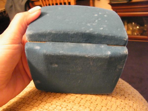 It's in the original blue velvet hinged box, which has no rips, tears or worn-through areas. There's only some areas of velvet that have been compressed due to storage over the years. These appear white or shiny in the pictures.