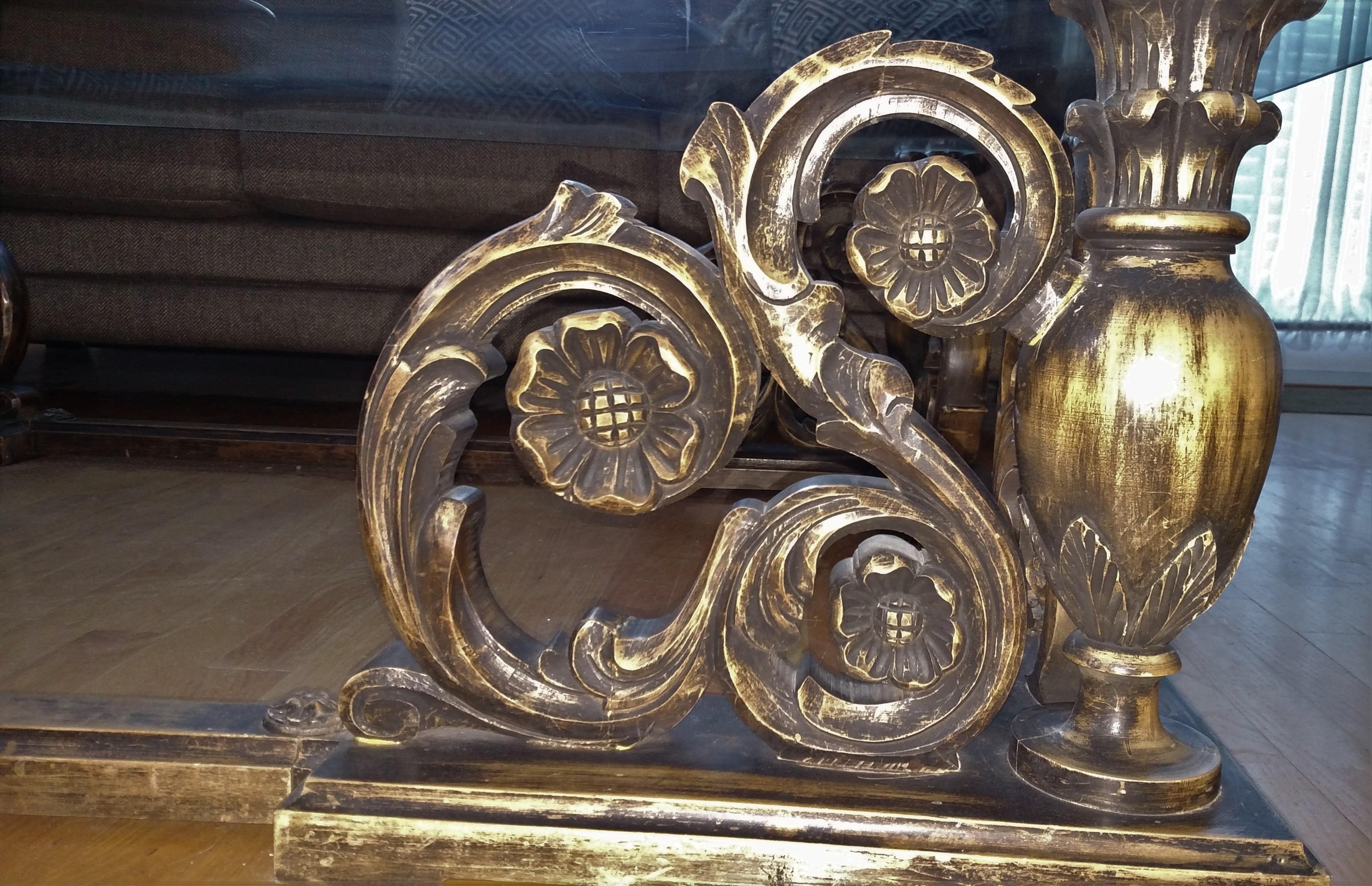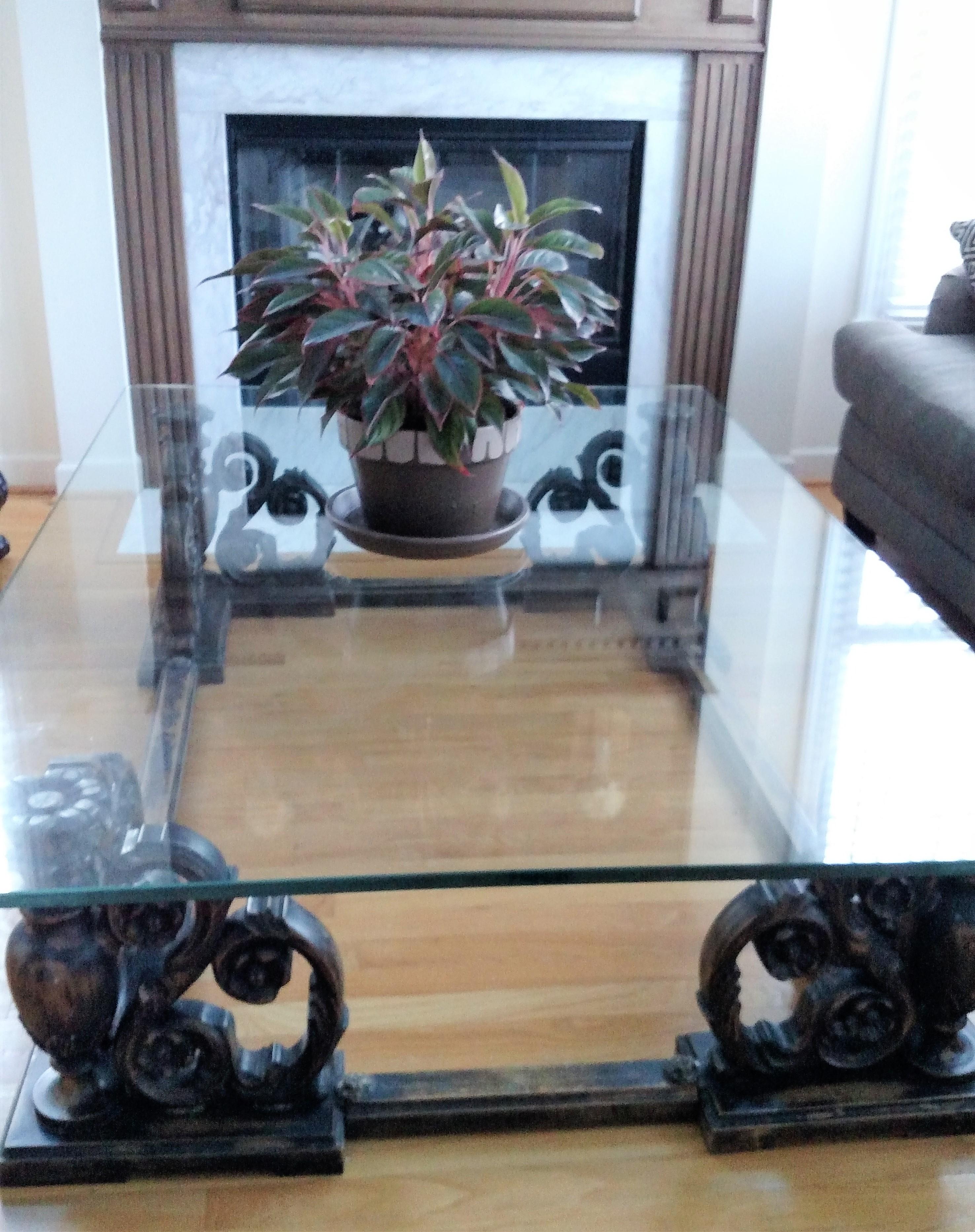 This piece has been in the same family since its $5000 purchase in 1967, and has undergone multiple moves. Glass has some superficial scratches and its weight requires a 4 person carry. Each corner has suffered damage (one Gorilla-glued in 3 places) as we were not able to convince movers to pick each piece up from the bottom and shouldn’t be carried by the inviting scrolls. Its unique elegance captures attention. With a little TLC, this table could once again be a masterpiece.