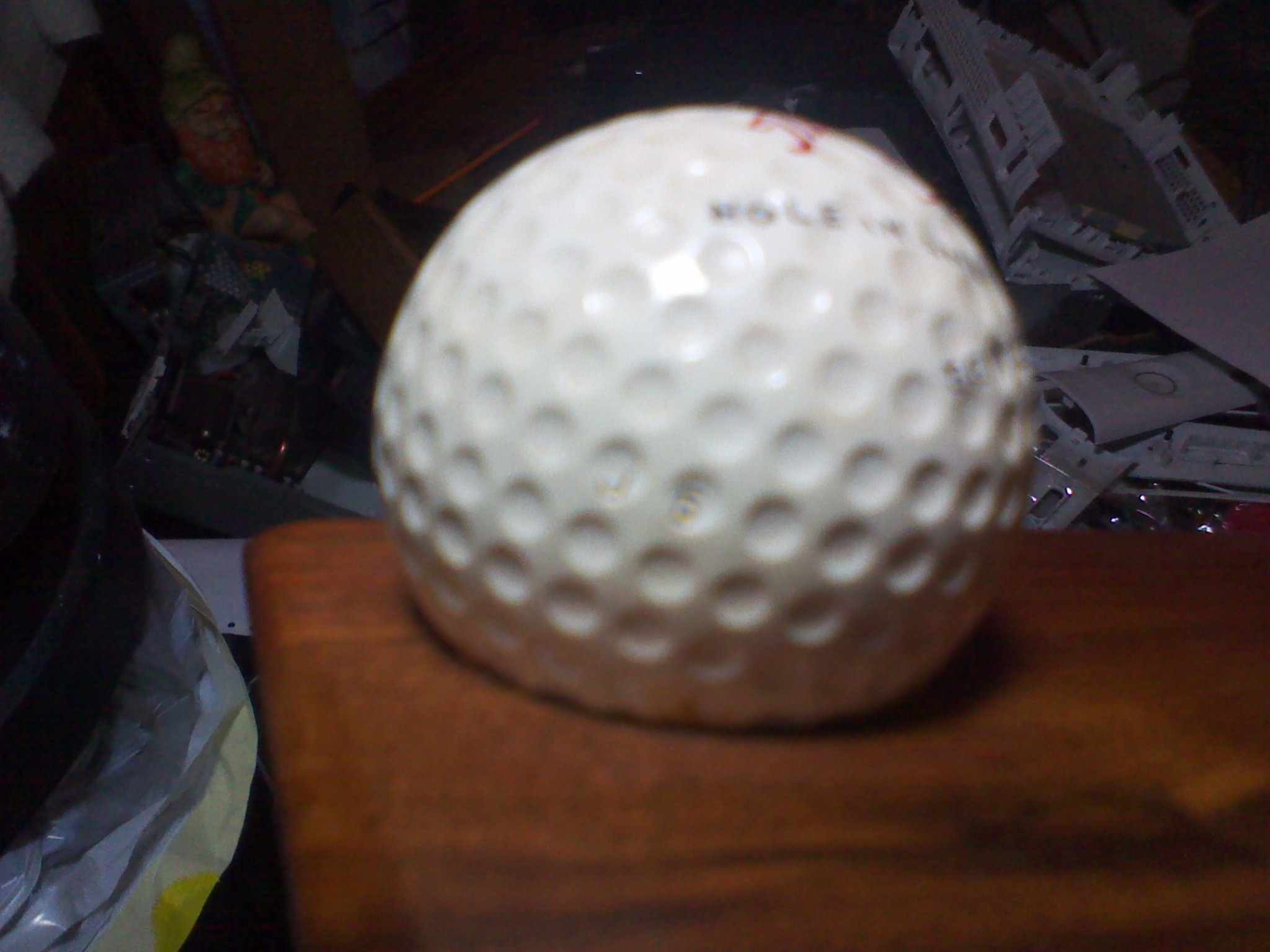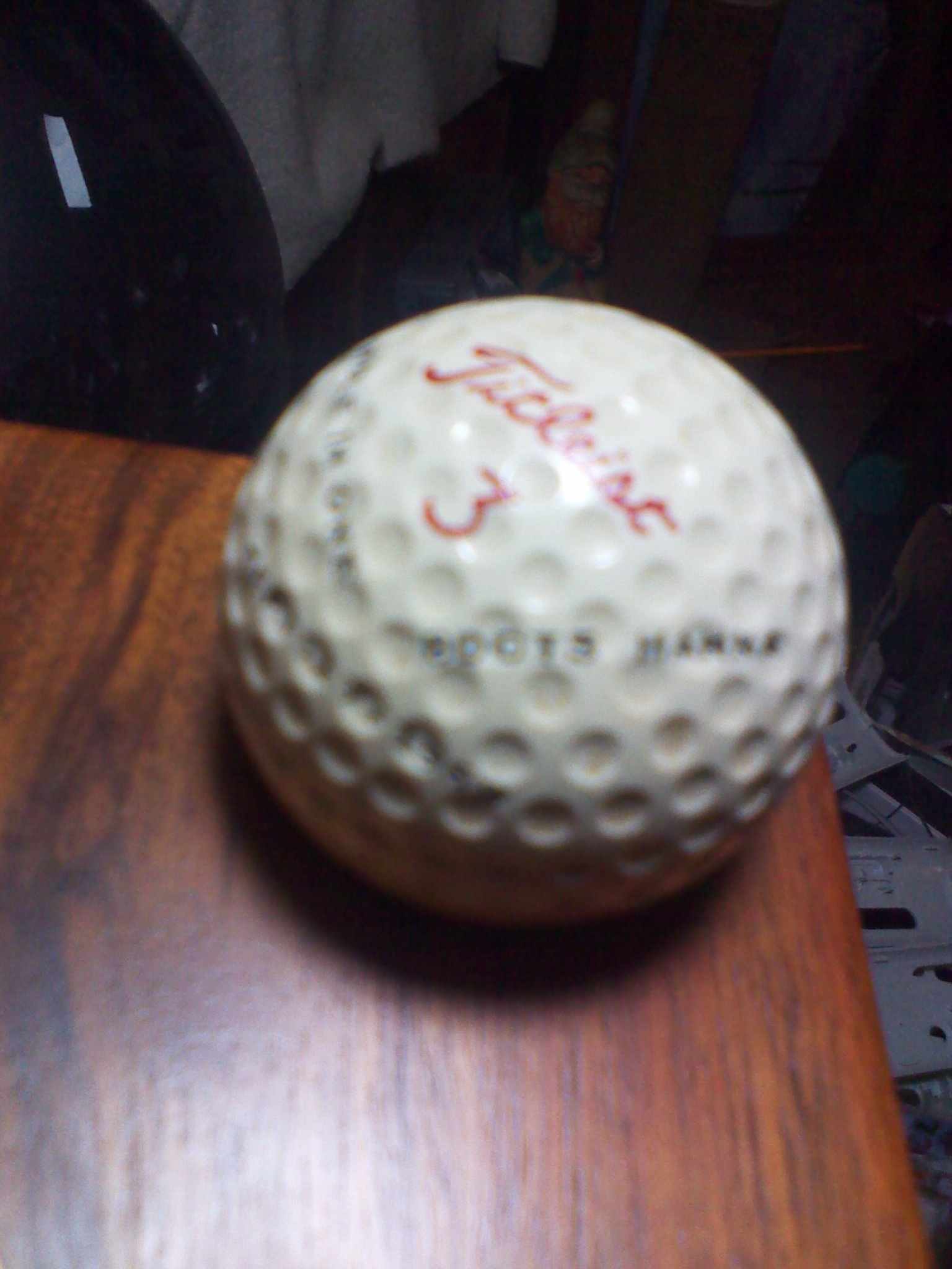 I saw this at a thrift store and thought it was cool, from what I can tell it is a Titleist 3 ball that was customized with the name "Boots Hanna" and the words "Hole in One", apparently, Boots Hanna hit a hole in one with it, and then had it set into a large, wooden (cigar ashtray?), dated Sept. 17th, 1969 (I'm sure that's the day of the hole in one, not the actual manufacture date of the ashtray) also has "J" and "5" imprinted into two of the dimples on the side of the ball. Any info about Boots Hanna or the value of this item would be greatly appreciated, thanks!