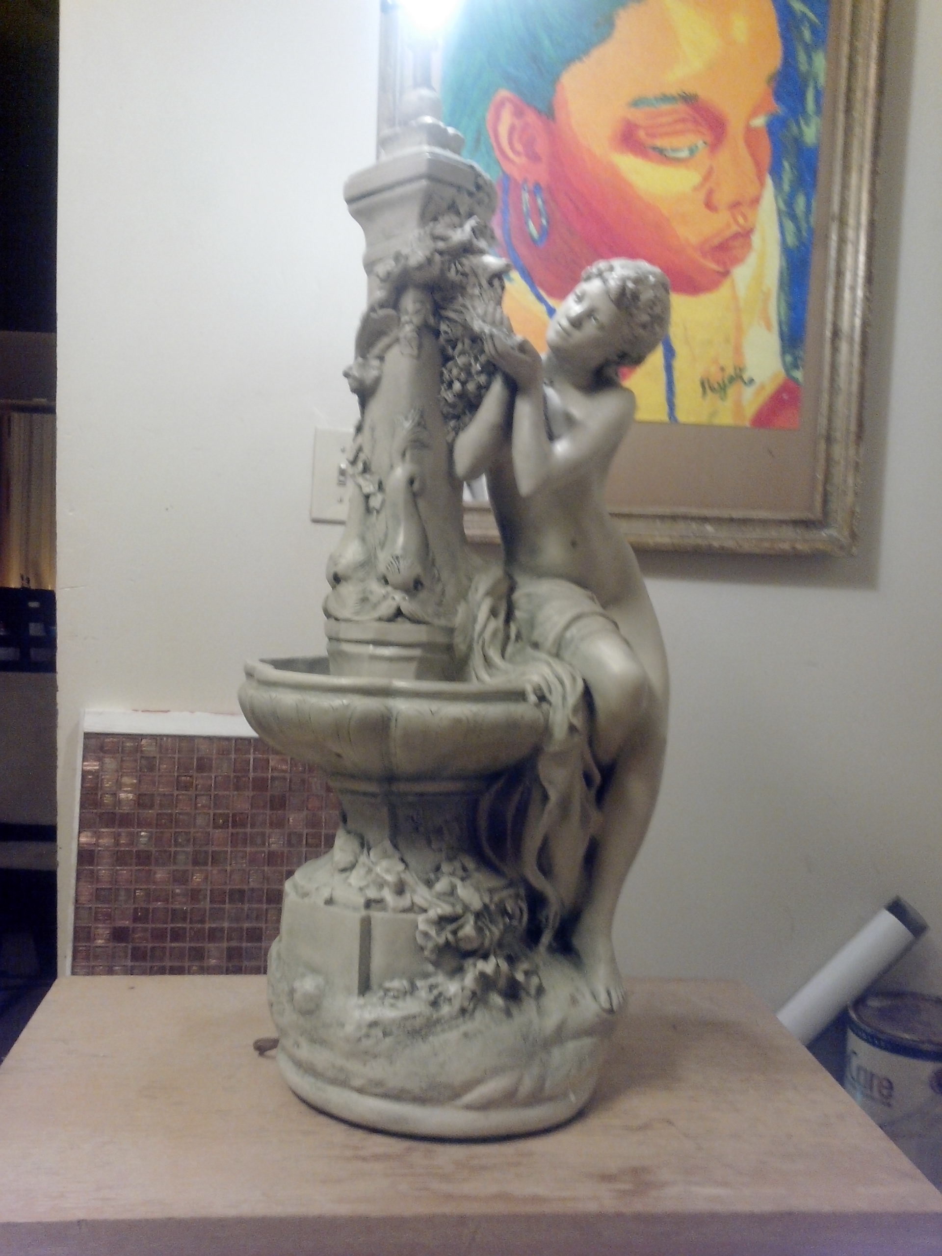 Got this lamp from a house we rehabilitated, that were going to throw it away but being the Art lover I am I couldn't let that happen. I absolutely love the detail, never seen one like it. Idk what material it is but when I searched vintage lamps a lot of chalkwear and plaster came up. Its Extremely Heavy! If you have any info about it please share, I'm highly interested.... Thanks bunches.