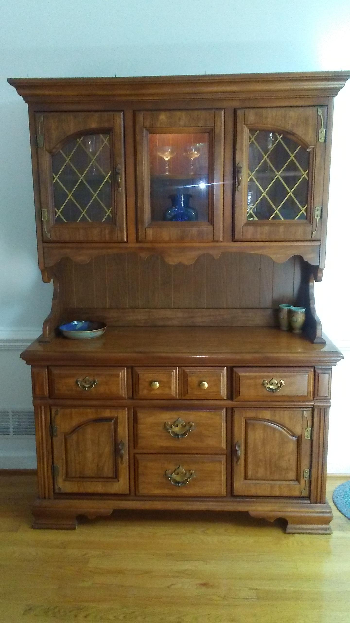 Basset furnitur, pedistal table with a leaf and six chairs and a hutch with also looks like an oak finish.