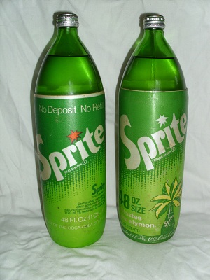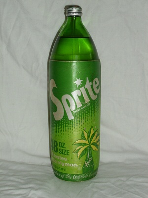 1970's 48oz. glass Sprite Bottle. Foam wrapper. Unopened with COKE price tag ($.69). Bottom of bottle reads 9 * 25 - 76. Metal screw on cap.