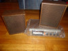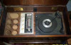 1970s vinyl record player and 8 track combo stereo with heavy marble-like floor and fake fire log display