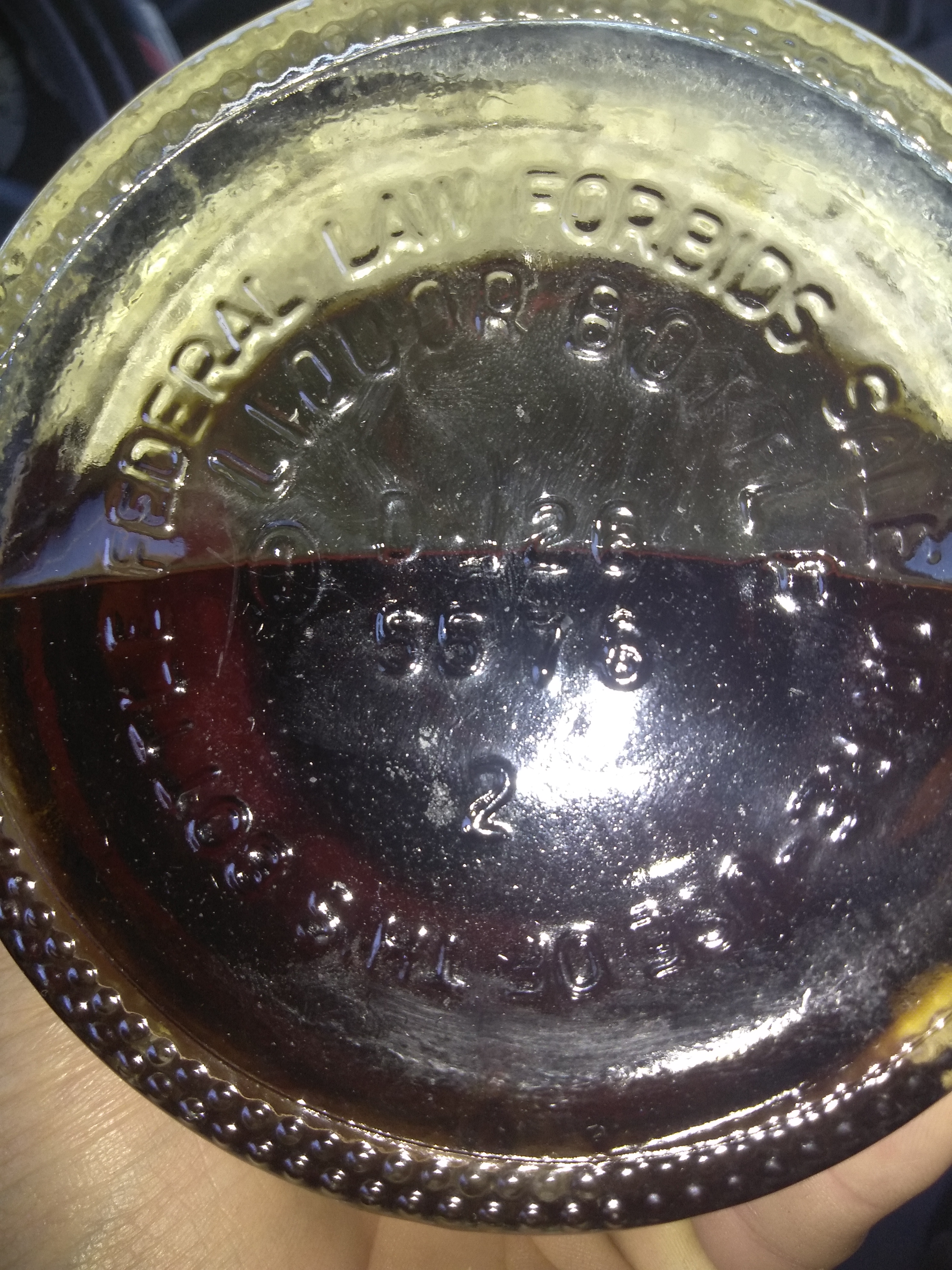 Bottom of bottle says, "federal law forbids sale or re-use of this bottle"