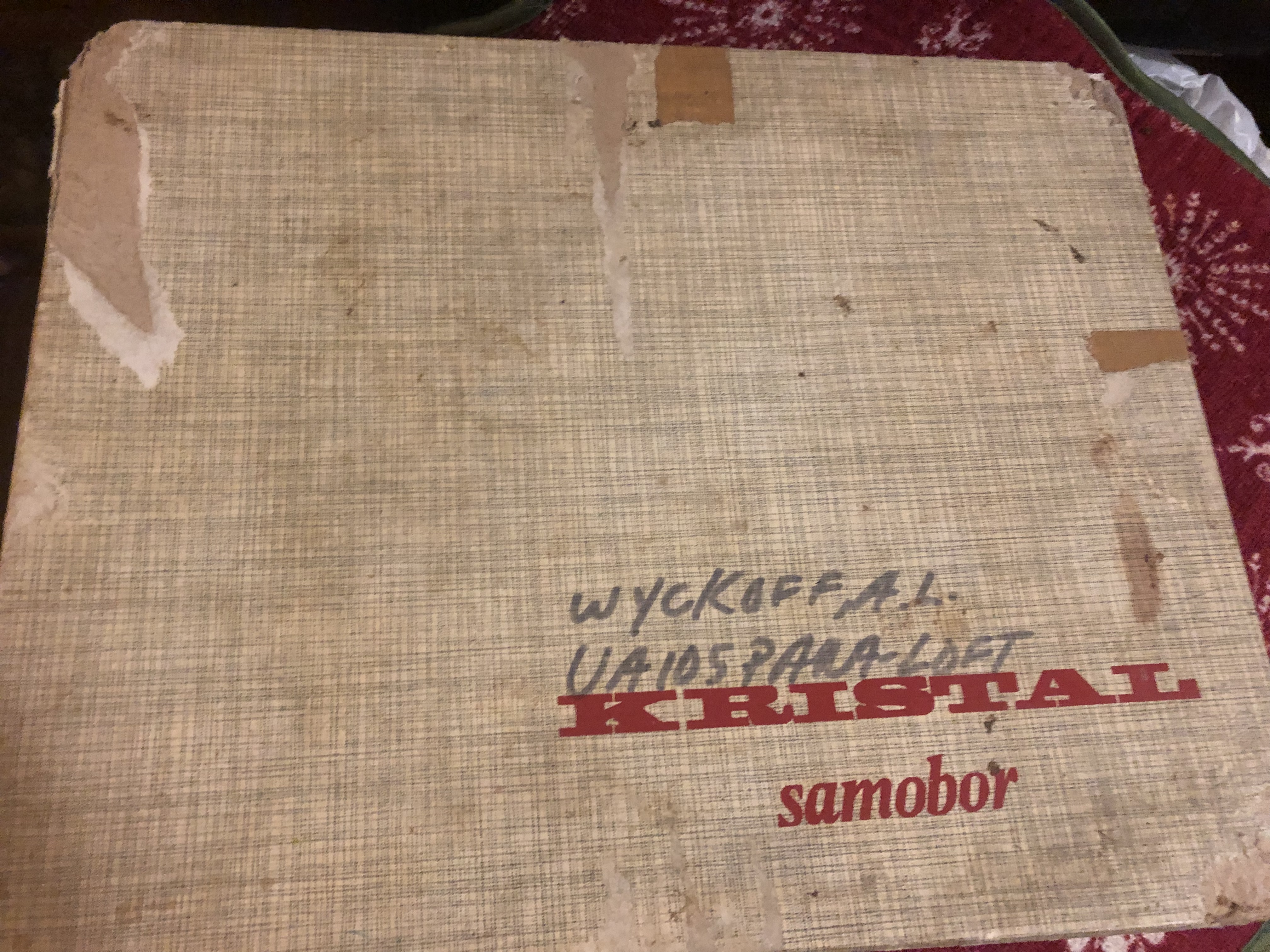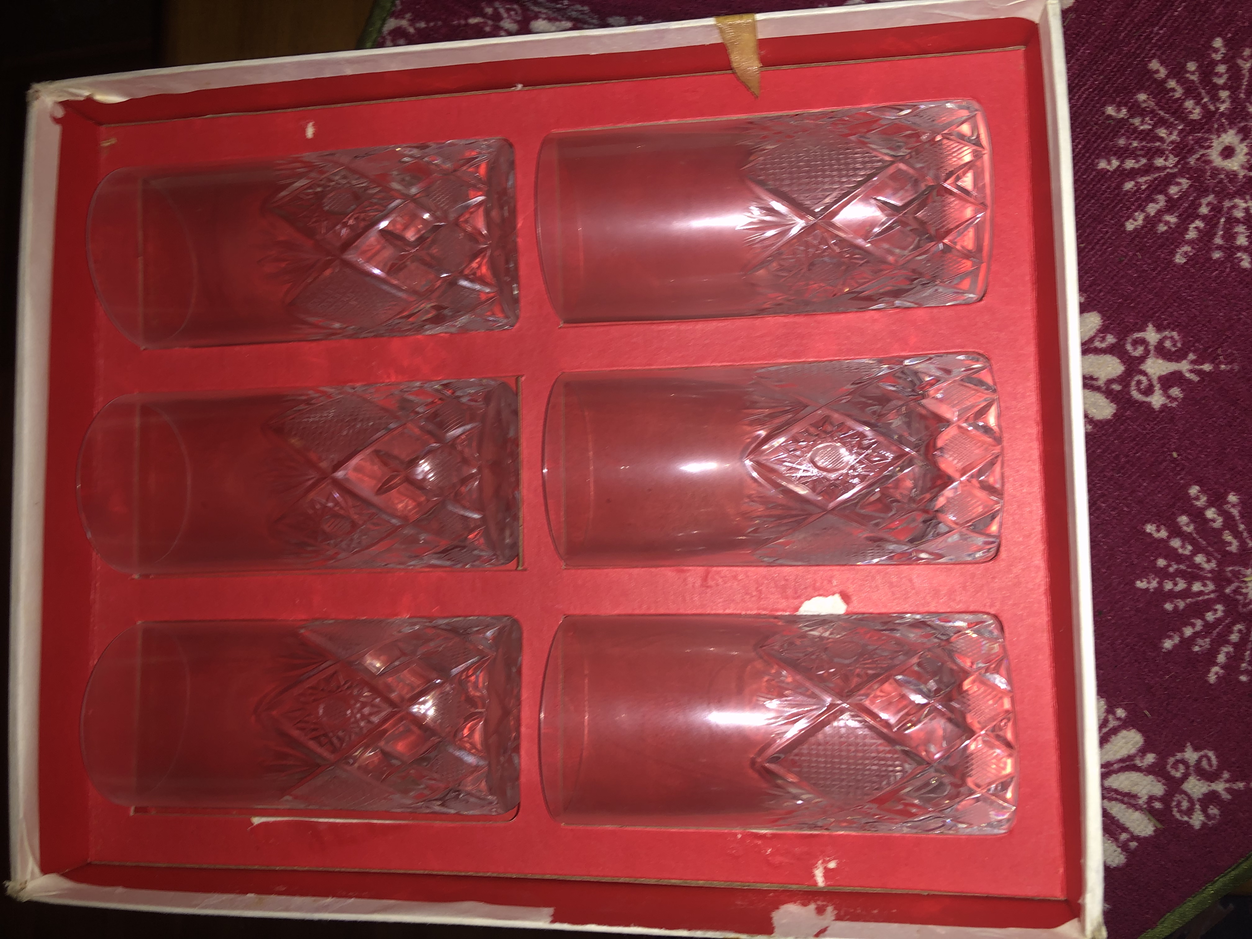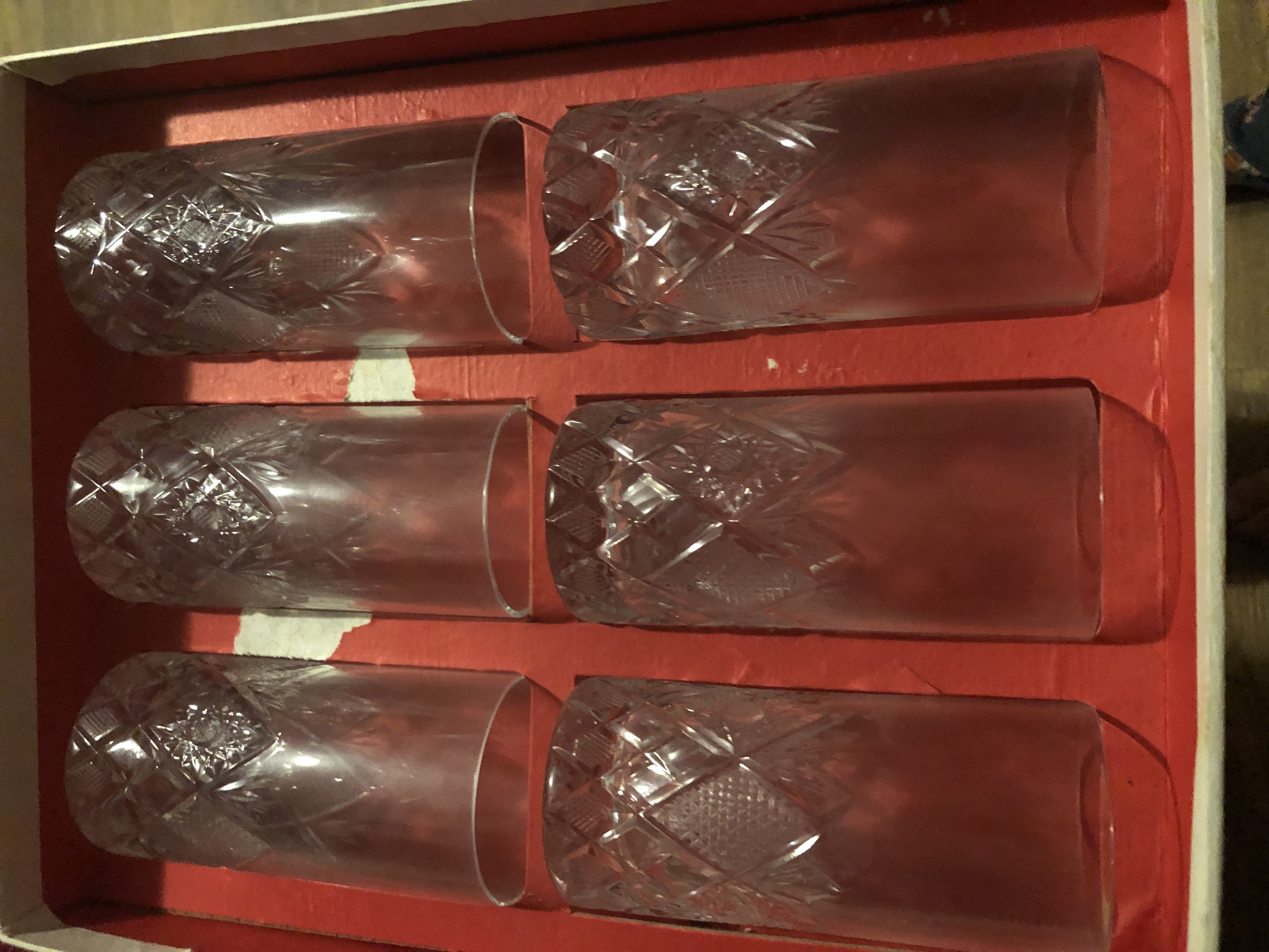 Two sets of 8 crystal glasses bought in 1976 by my Father in Split Yugoslavia “samobor Rucni Rad” written on the boxes.