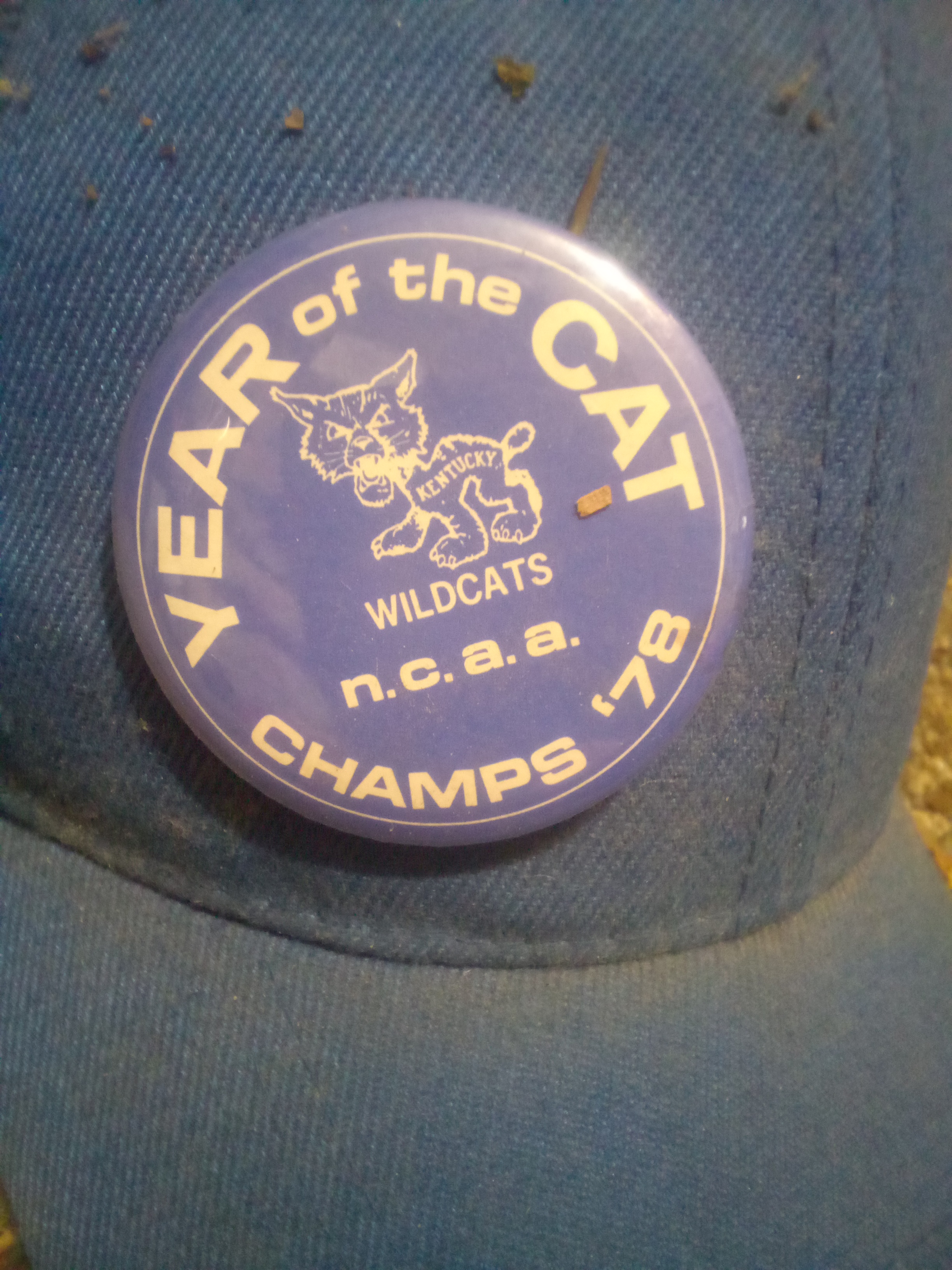 Description: This pin commemorates the University of Kentucky Wildcats' NCAA championship win in 1978. The pin features a blue background with the text "Year of the Cat" and an illustration of a wildcat, along with the year and NCAA branding.