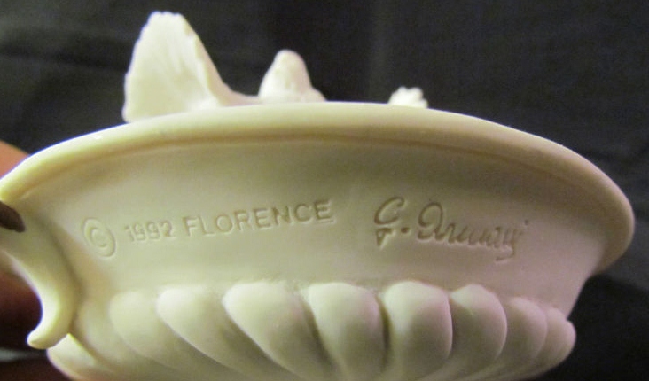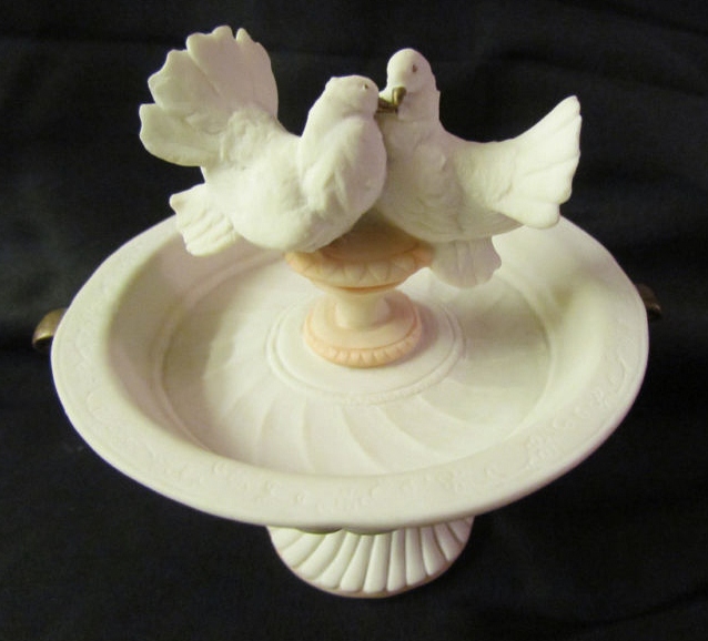 Bisque or porcelain figurine - 2 doves on a fountain. There is a "Made in Italy" sticker on the bottom. Piece is marked "1992 Florence", "C" and "G Armani". It is done in muted natural bisque colors with great detail.