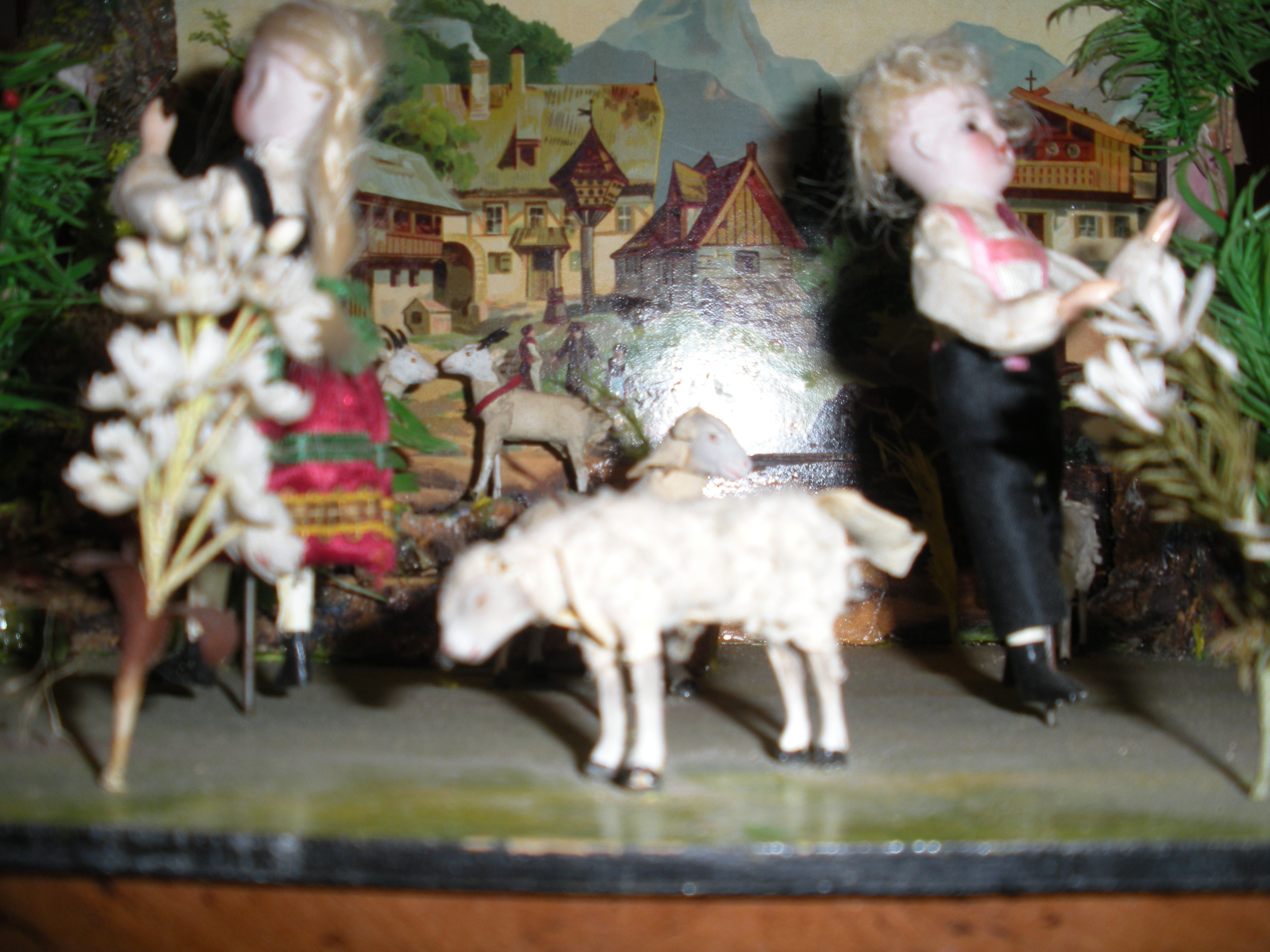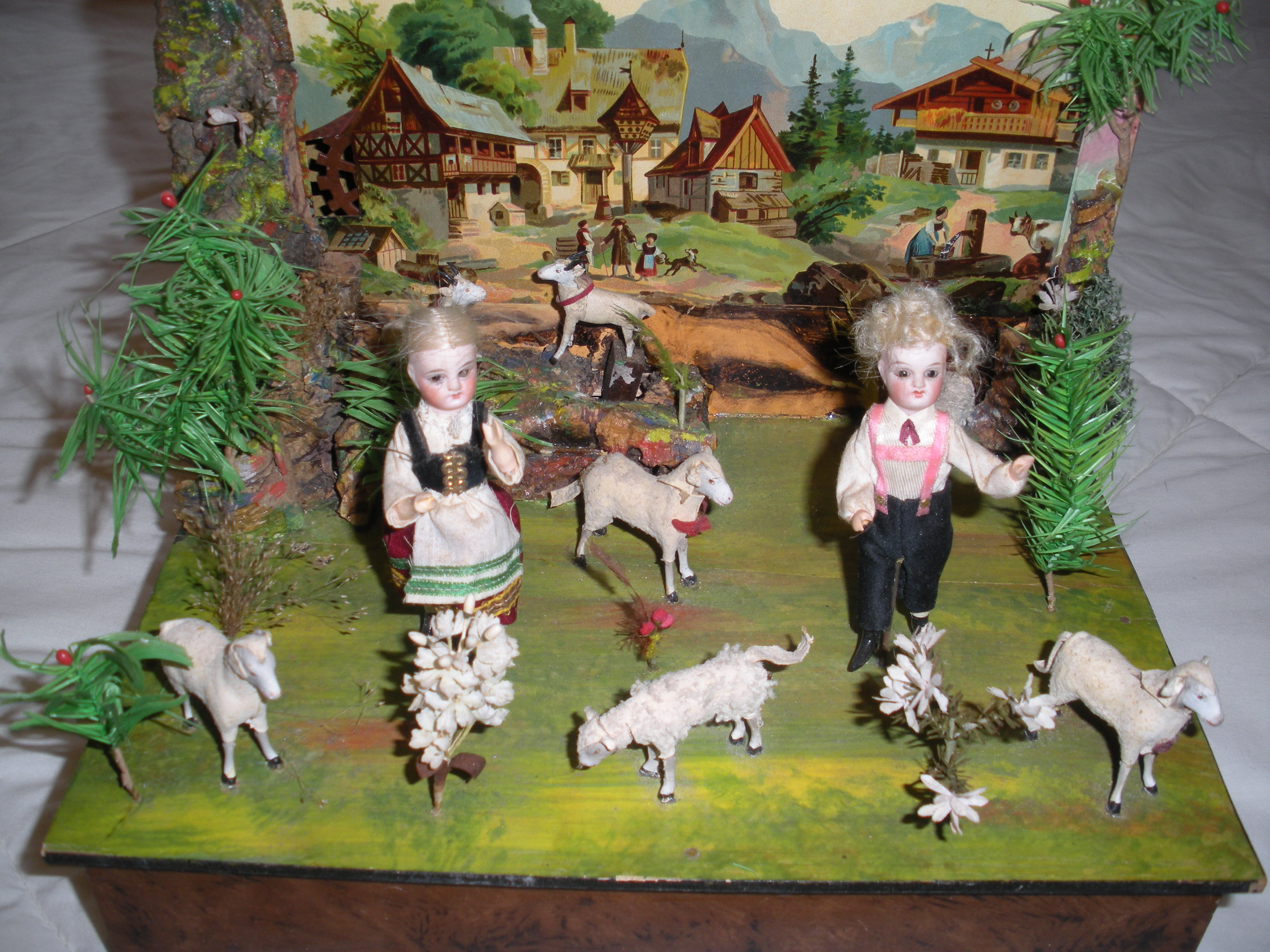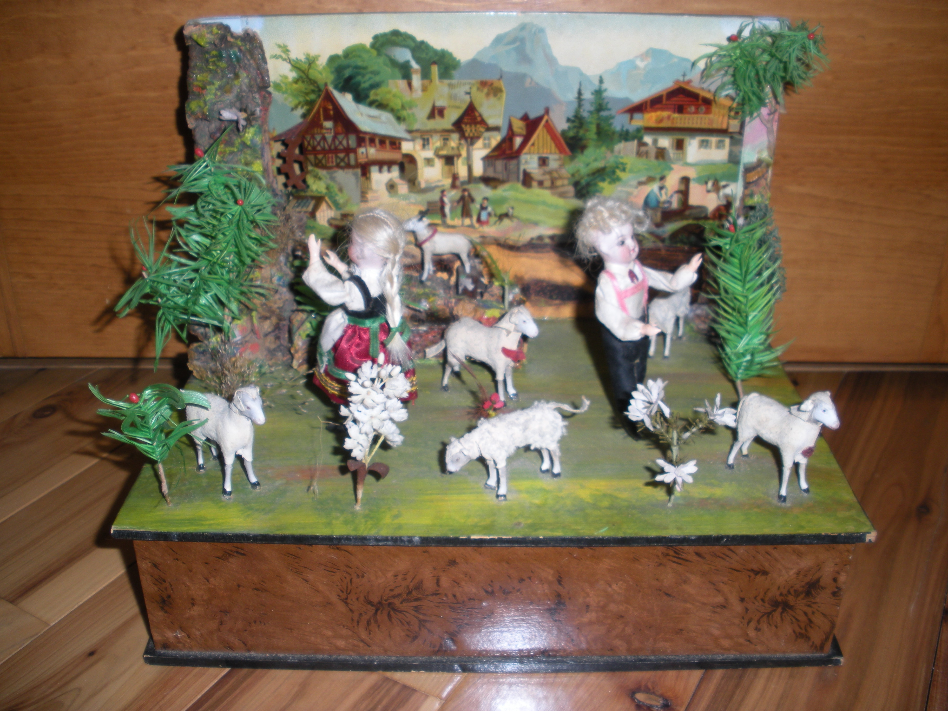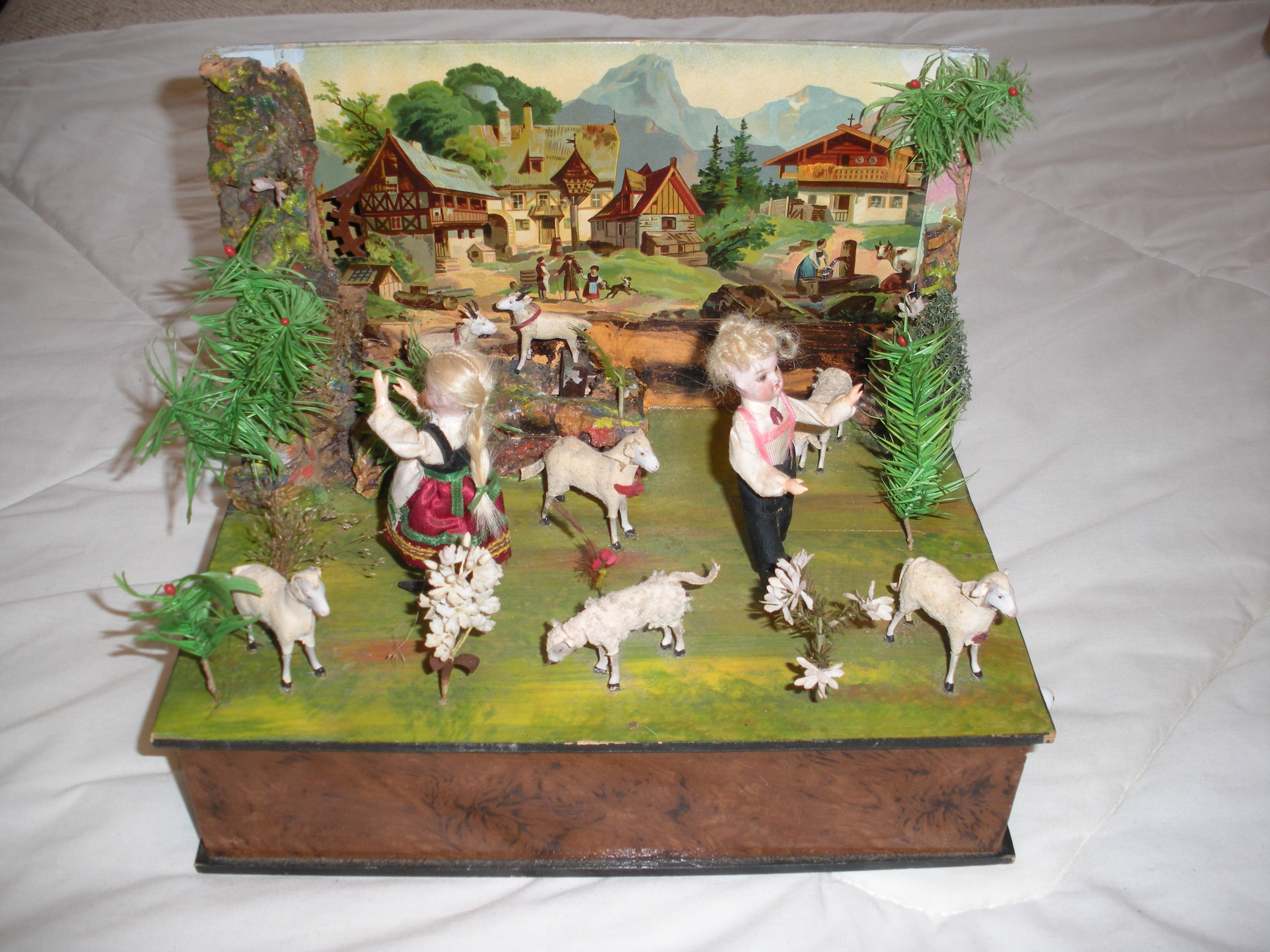 19th Century Antique German Crank Musical Farm Toy. It is believed to be made around 1872. The piece comes in its original box, which is numbered: 4010. It is in original condition. The hand made costumes are not faded and the goose down foliage on the trees is in tact. There is one lamb missing. This is apparent by where you can see were it was placed on the wooden floor in the back left corner of the toy.