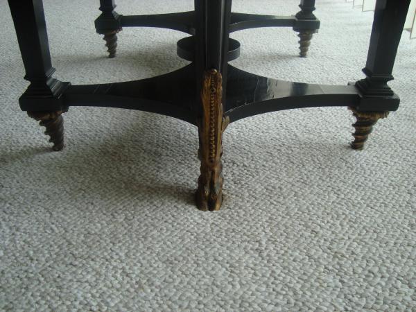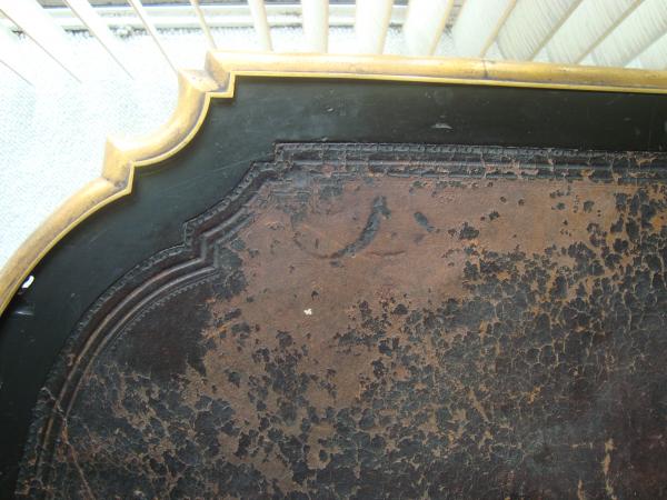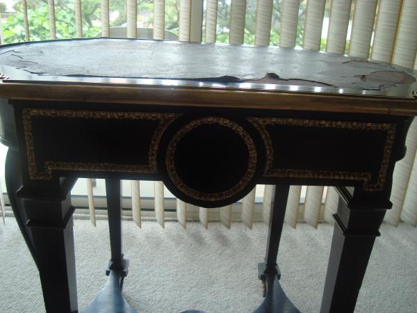 19th century ebonized leather top brass banded table with "holland & sons" stamped on top of drawer