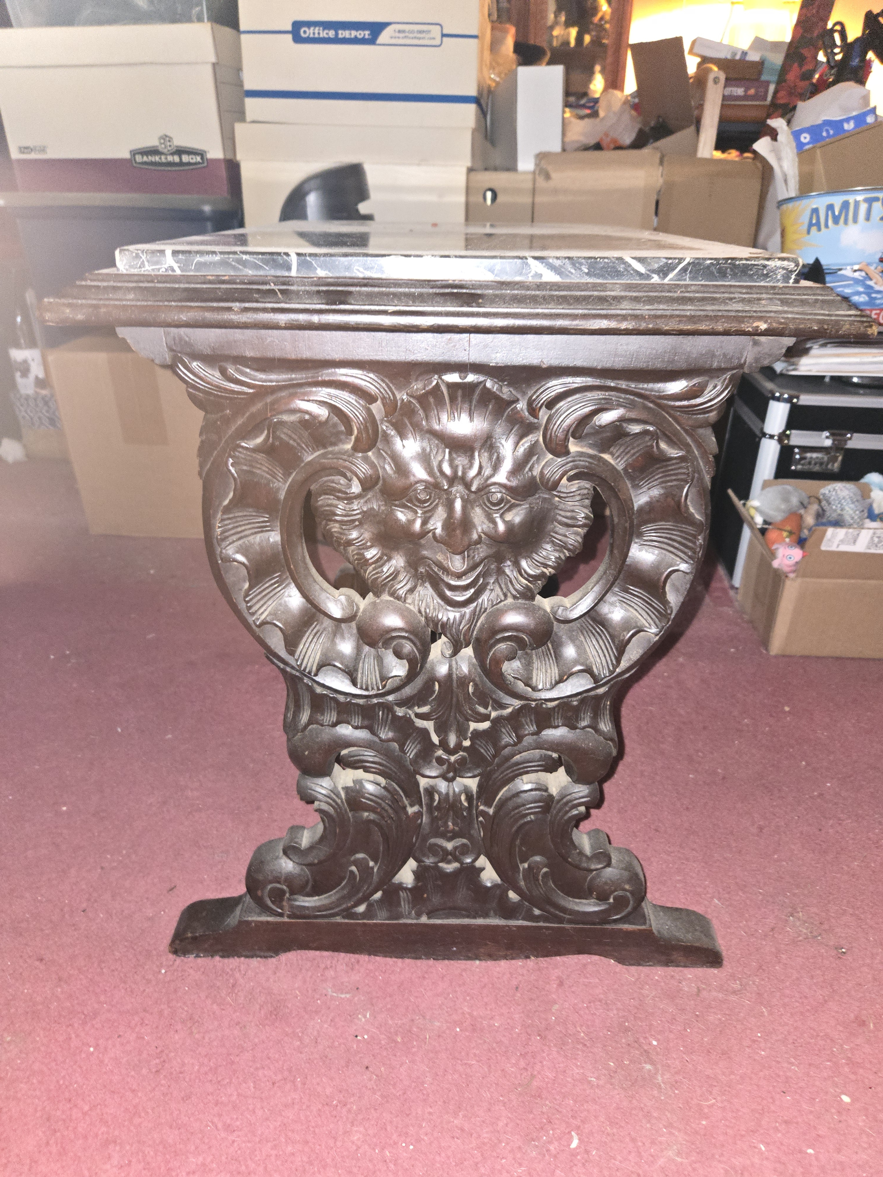 The ornate carvings and marble top are characteristic of 19th-century furniture design.