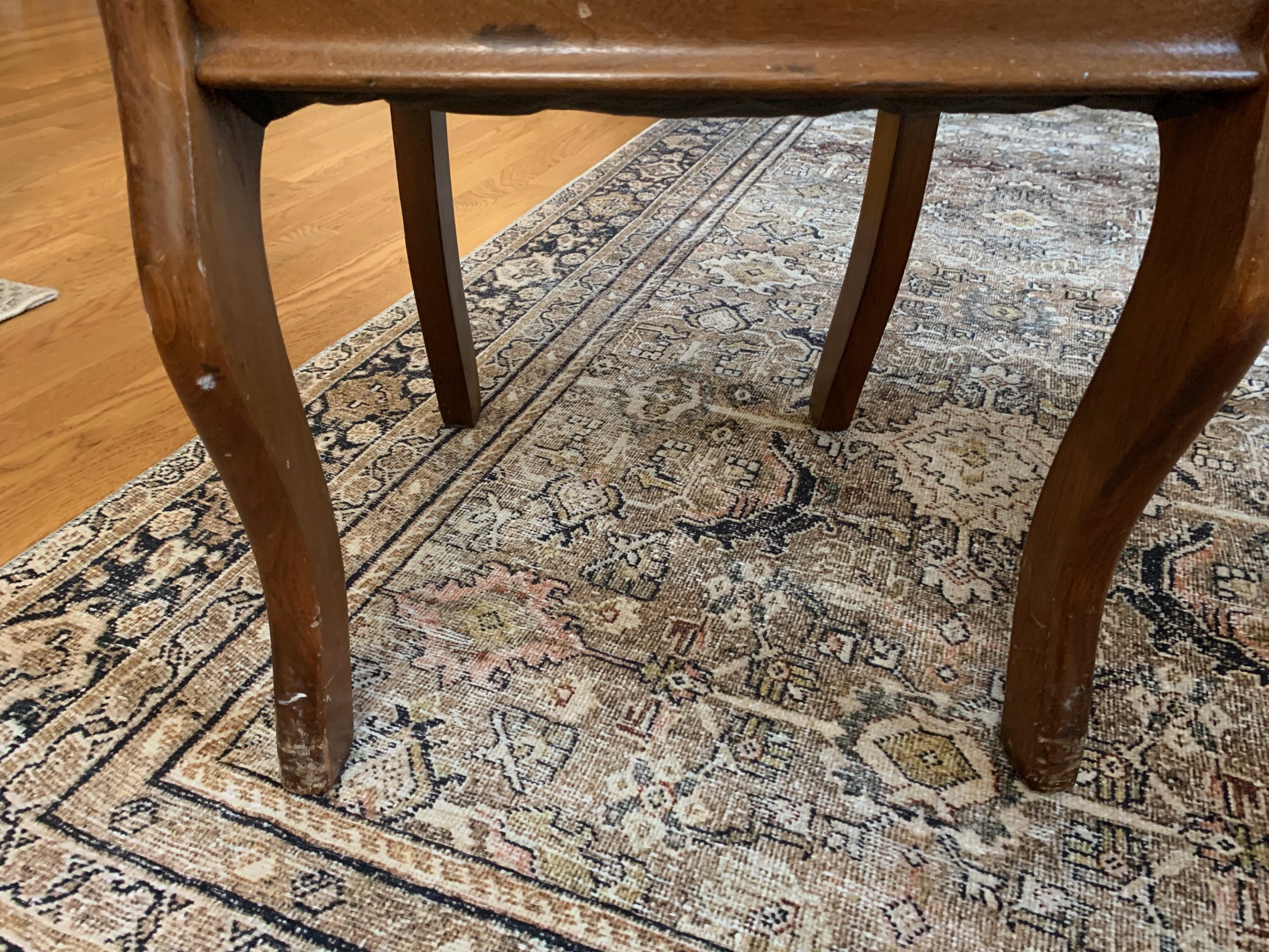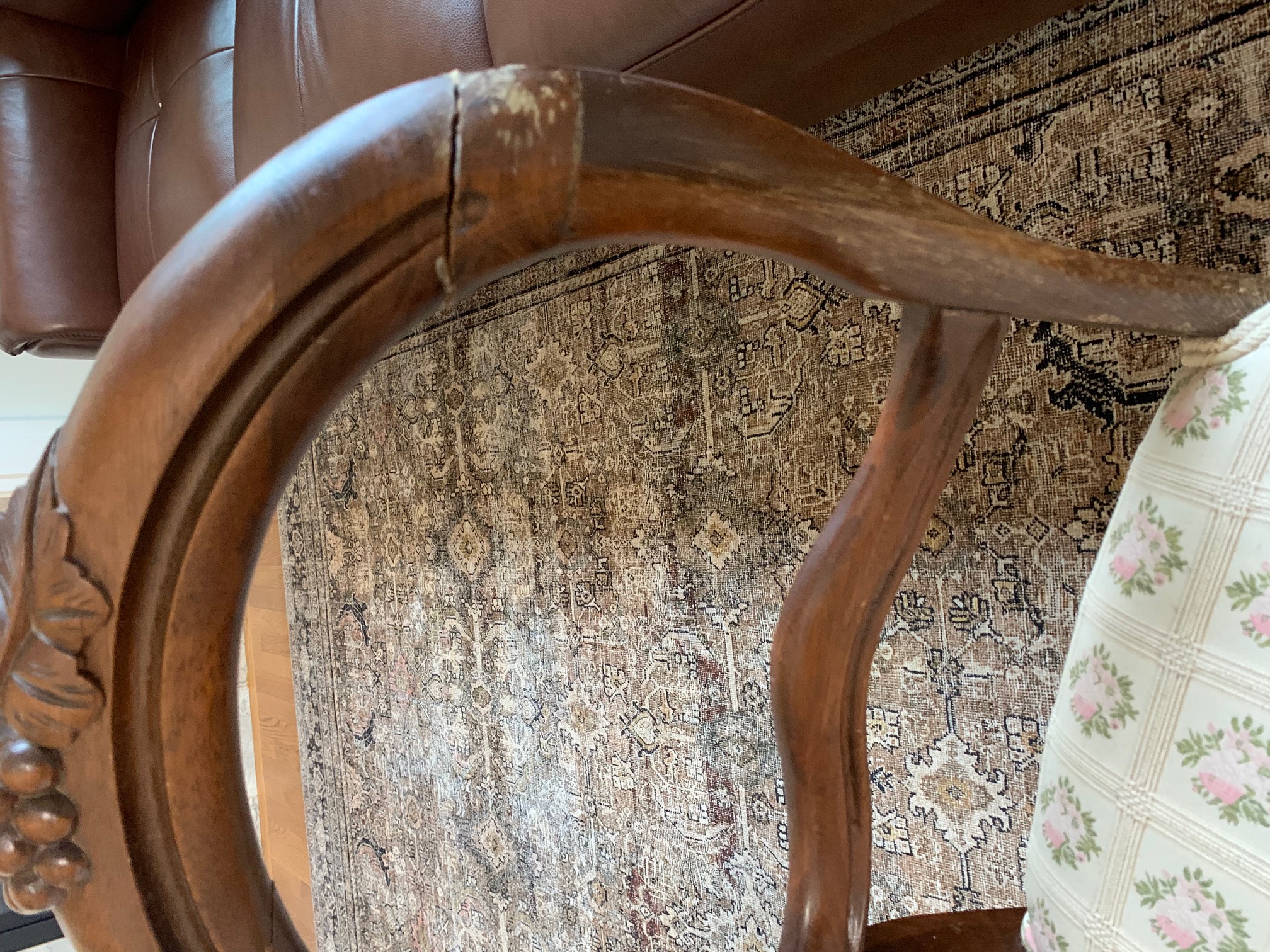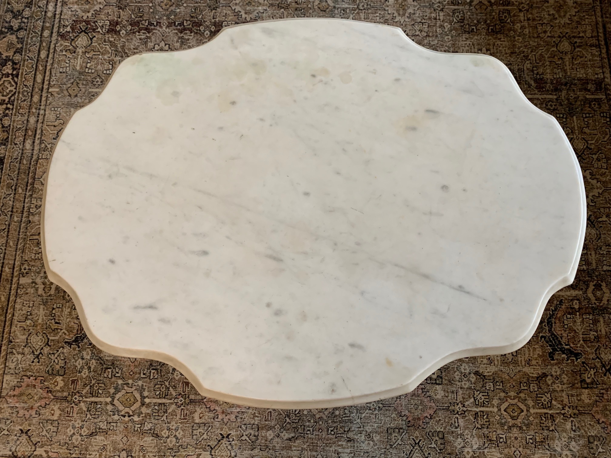 The table is in good condition, while the chairs are in fair condition. Notably, one of the chair backs has a repair that appears haphazard, indicating previous damage. The marble top shows minor wear, typical for its age, with some light scratches and discoloration.