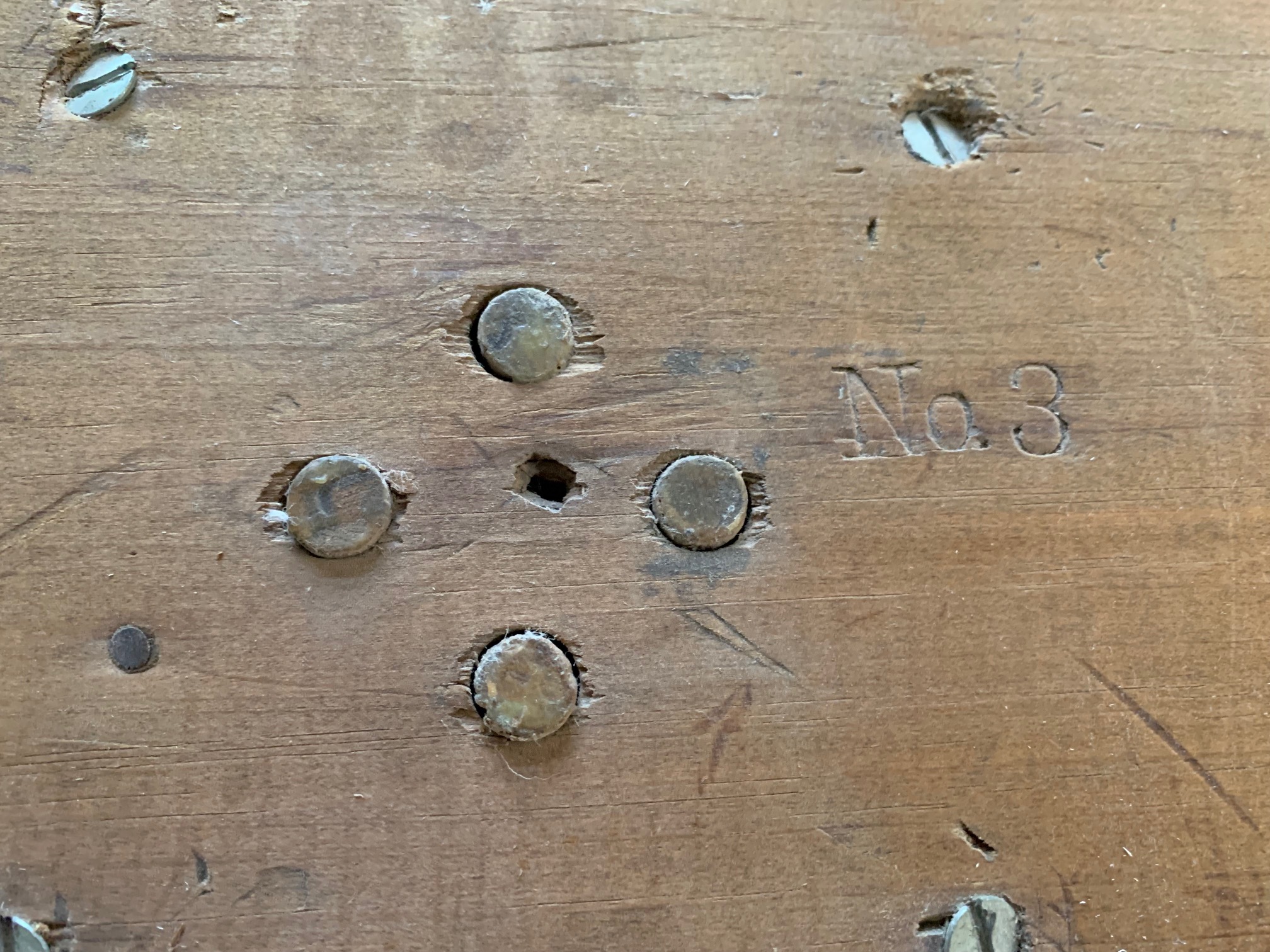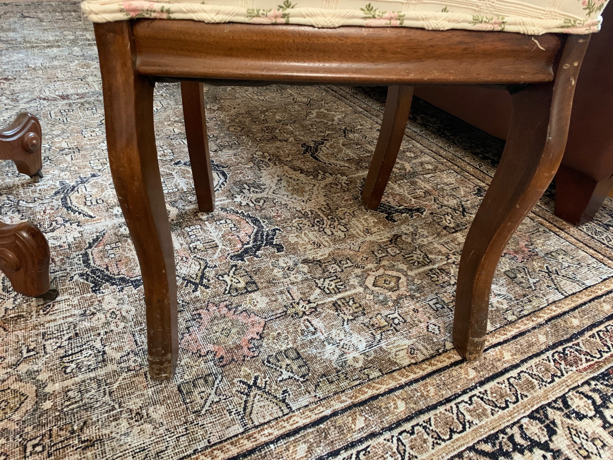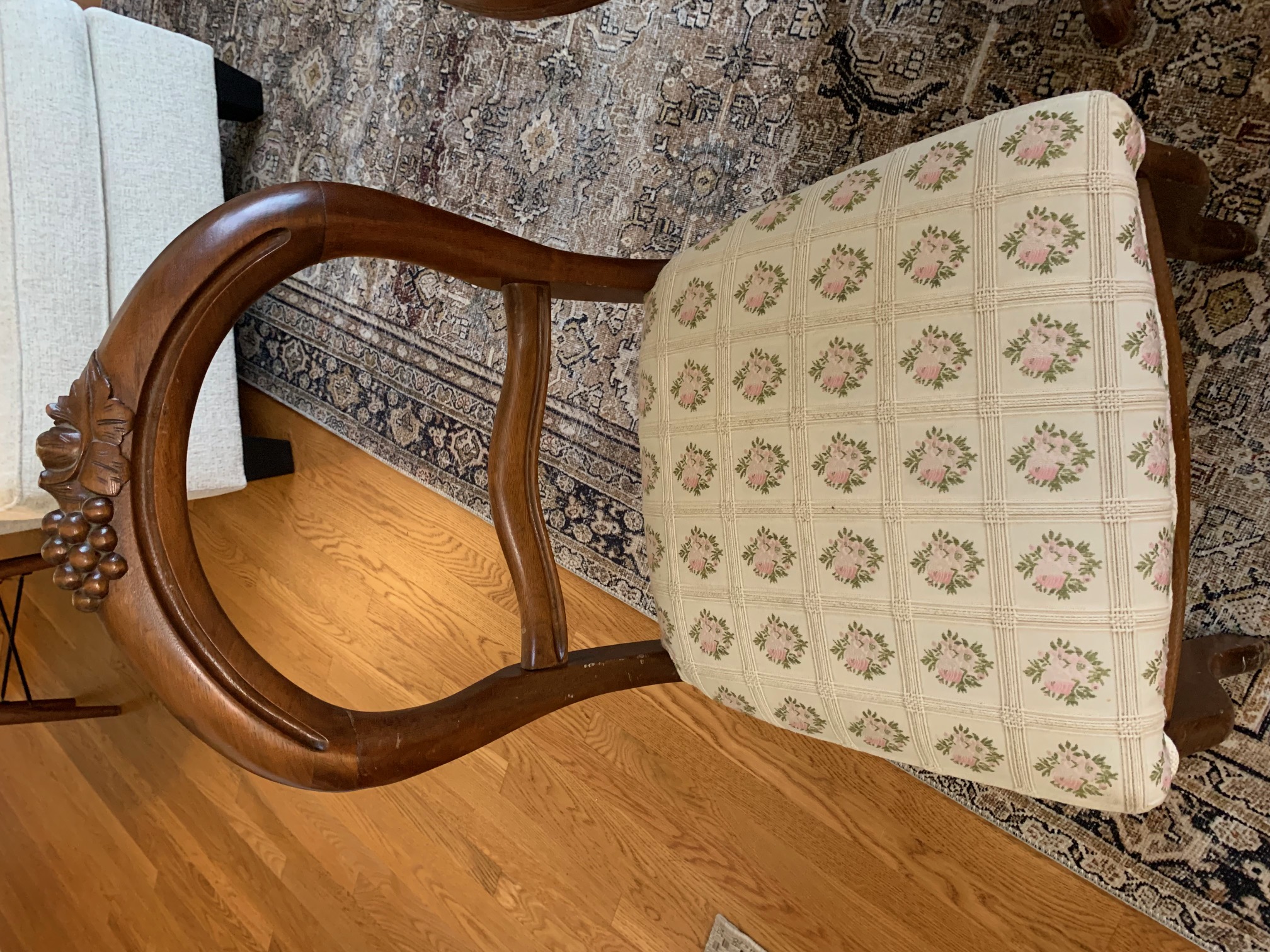 The table is in good condition, while the chairs are in fair condition. Notably, one of the chair backs has a repair that appears haphazard, indicating previous damage. The marble top shows minor wear, typical for its age, with some light scratches and discoloration.