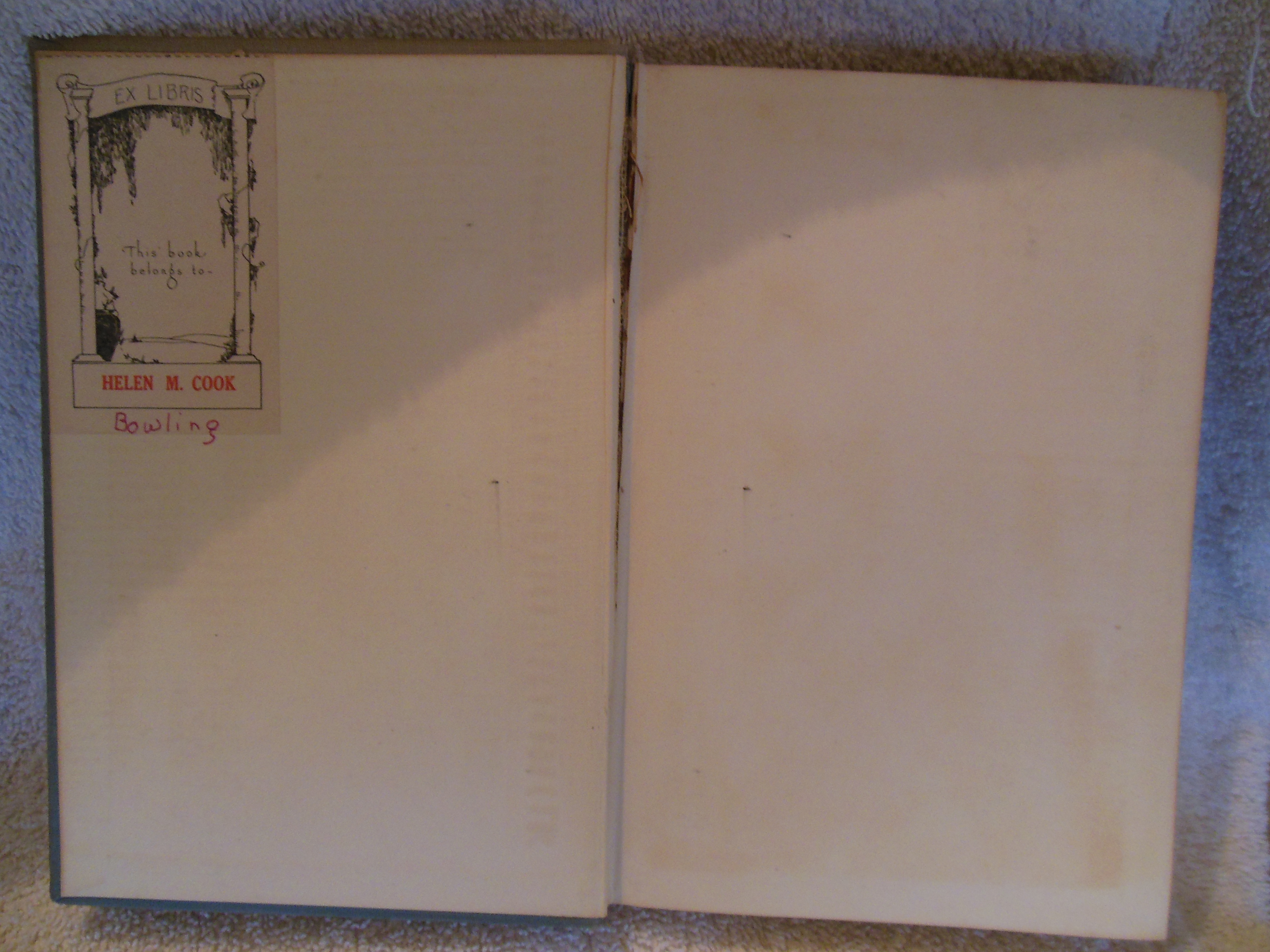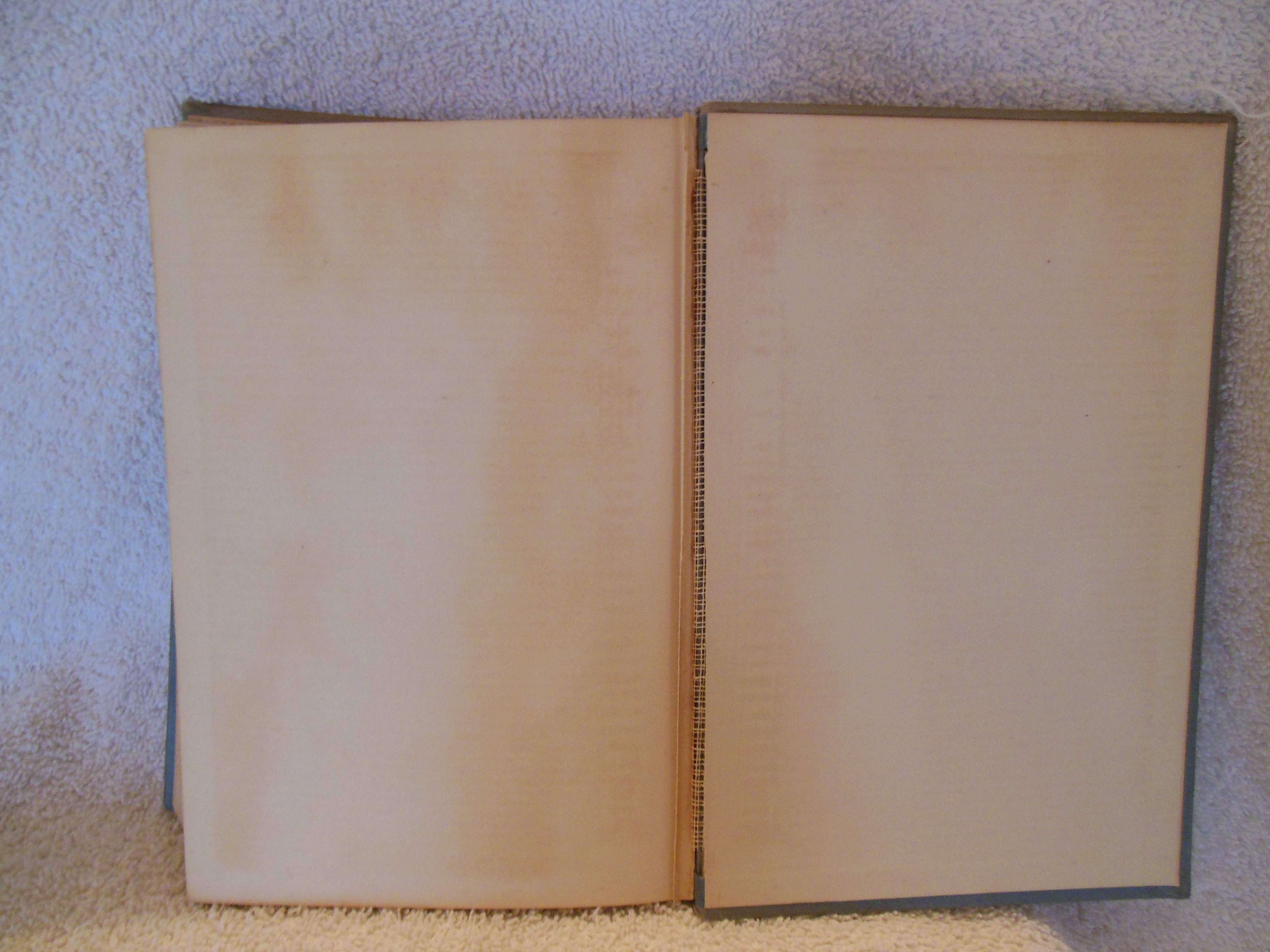 The book hardcover is in pretty good condition, very little fraying around the edges (only on the spin and the corners of the book). The spine is the worst part, it is discolored, has 2" tear on the top left side of the spine, and the top and bottom of the spine is worn. Inside the book there is a sticker placed by the previous owner on the upper left corner inside cover. You see where the spine is loose inside the front cover and inside the back cover, but all the pages are securely attached, clean, no folds, and all 383 pages are accounted for and in very good condition.