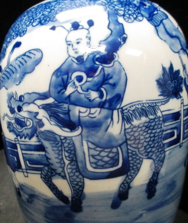 With Servants fanning him the Young Prince rides a Foo Dog, The other has the Emperor surrounded by immortals holding a small child.
