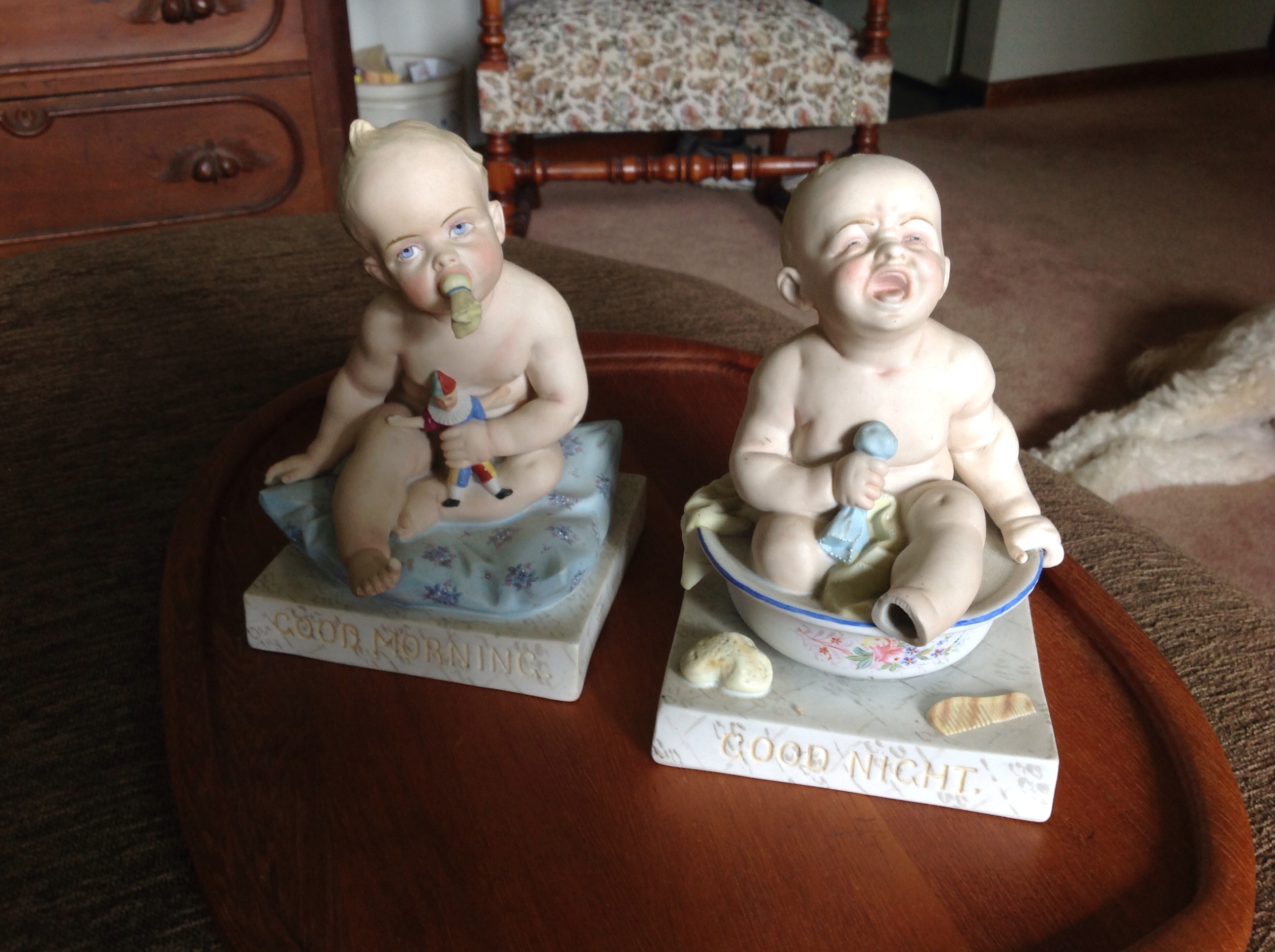 These "Piano babies" generally are porcelain and tend to date from the late 19th to early 20th Century and are German in origin, the pair would go at auction for about $150.00