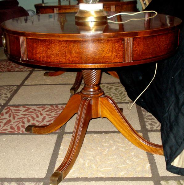 It's a Federal Revival Style " Drum Table" named after its shape. These date from the second to third quarter of the 20th century. Value for them at auction is generally under $150.00