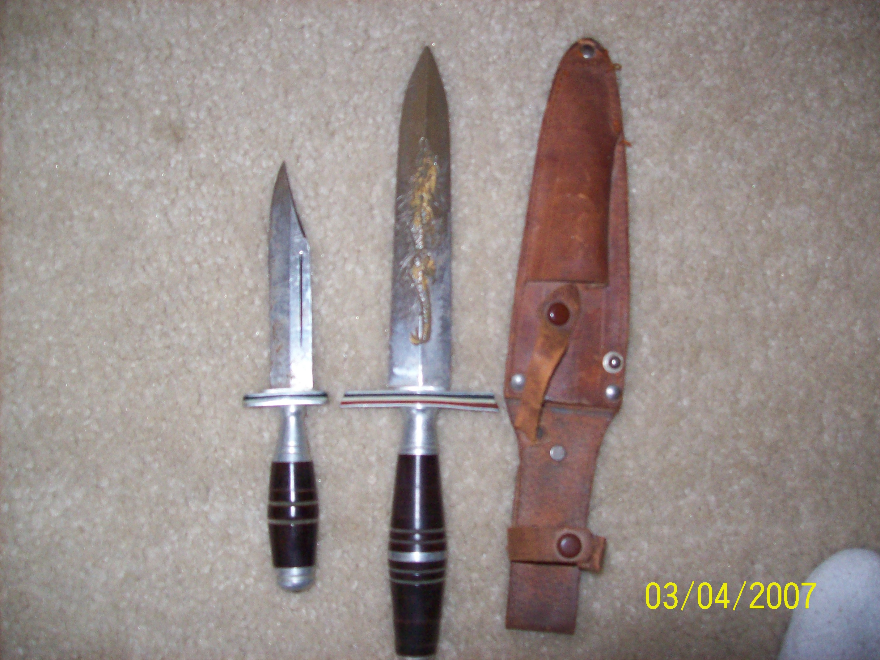 large knife has a dragon on the blade,wooden handle and the handle seems to have layers . the guard has red white and green colors on it. the same with the small knife.there is a pin or peg of some sort on the handle end of each one as if to keep it together.the leather case has two pouches.the small one only has green and white around guard