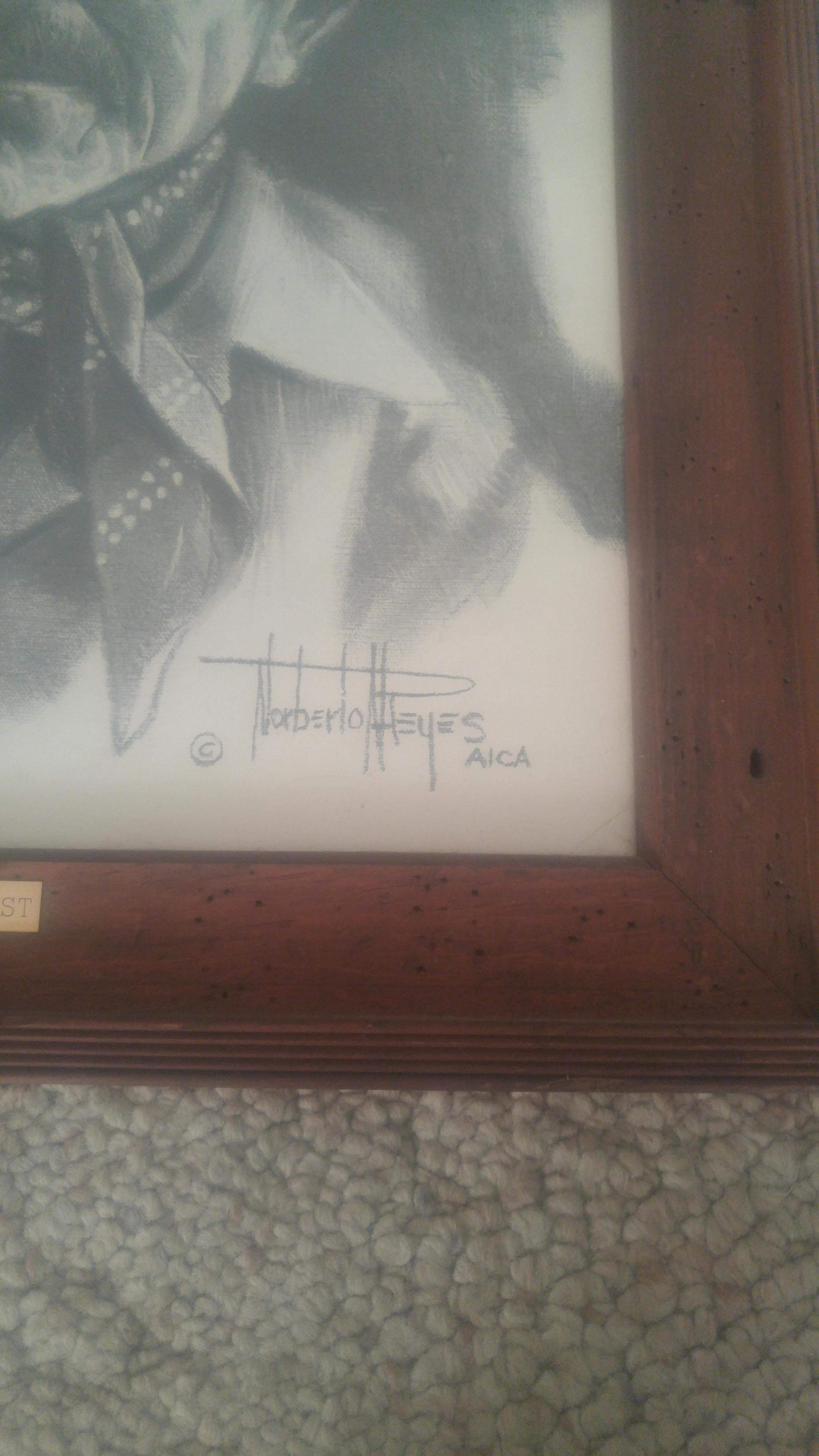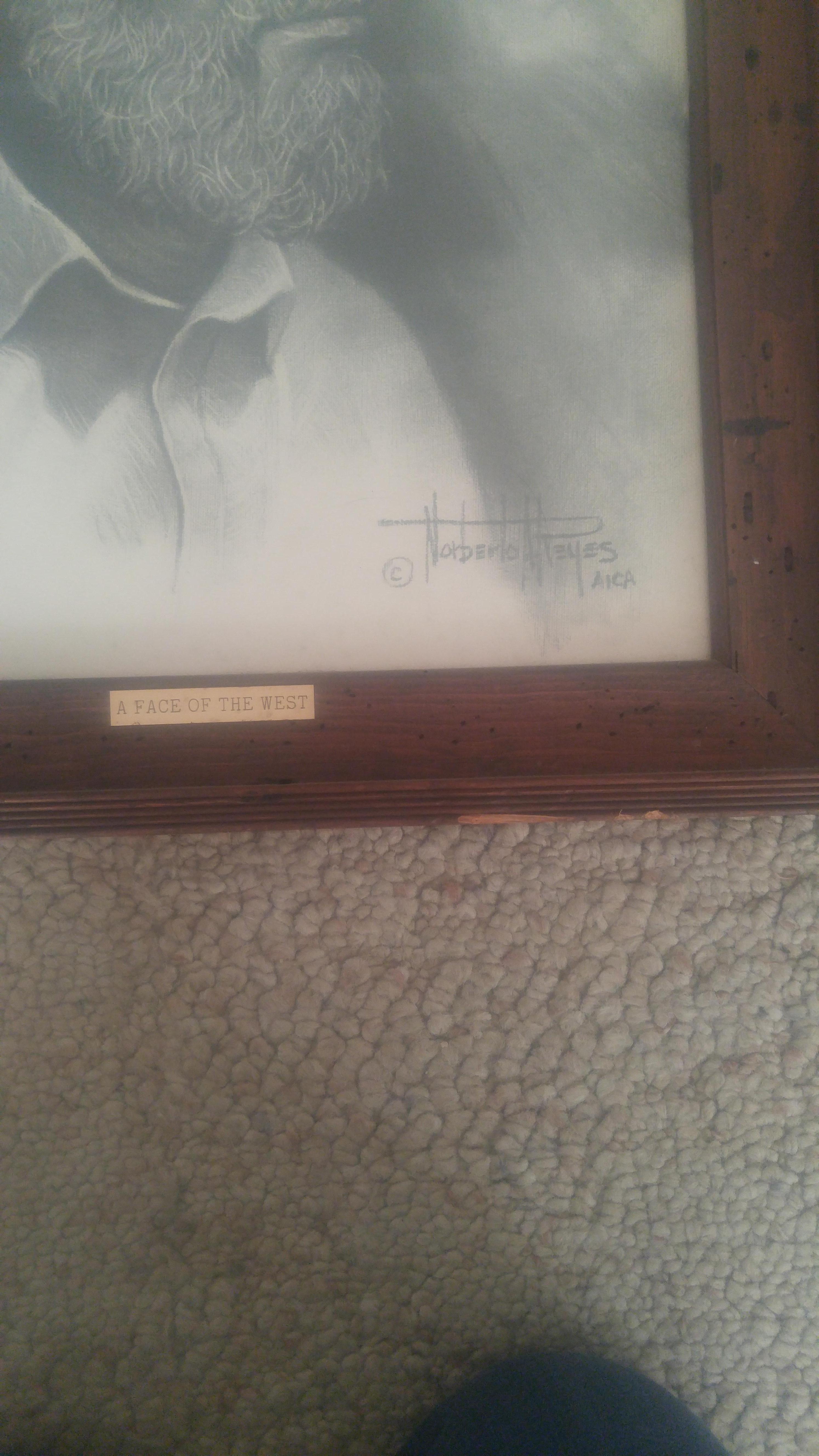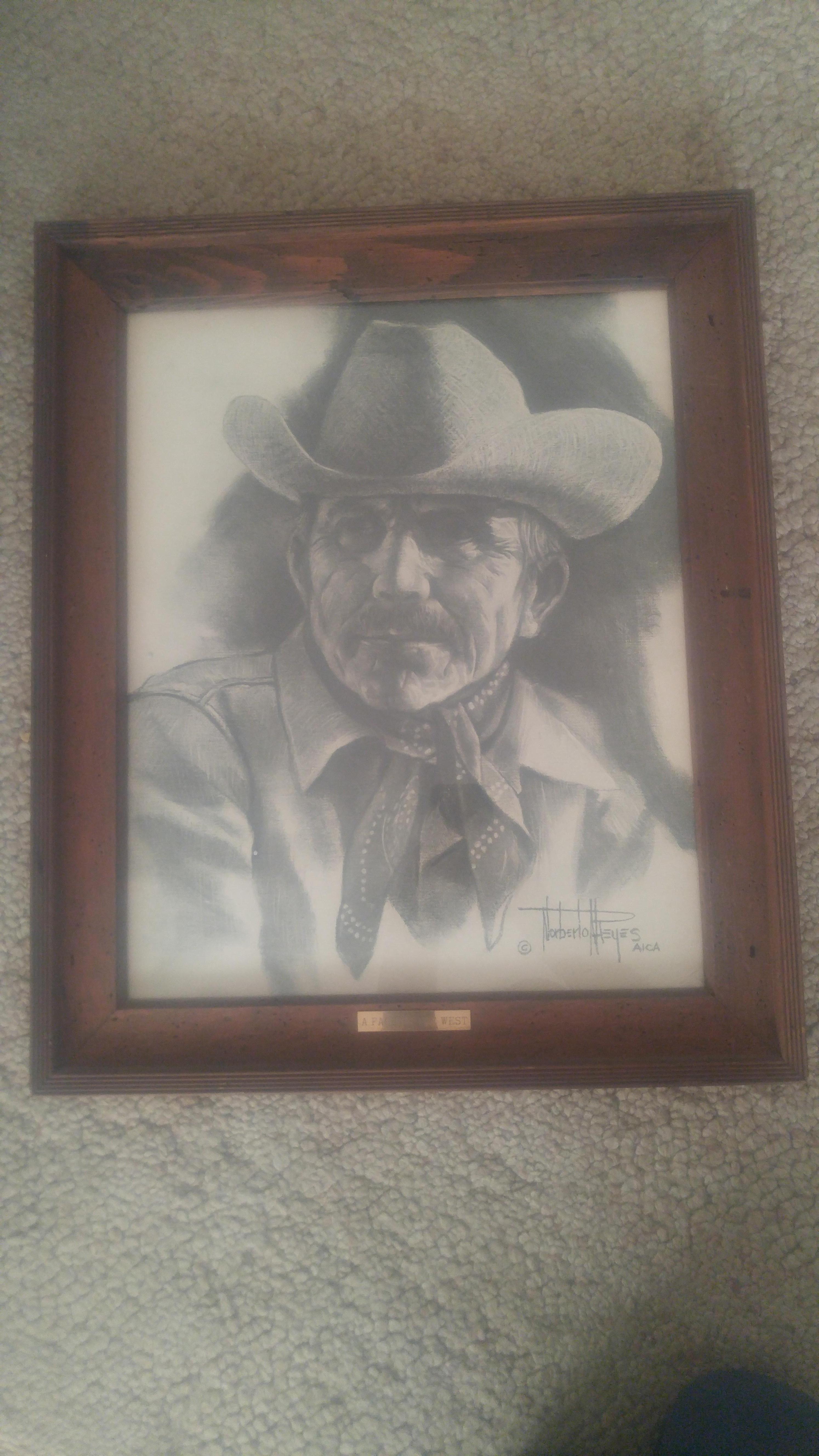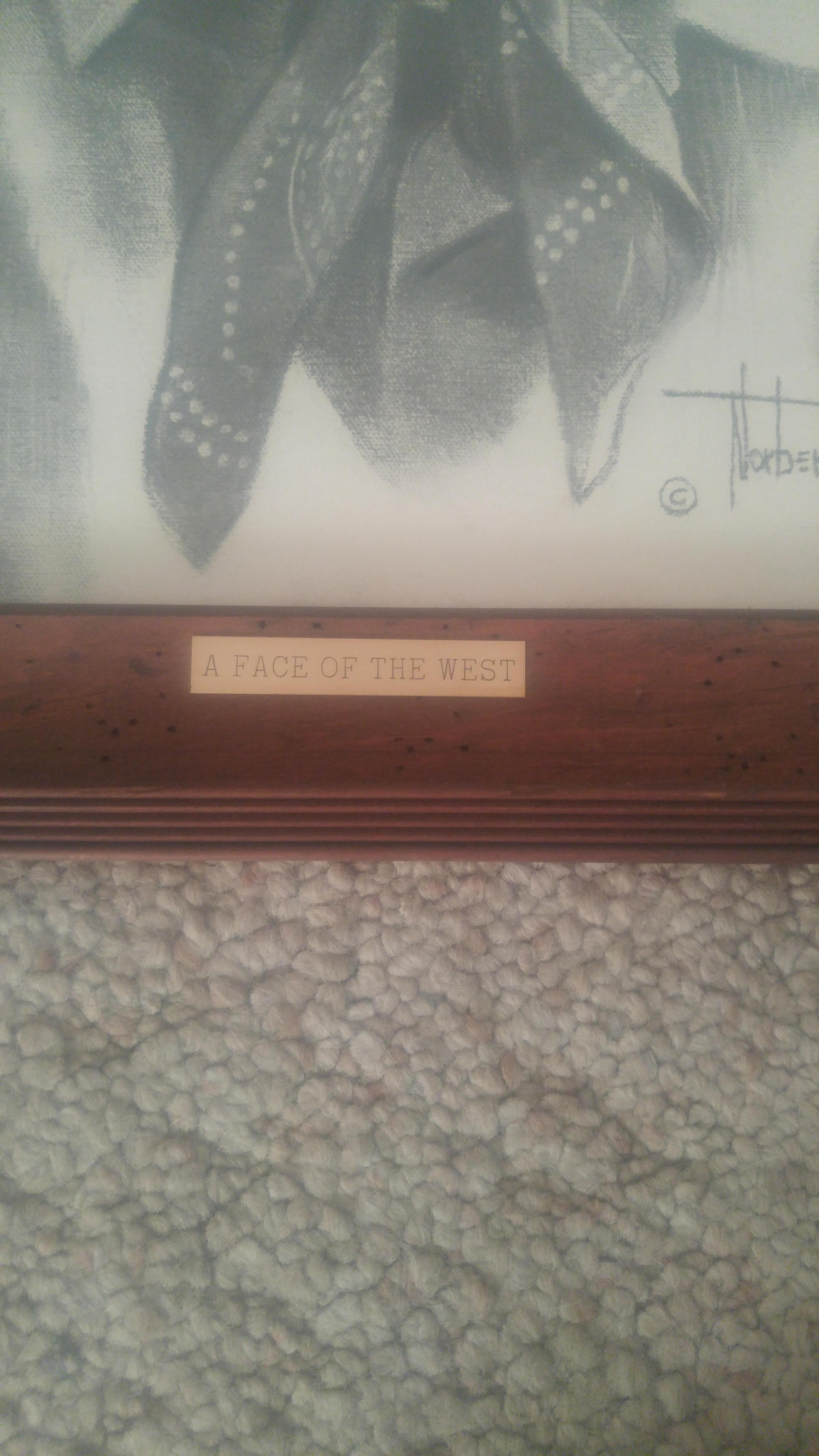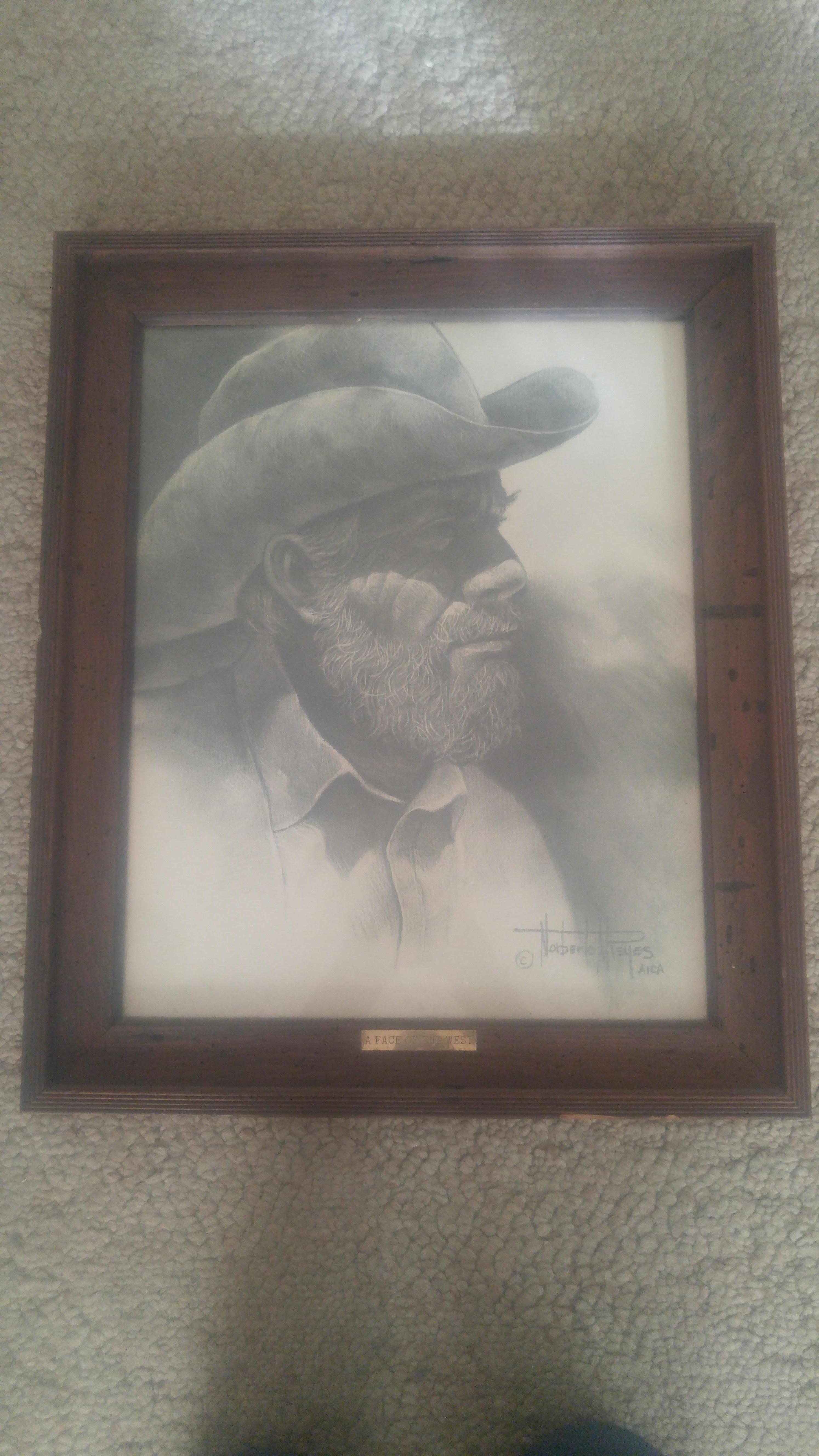 They are both a black and white charcoal drawing of an older cowboy on 20' by 16' sketch paper. It has a label that says A FACE OF THE WEST