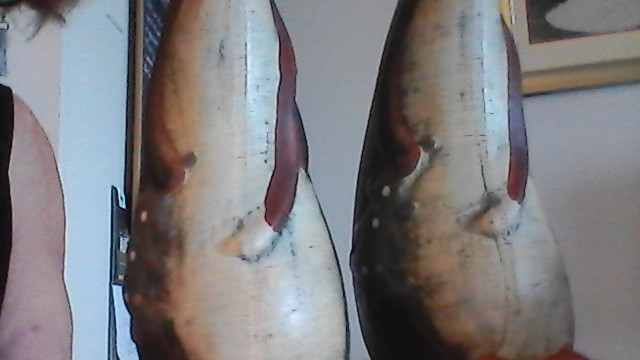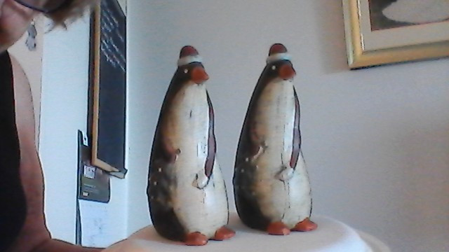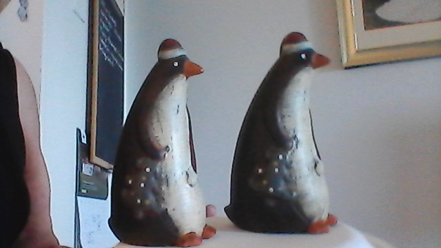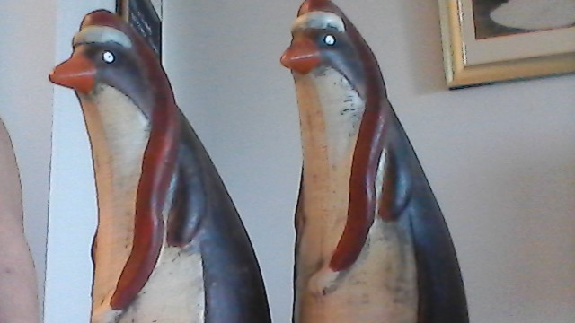 THESE 2 PENGUINS SEEM TO BE MADE FROM TERRA COTTTHEY HAVE THE y-1725-IS IMPRINTED ON THE BACK TAIL-THE #S 1777 AND 1771 ARE ALSO ON THEM-CAN MAKE OUT THE NAME _i THINK IT IS vLADAMERE-they arechristmas penguins with a lot of markings that have been blocked out-and are 7 in.tall==4 in.long==3 in wide-also 1 has the 1 toe chipped and the paint off tail-the other just a little paint off tail-they are orange feet-and seem to have a reddish orange dark cap with wh trim-the front tummie looks a beigh and the back is a deep brown that has been covered with lots of black-i would appreciatee anything you can tell me about these-artist-is this terra cotta-and value please/thank-you so much for your time and great expertise-cathy