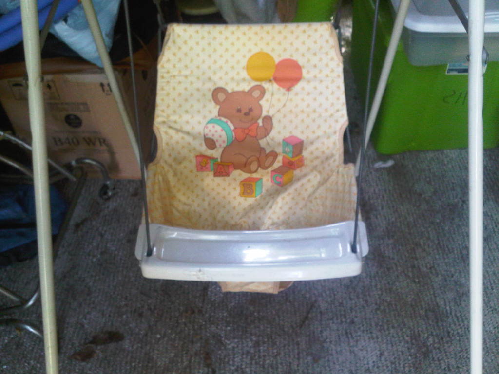 My wife and I also bought the swing with the bear on the seat back in 1985 when our daughter was a baby. I believe the green swing dates to the early 1970s, the same as your walker-bouncer. Earlier Graco swings from the '60s and on back had chains in front and rods in back to support the seat. Later swings like these two had metal rods front and back.