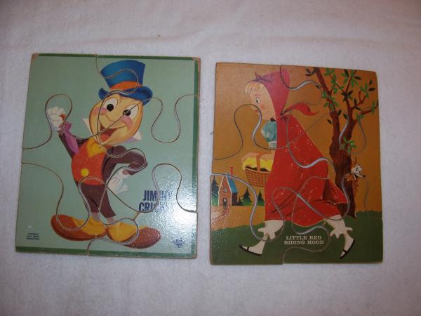 Each puzzle has the same amount of pieces (6), the puzzle pieces are identical in shape, each puzzle has a tip broken on one puzzle piece in the exact same place, only one puzzle says Walt Disney (Jimminy Cricket in the lower left corner), both puzzles are in fair/good shape and are flat/not warped. I've been checking ebay on/off for awhile and have yet to find simple puzzles like these