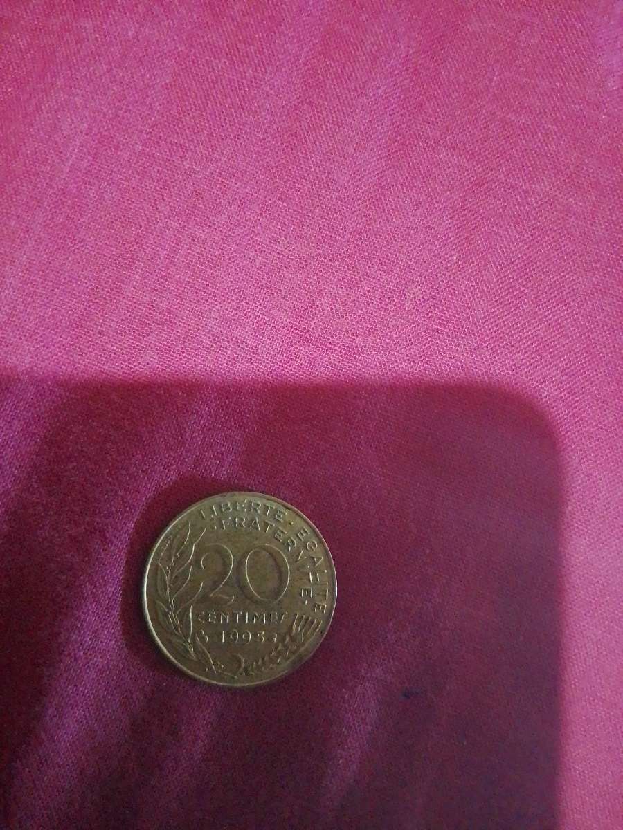 Physical Description: This is a 20 centimes coin from France, minted in 1993. The coin features a diameter of approximately 22 mm and a thickness of about 1.5 mm. It is made of brass, giving it a golden hue. The obverse side displays a profile of Marianne, a symbol of the French Republic, along with the inscription 'REPUBLIQUE FRANÇAISE'. The reverse side features the denomination '20 CENTIMES' along with the year of minting and the motto 'LIBERTÉ, ÉGALITÉ, FRATERNITÉ' encircled by a laurel branch.