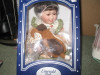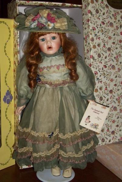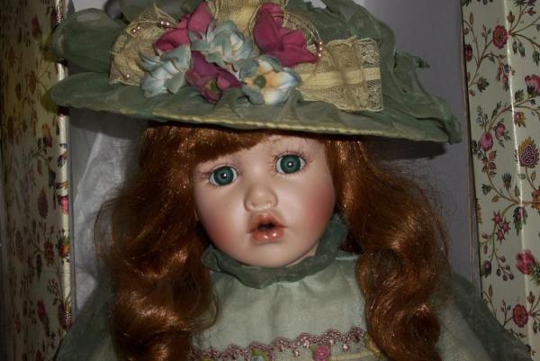 "Angeline" is a 21 inch Porcelain Doll from the Emerald Doll Collection. She's a Green eyed Red Headed Little Girl. Eyelashes look like real hair. She wears a green dress and matching hat. Both are adorned with brown and beige lace and pink and blue flowers. She wears off white leather like shoes and knee high stockings. She is complete with a stand and the original box. Included is the Certificate of Authenticity. She is in Mint Condition, Brand New, In the Box.