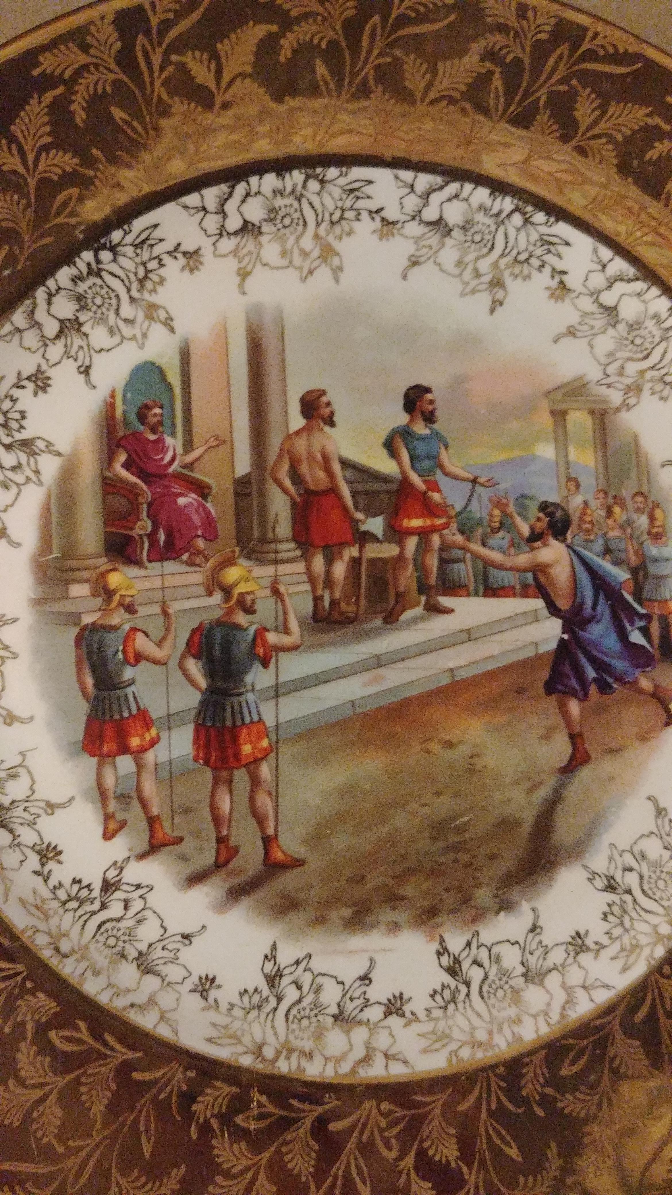 Est Value: $20 - $40 US based on demand. Plate value has dropped considerably compared to 15 years ago. If this piece had a manufacturers mark it would add value to it. Many of these plates can be picked up at auction for a dollar or two .. with the Roman scene it can appeal to a larger number of collectors. I have had this with similar egyptian themed pieces.