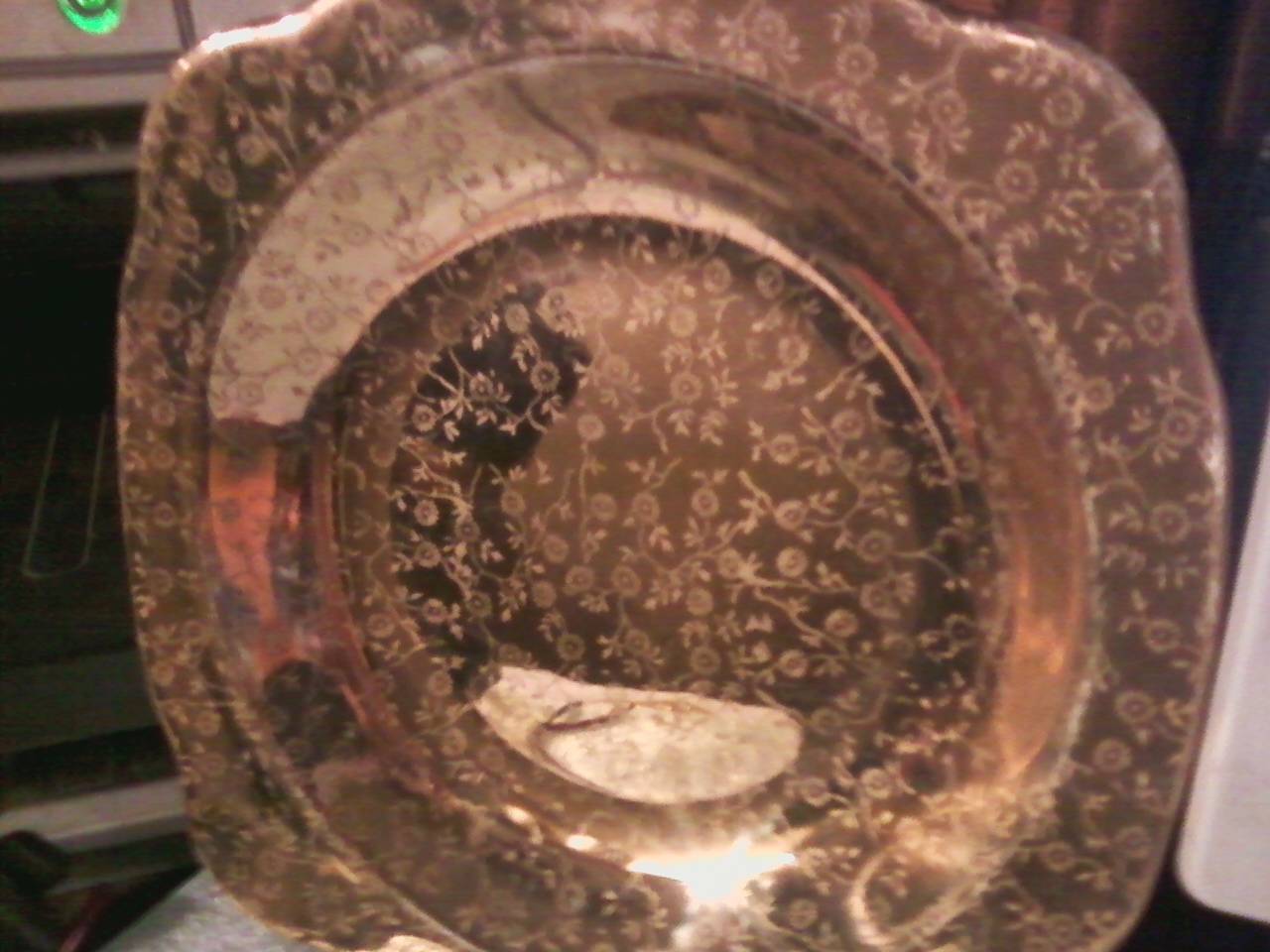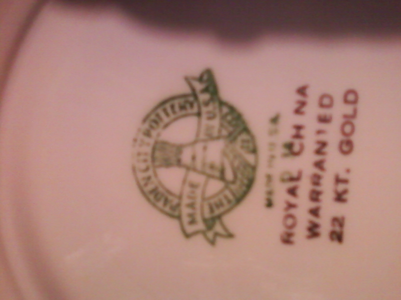 square outer rim with round seat deep yellow gold over front of plate with lighter gold flowers with vine and leafs covering front over deeper gold with lighter gold on back china looks crackled with green stamp sayin the padden city pottery co. in circle and in ribbon says made in usa and under stamp says made in usa again then royal china warrantied 22 kt. gold and i believe it says D38 or D34 or D36 its difficult to make out. I would like to know what it is worth.