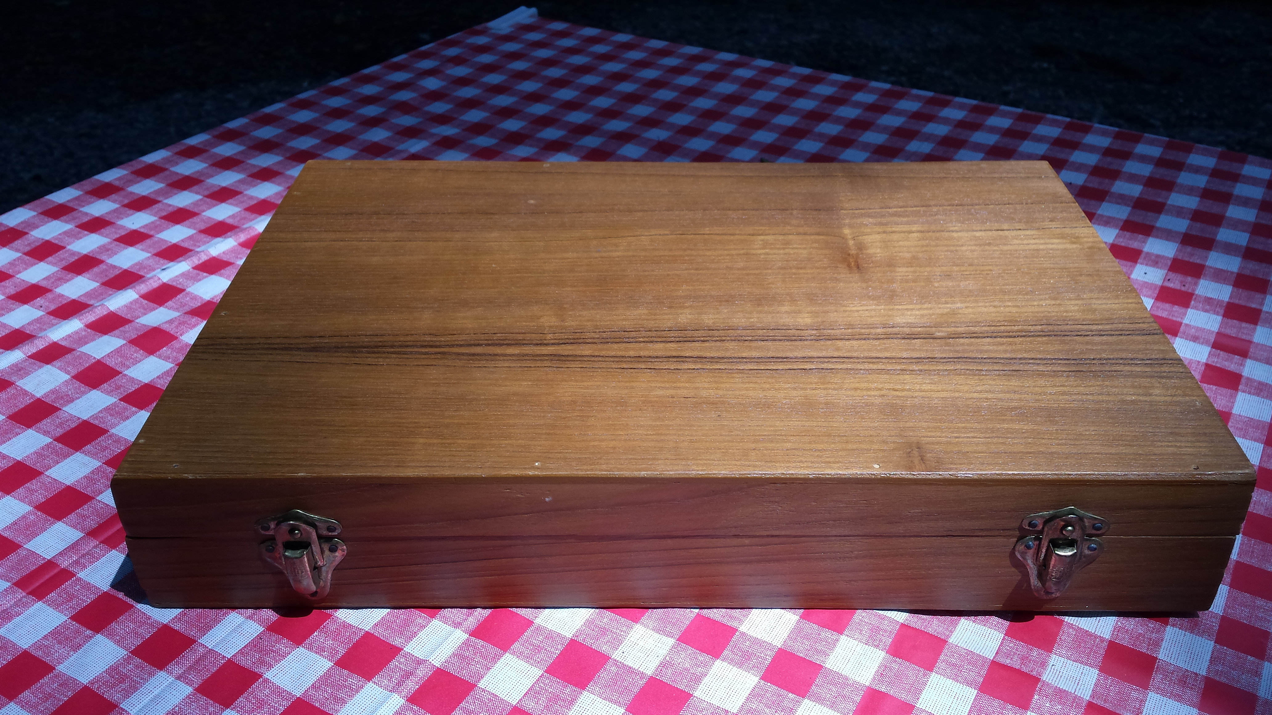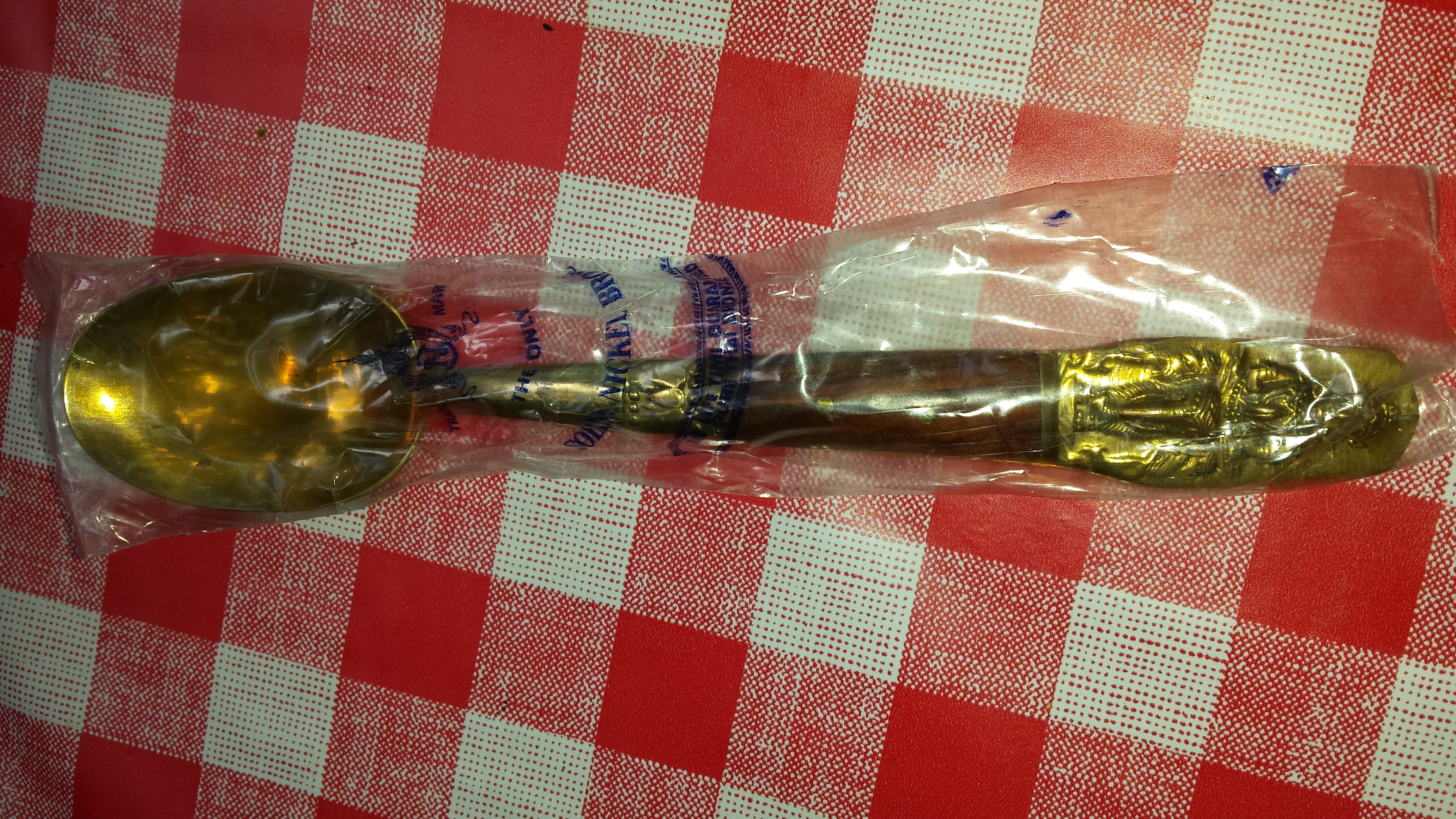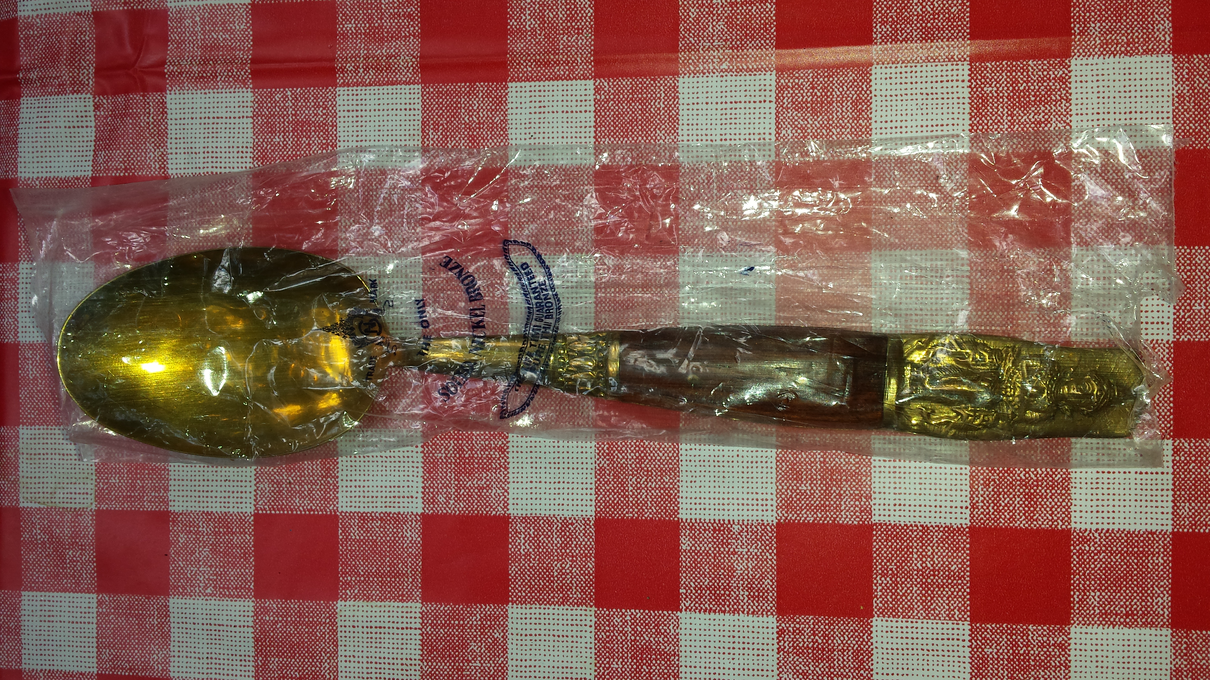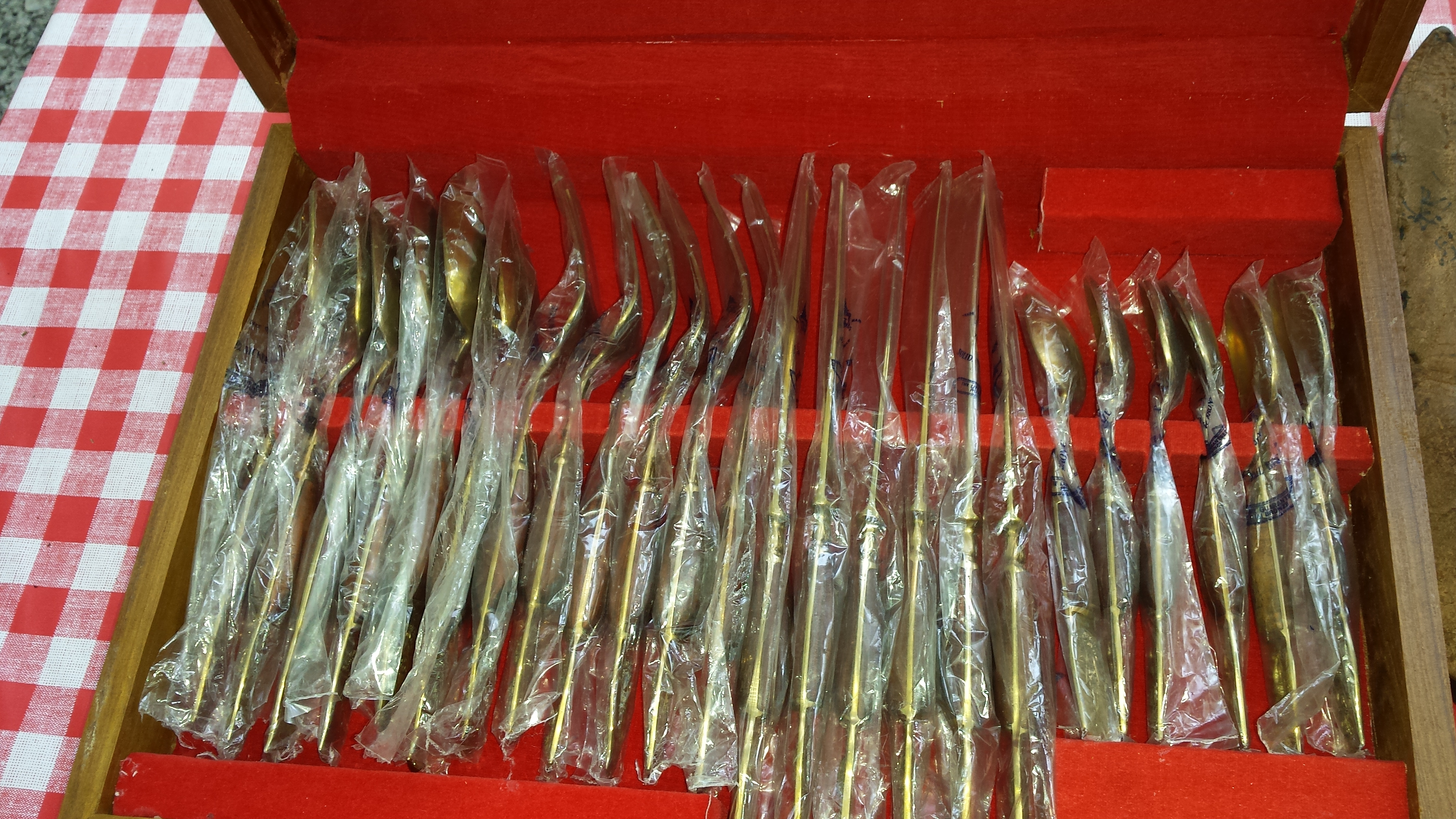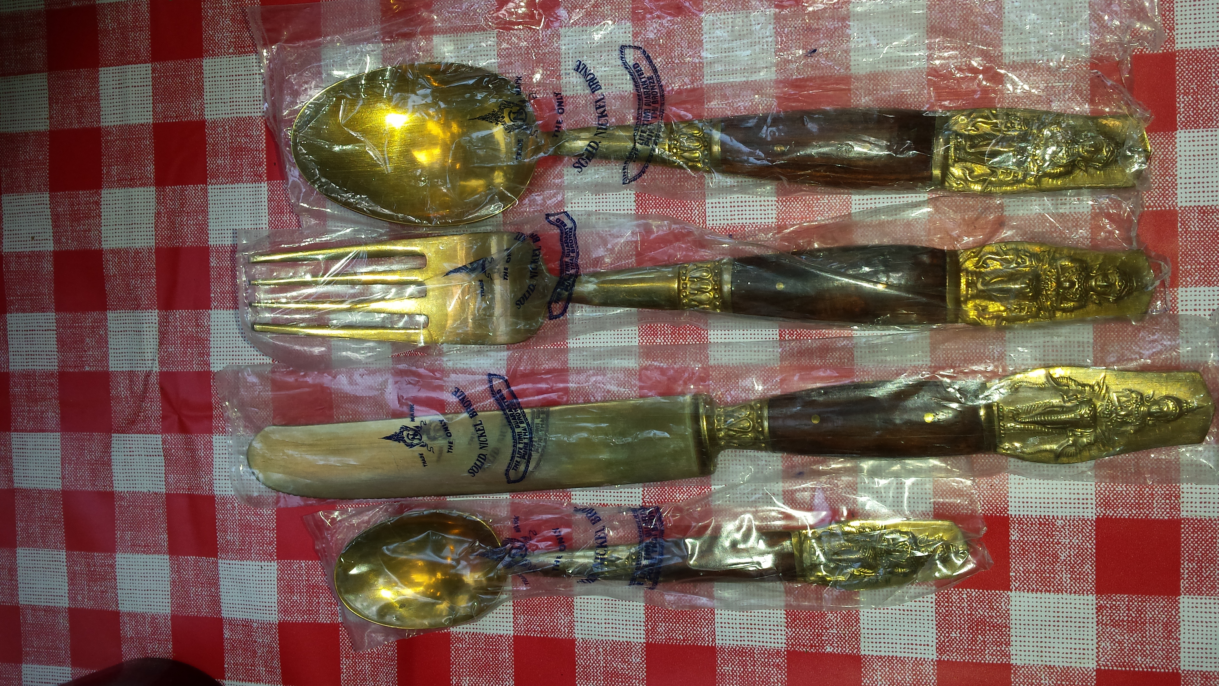 24 piece set of Thailand nickel bronze flatware with wood handles and Buddha on the end. Still in plastic and wood box. 6 pieces of each.
