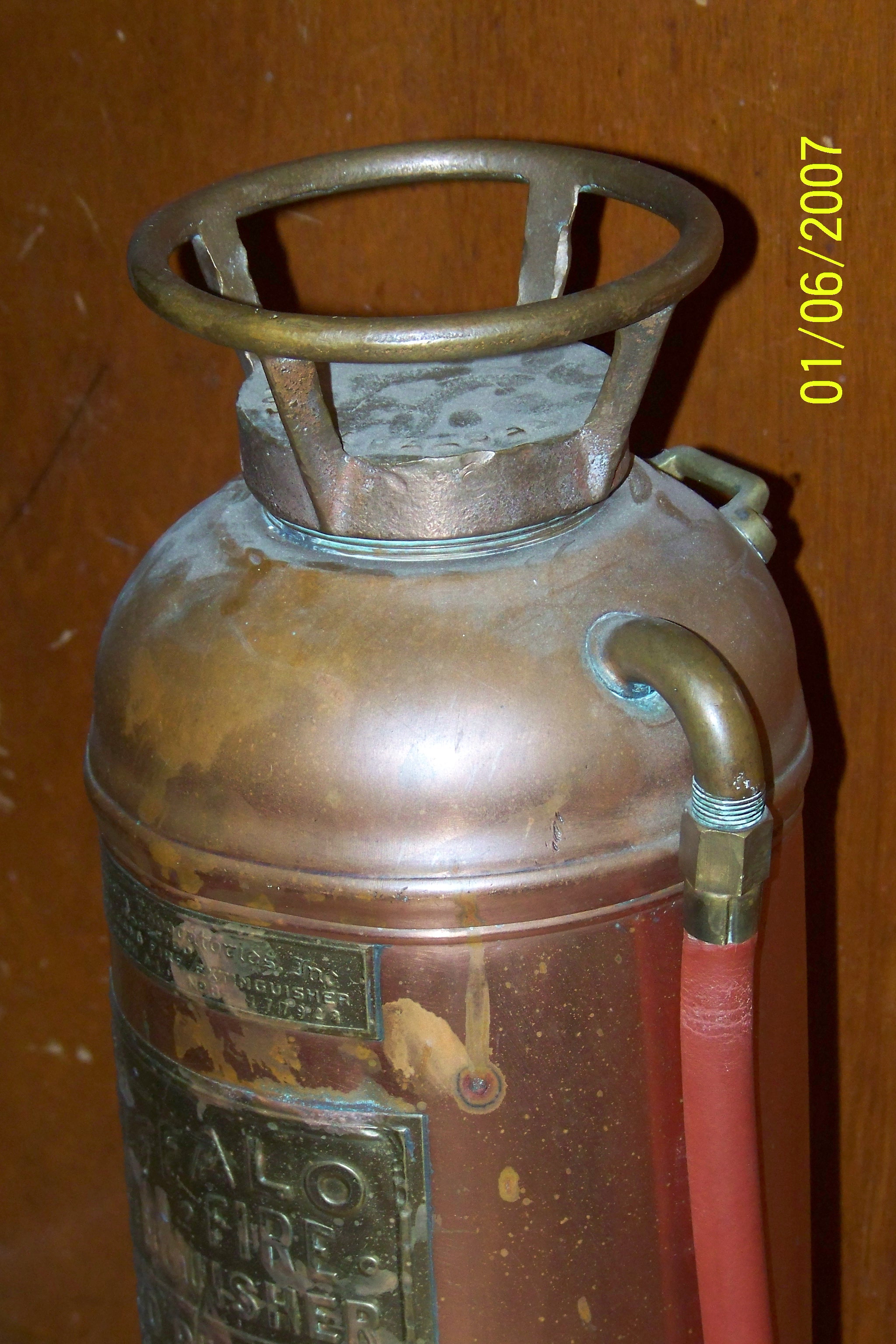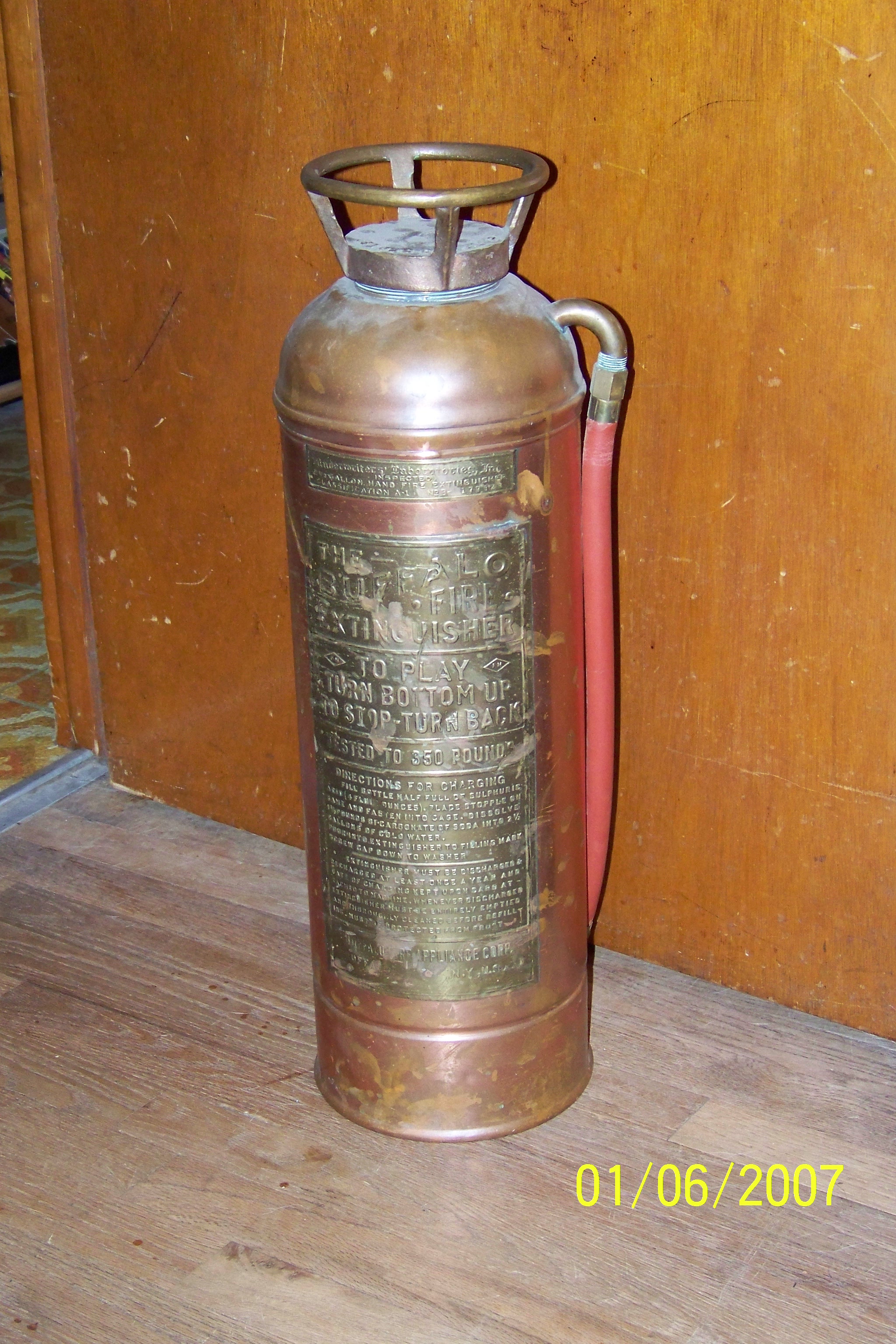 This is an older fire exctinguisher made by Buffalo Fire Appliance Corp, inspected by Underwriters Laboratories, Inc. 2 1/2 gallon hand fire extinguisher. Classification A-1, No. B- 177928, tested to 350 pounds.;