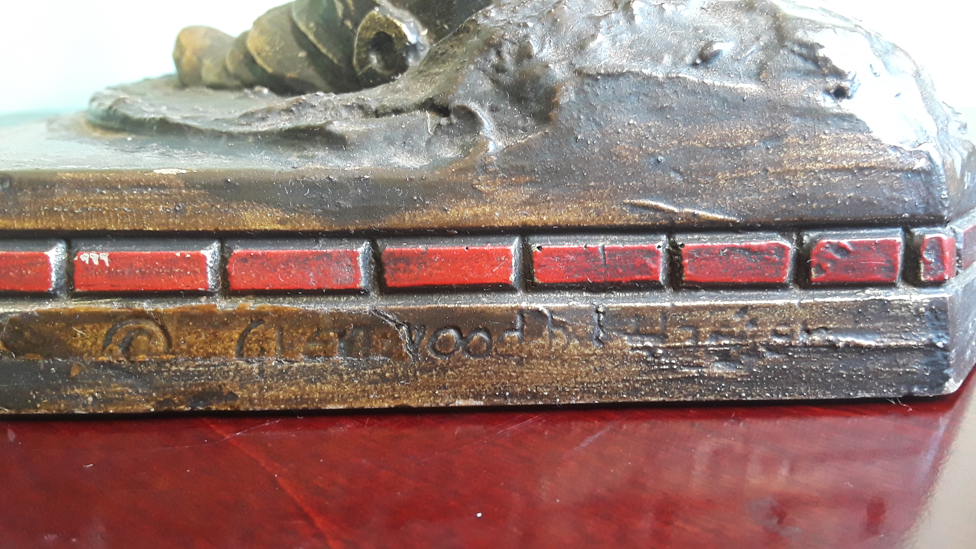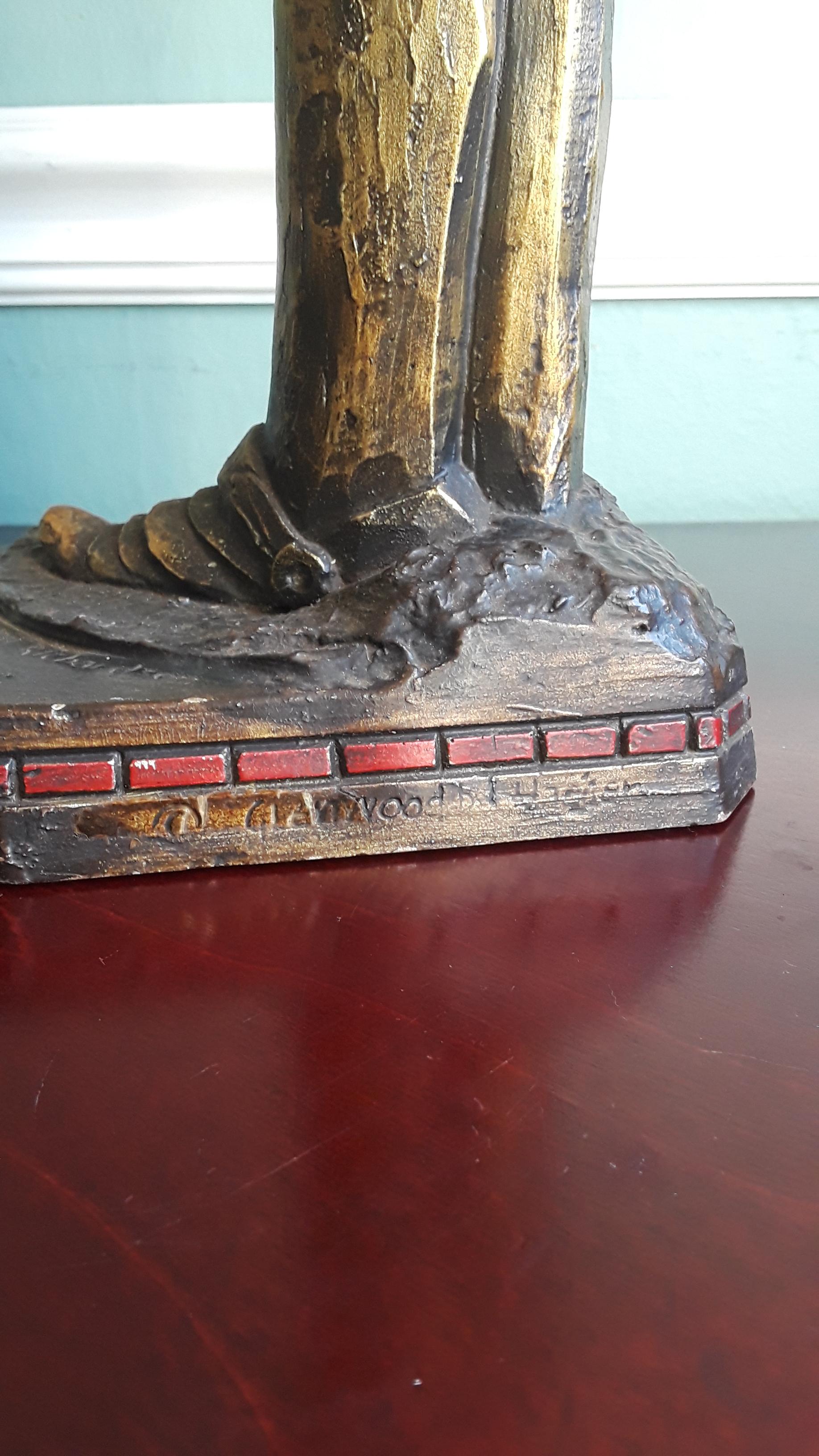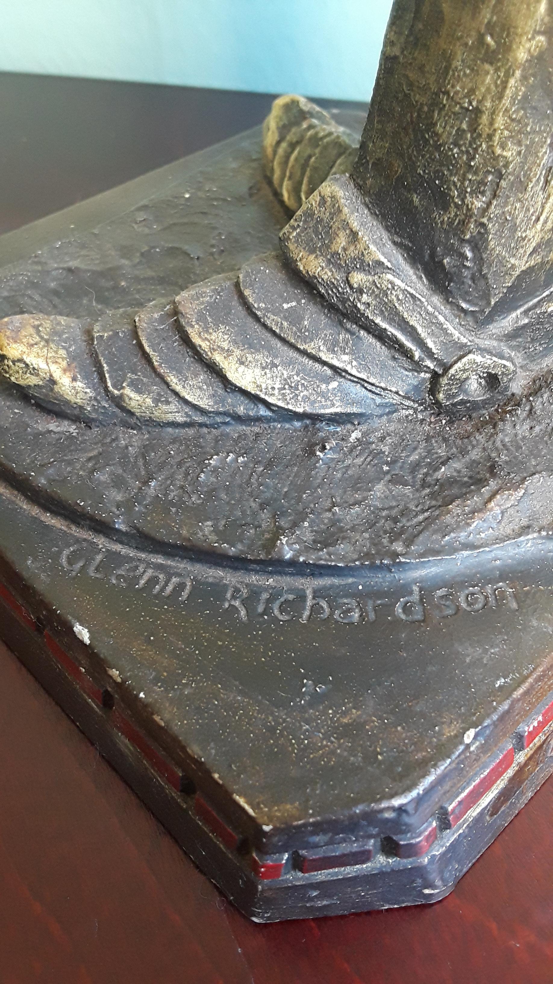 I was given this statue by my parents a few weeks ago, it was given to them by a retired Circus owner. Don't really know much about its history, my parents moved and it was to large to take and I kinda like it so it was given to me. It is made of wood and stands at 26" tall. It has been signed by Glen Richardson by the feet and what looks like ©Glenwood by Haeger carved in the side.