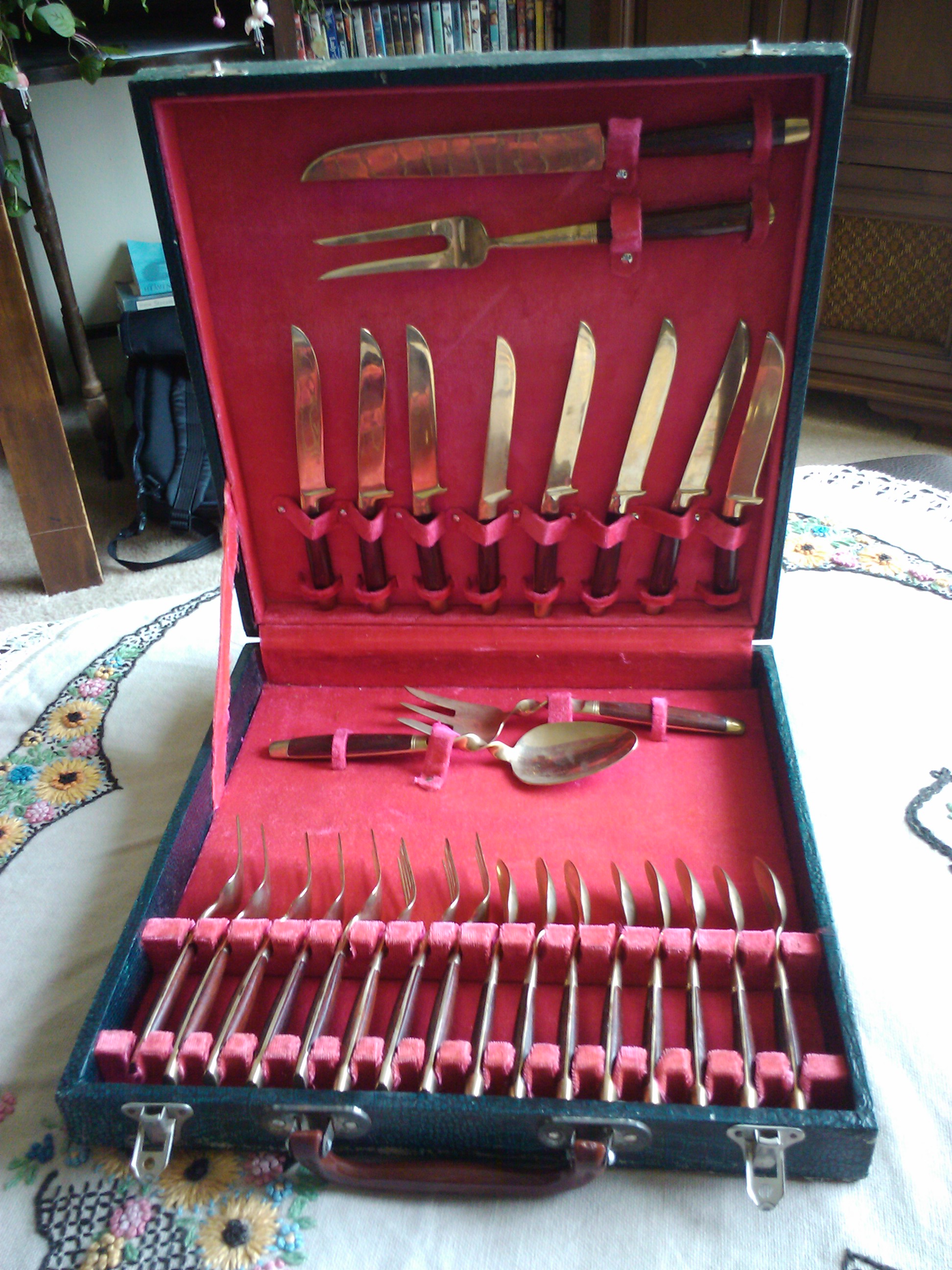 Re: 28 pc Brass/Inlaid Wood Flatware In Storage Box