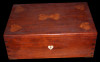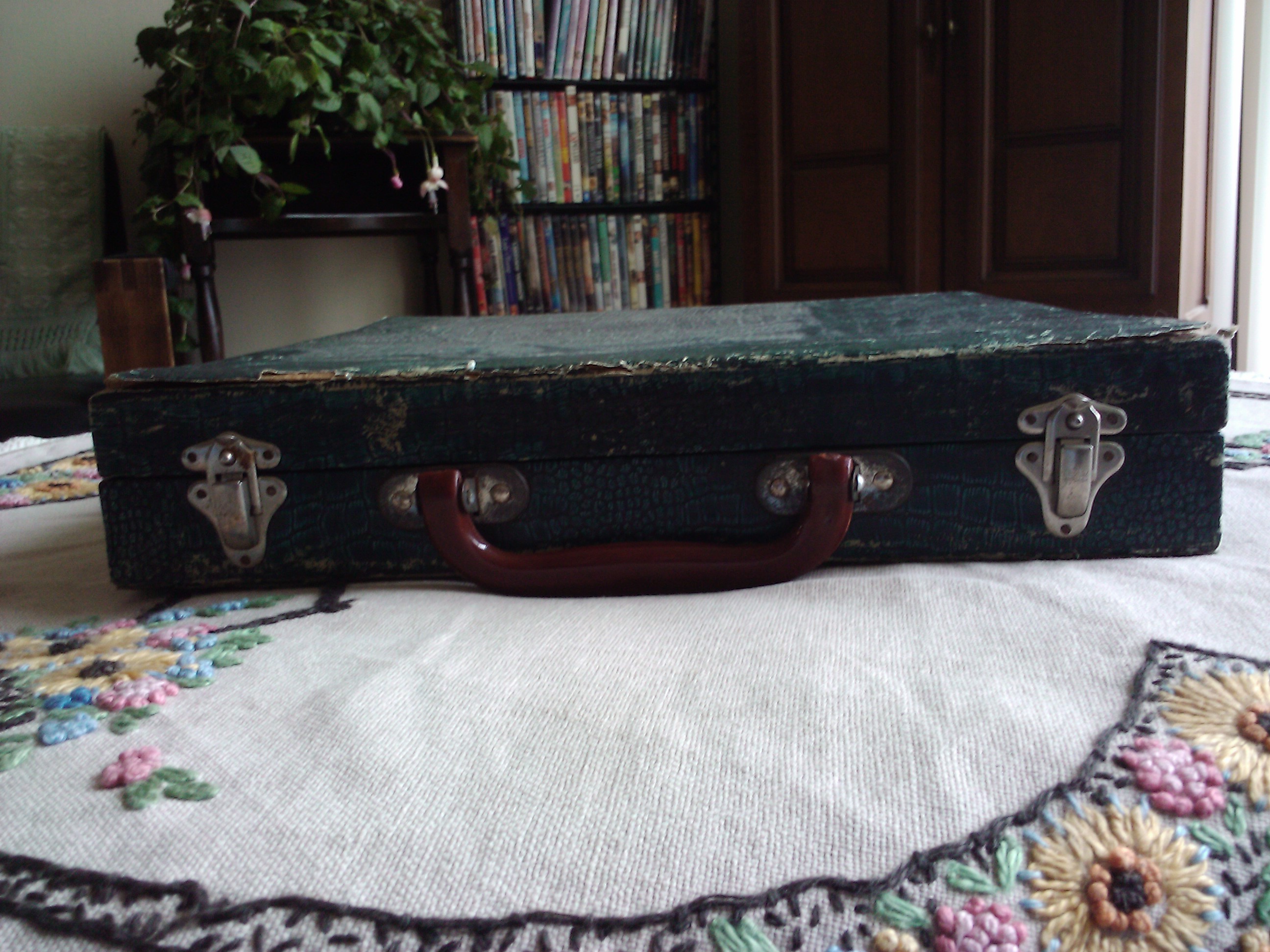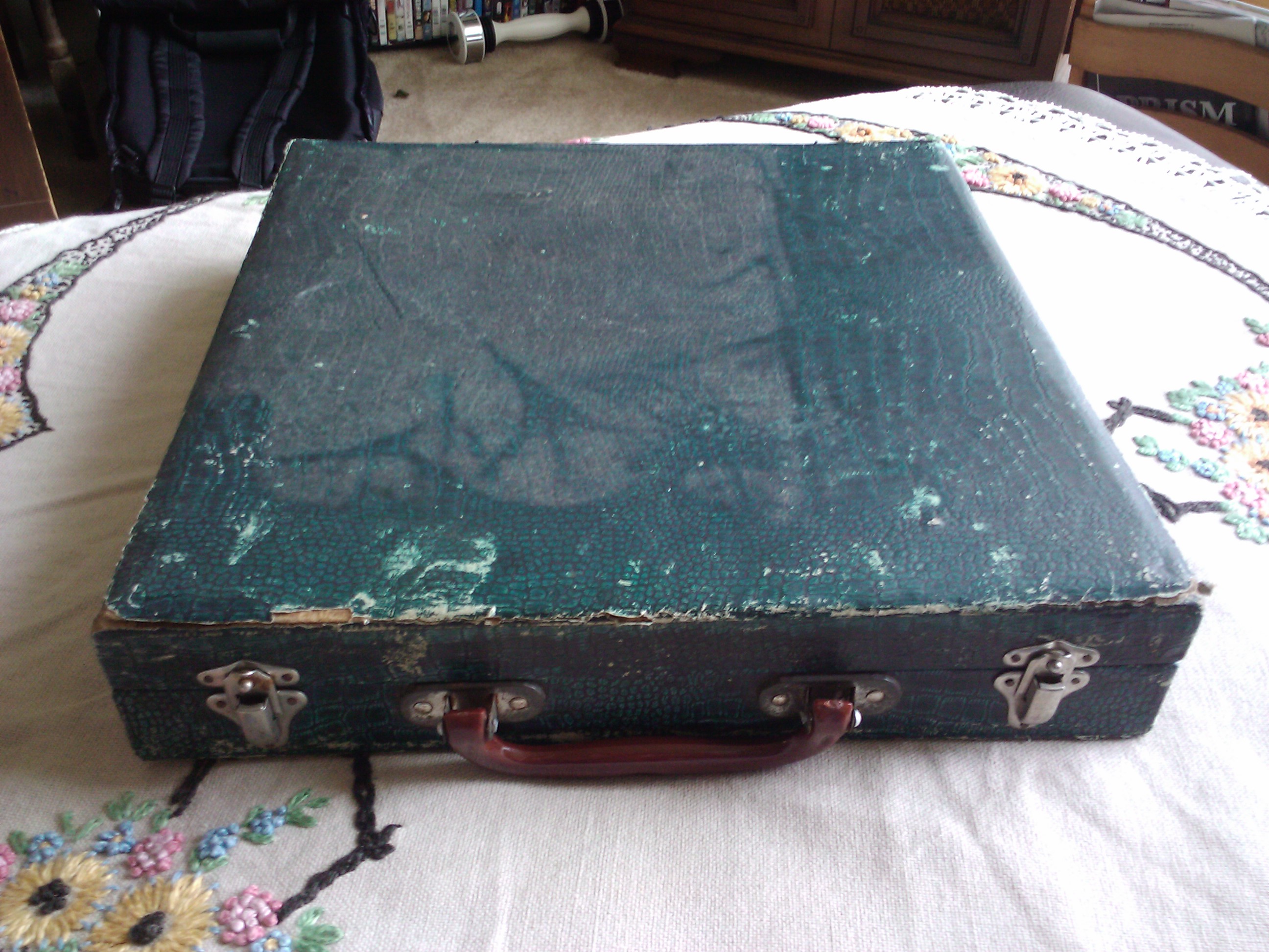 The 28 piece set includes place settings of knife, fork and spoon for eight, a two piece set consisting of meat knife and two prong fork and another set consisting of three prong fork and serving spoon. These last two pieces have twisted handles from the base of the spoon/fork down to the beginning of the handle. All pieces are intact and though some wear, no pieces have scratches, dulled knives, chips or bends.The wood in all pieces are smooth with no chips or cracks and all the rivets are intact. The outside of the box has a green reptile looking covering that shows some wear, but there are no major tears or missing pieces. the box itself is intact. The latches, hinges and handle are all in working order with no cracks, dents, or chips. The handle appears to be plastic, reminiscent of bakelite. The interior red velvet is well attached to the box and has no tears. The velvet when the spoon and forks slide into the bottom holders are a bit worn but still adhered. One person I spoke with from a local antique store thought it was from Vietnam, but could not give me much more information. I have had a couple of people who think the wood was cherrywood or rosewood. Could find no markings either in/on the box or on the individual pieces. Any information as to its history (or even where to begin to research) and its value would be great!