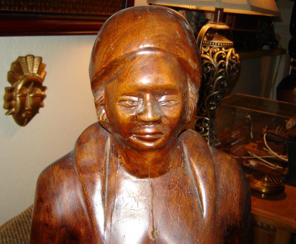 I have no idea where this came from. It might be Indonesian or some place in Asia or the South Pacific. Not sure what kind of wood it is; it's heavy though. Maybe mahagony (altough mahagony is darker). At first I thought this was a man but the figure appears to have has breasts. Just not sure at all. In one hand it's holding a fish. You can see in the pic that there's a crack down the front but it's not deep at all. There's no identifying mark or signature anywhere on the piece including the bottom. I haven't cleaned/polished it yet. Appreciate any info about this piece e.g., where it's from, value and age.