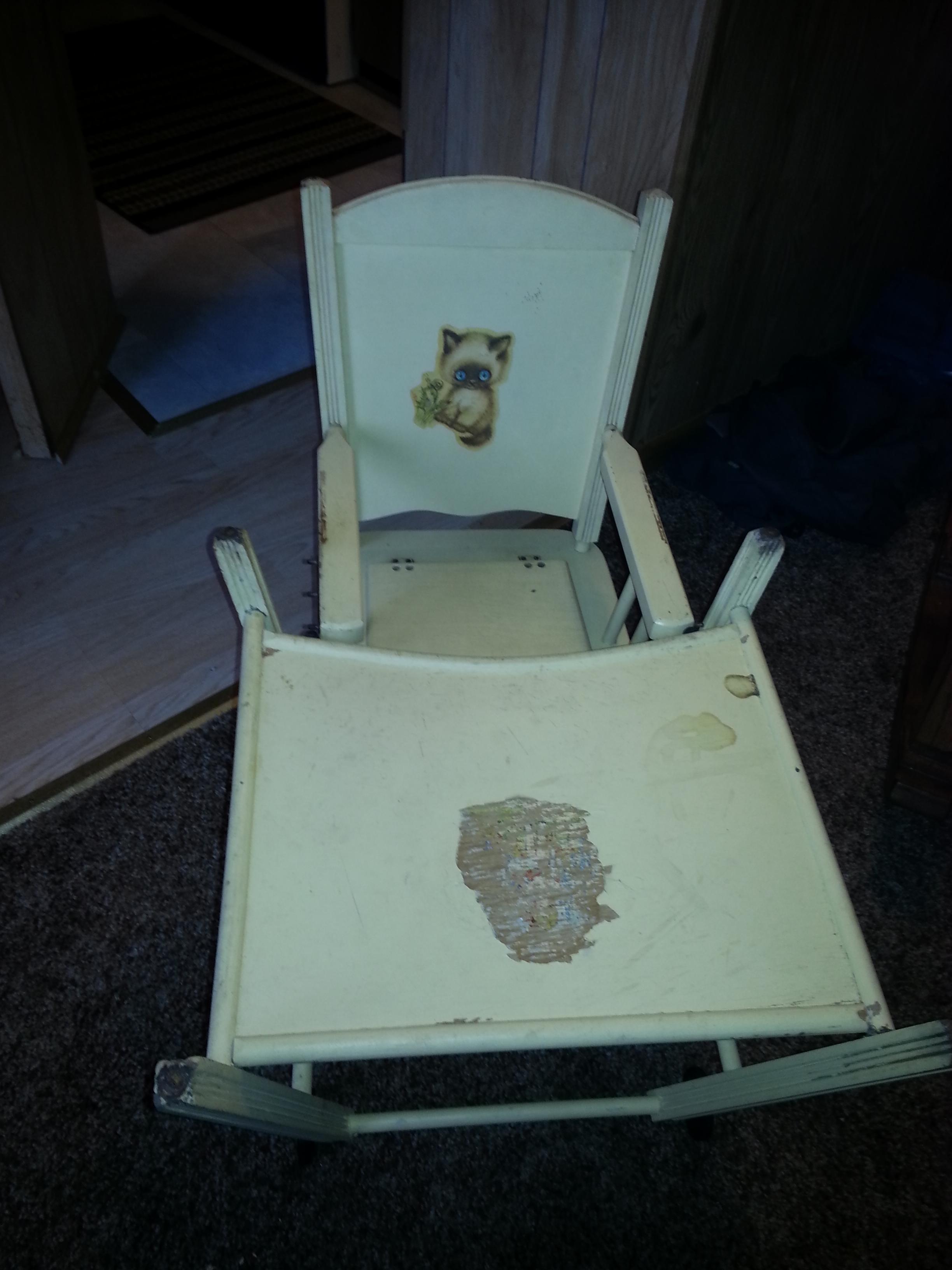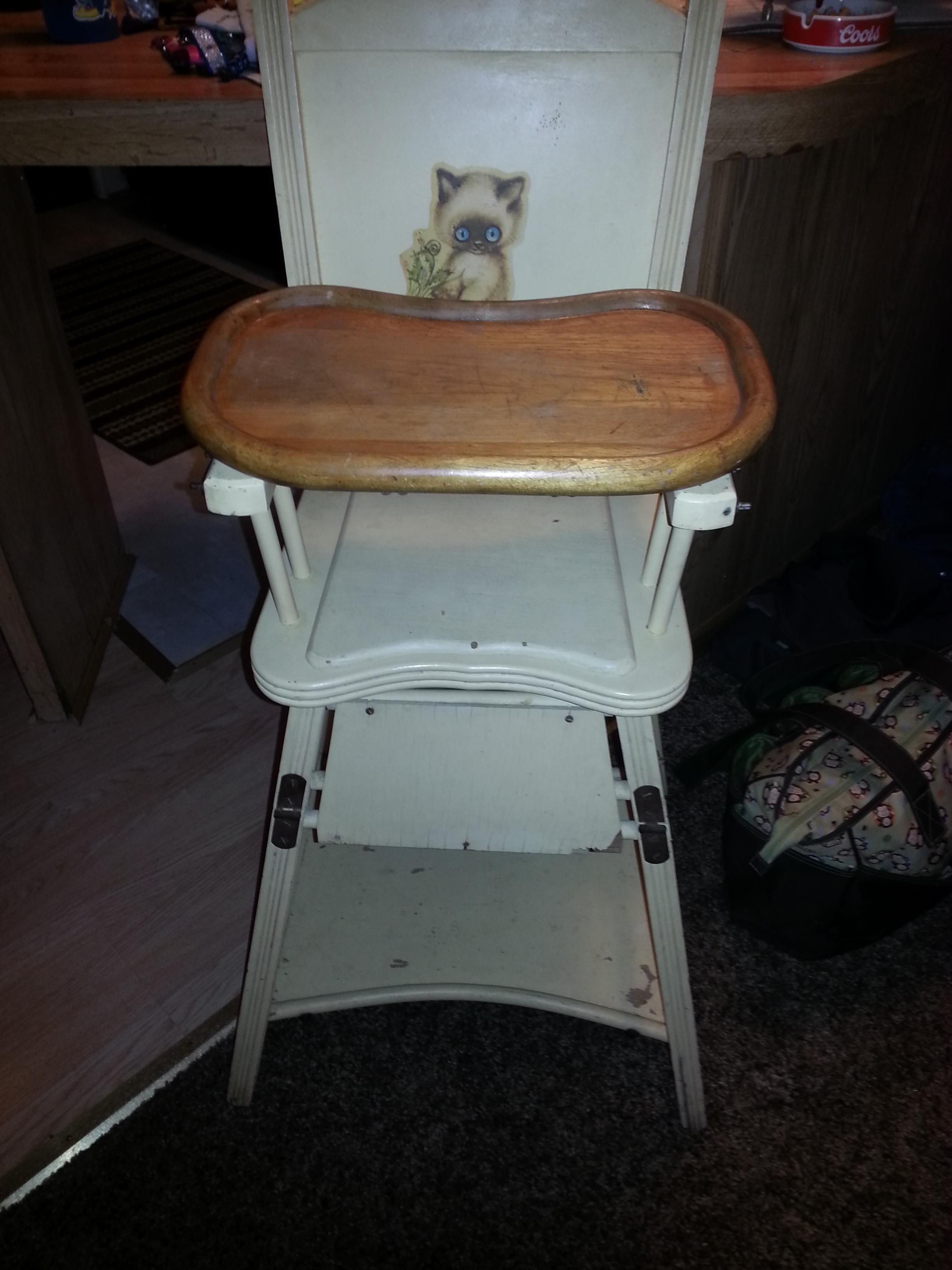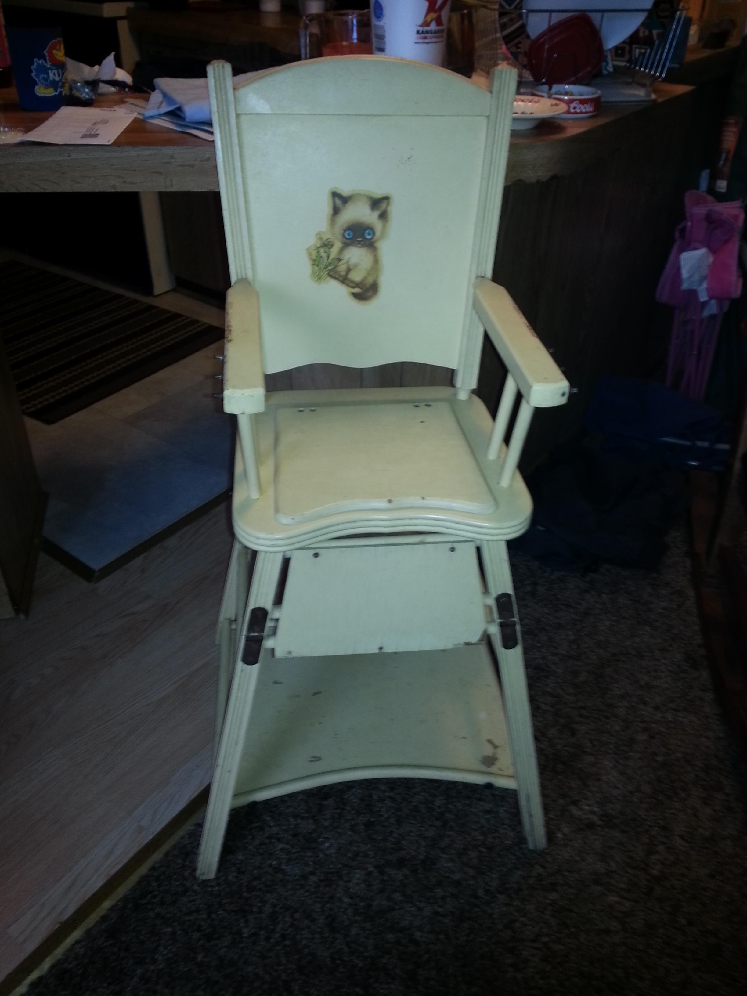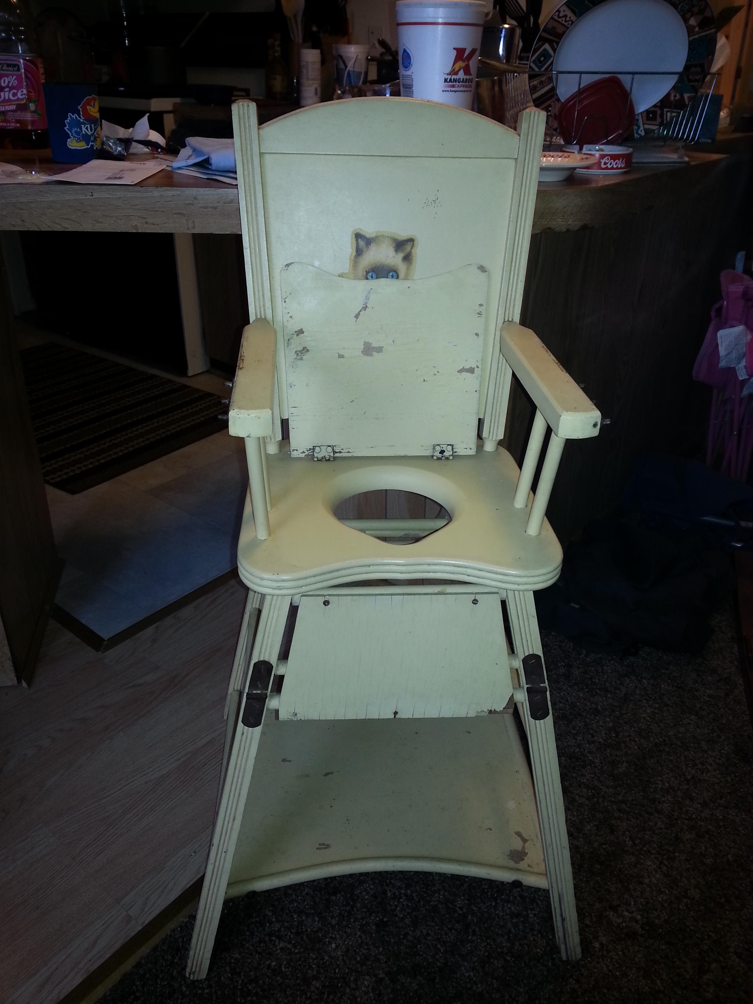I have an antique high chair that I found at a garage sale, it is a 3 in 1.  It is a highchair, potty chair, and an activity table.  I believe that it was made by the Williamsberg Chair Factory in Williamsberg, Ohio. The factory closed in the 1950's or 1960;s.