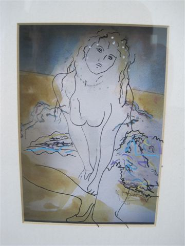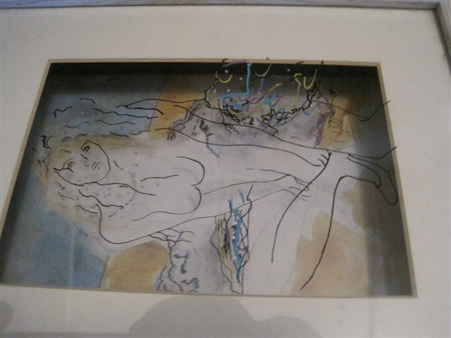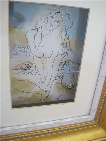 then the next peice is glass with the outline of a woman (her face, hair, breast, mountains and her right arm) Then the top peice of glass is partly outline of her hair, her left arm, legs (one with the shoe) this is really hard to photograph.